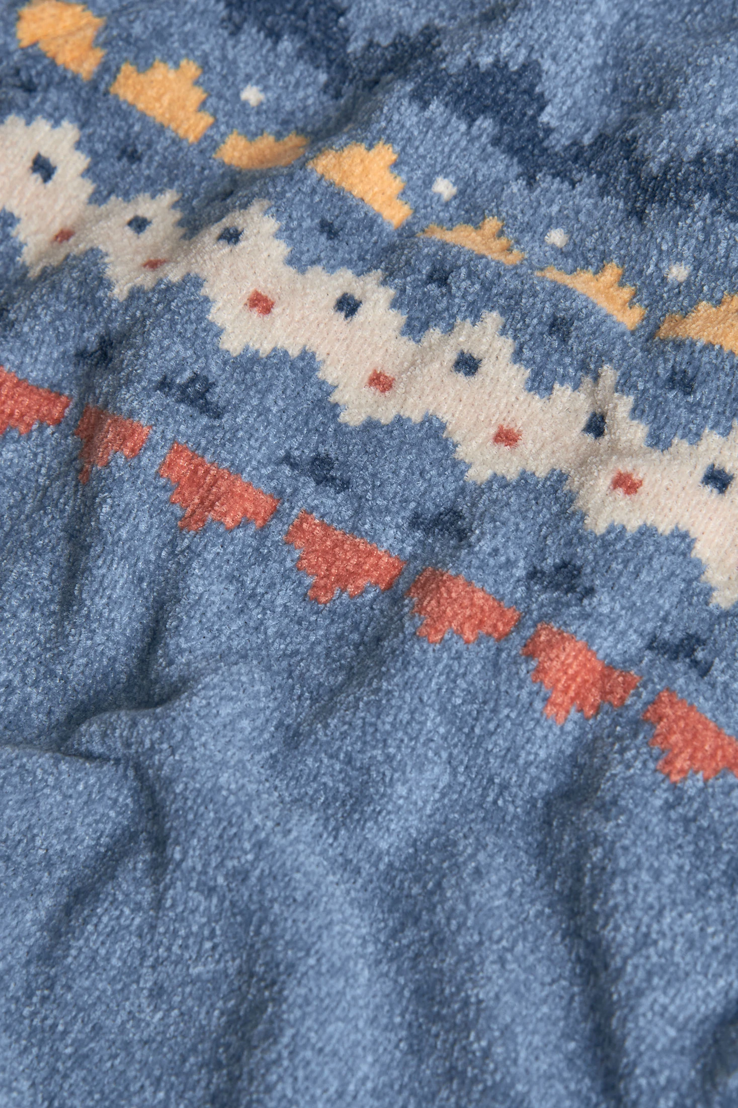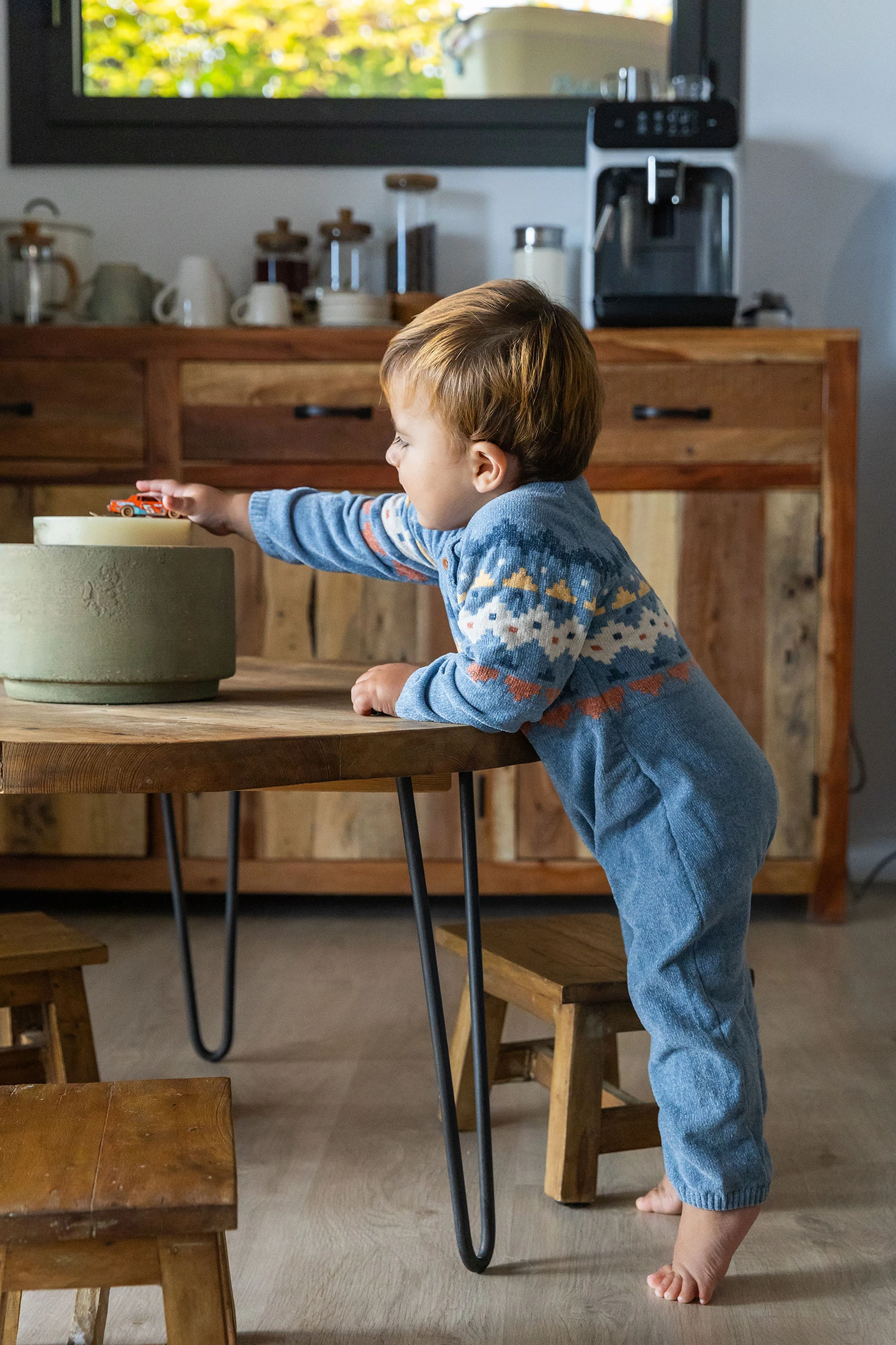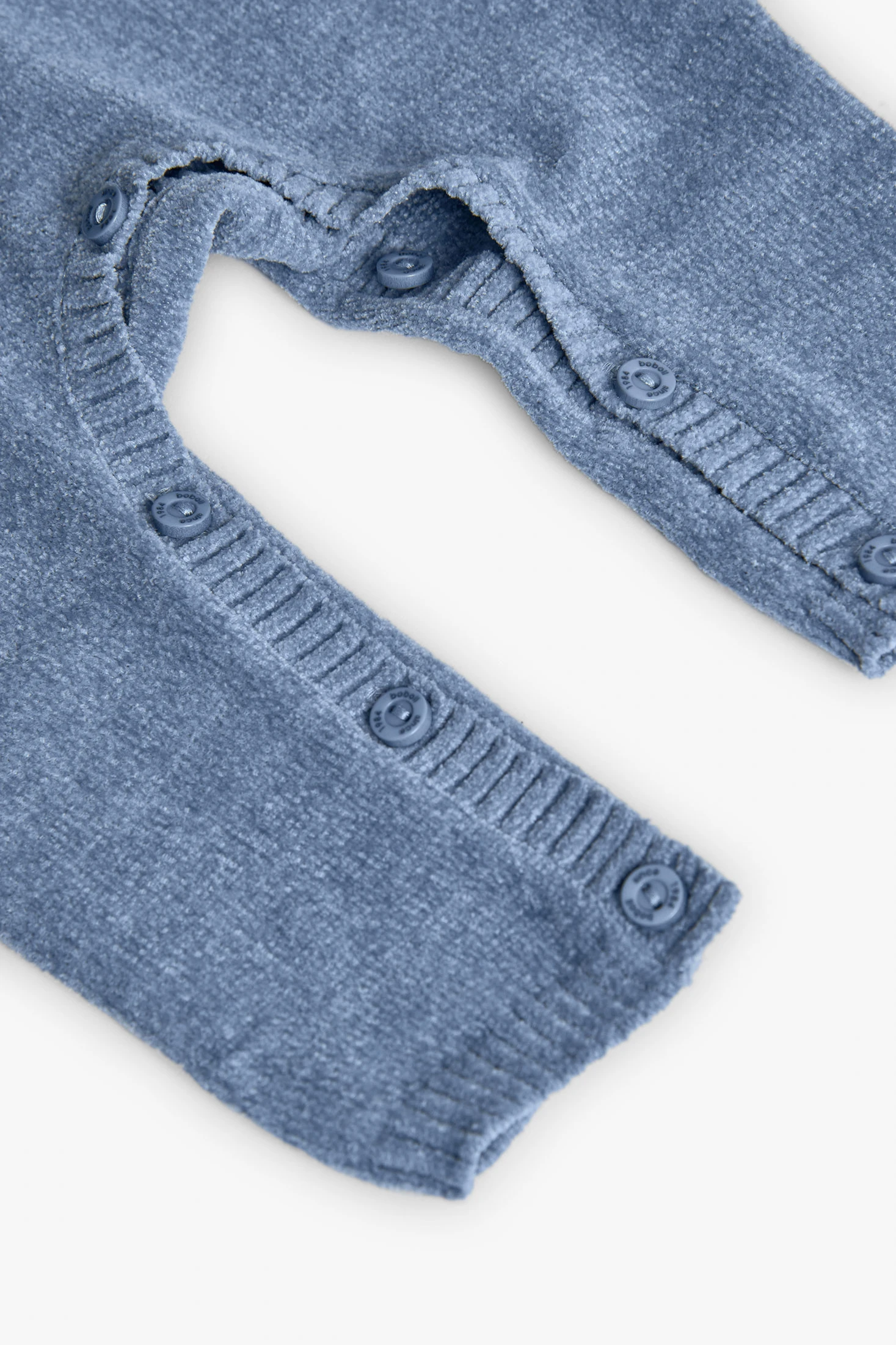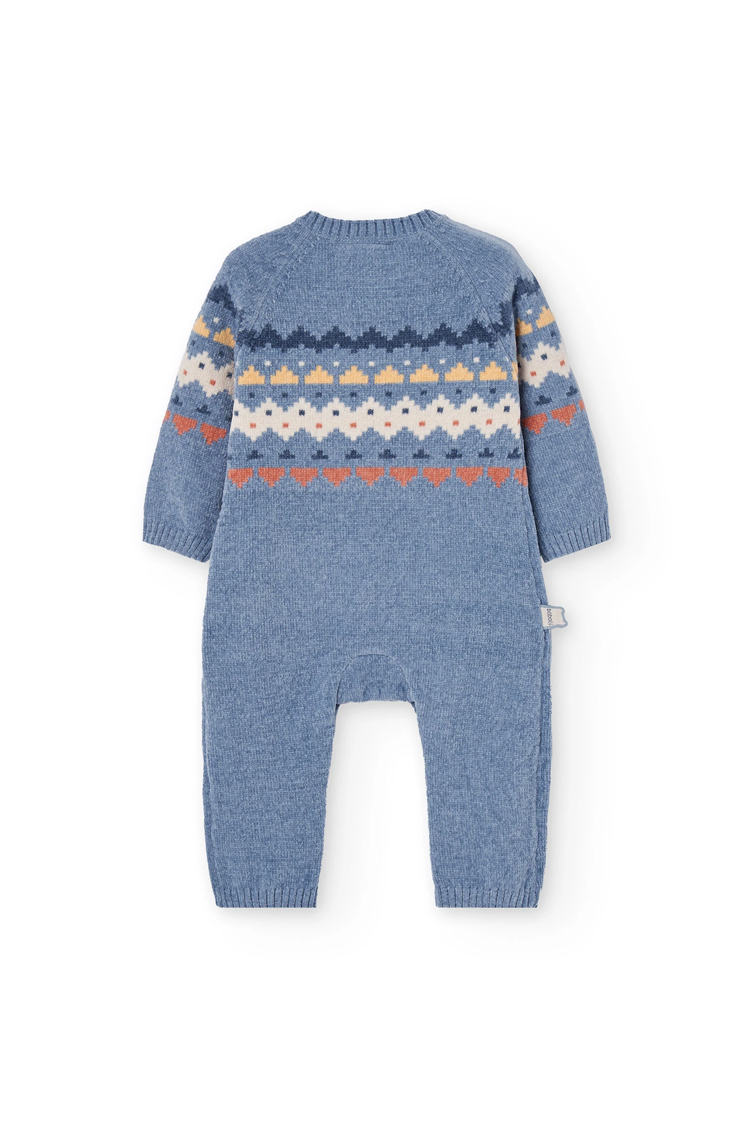 Gestrickter Baby-Strampler in Blau mit mehrfarbigem Jacquard, perfekt, um Ihr Kleines während der kalten Monate warm zu halten. Erhältlich in Größen von 1 Monat bis 2 Jahren, bietet er eine bequeme Passform, die sich dem Wachstum des Babys anpasst. Sein Design in neutralen Tönen und weichen Mustern verleiht einen eleganten und modernen Touch, passend für jeden Anlass. Hergestellt aus einem warmen und gemütlichen Strickstoff, ideal für den Winter. Mit praktischen Knopfverschlüssen an der Schulter und zwischen den Beinen, die das Windelwechseln erleichtern. Lange Ärmel sorgen dafür, dass Ihr Baby jederzeit bequem und