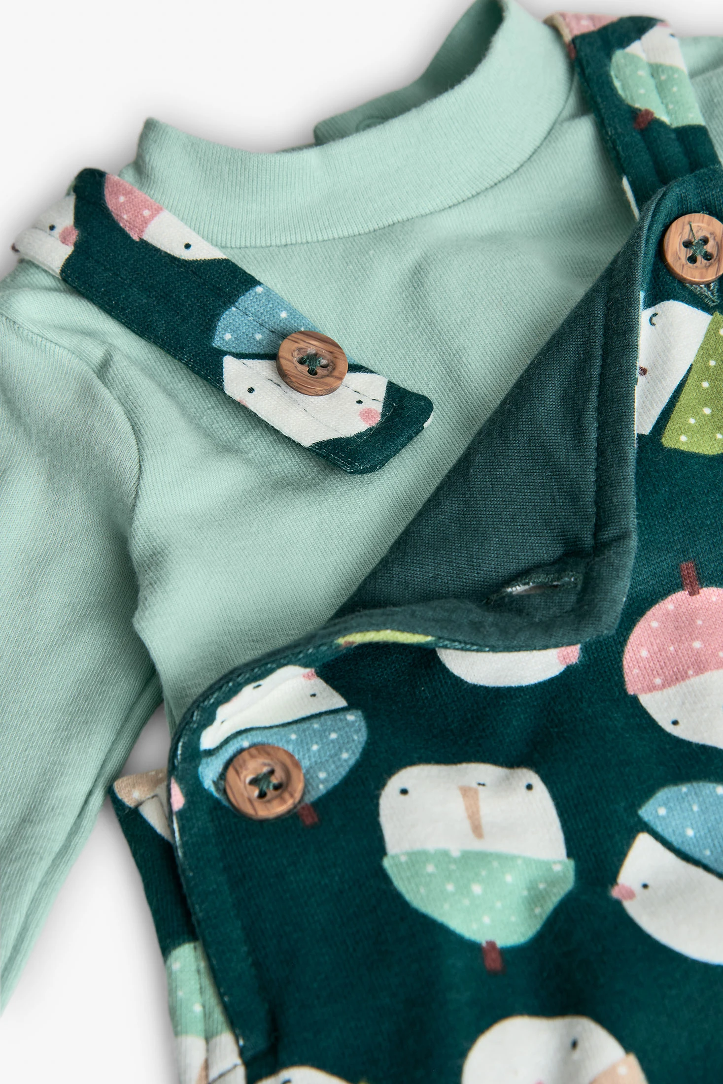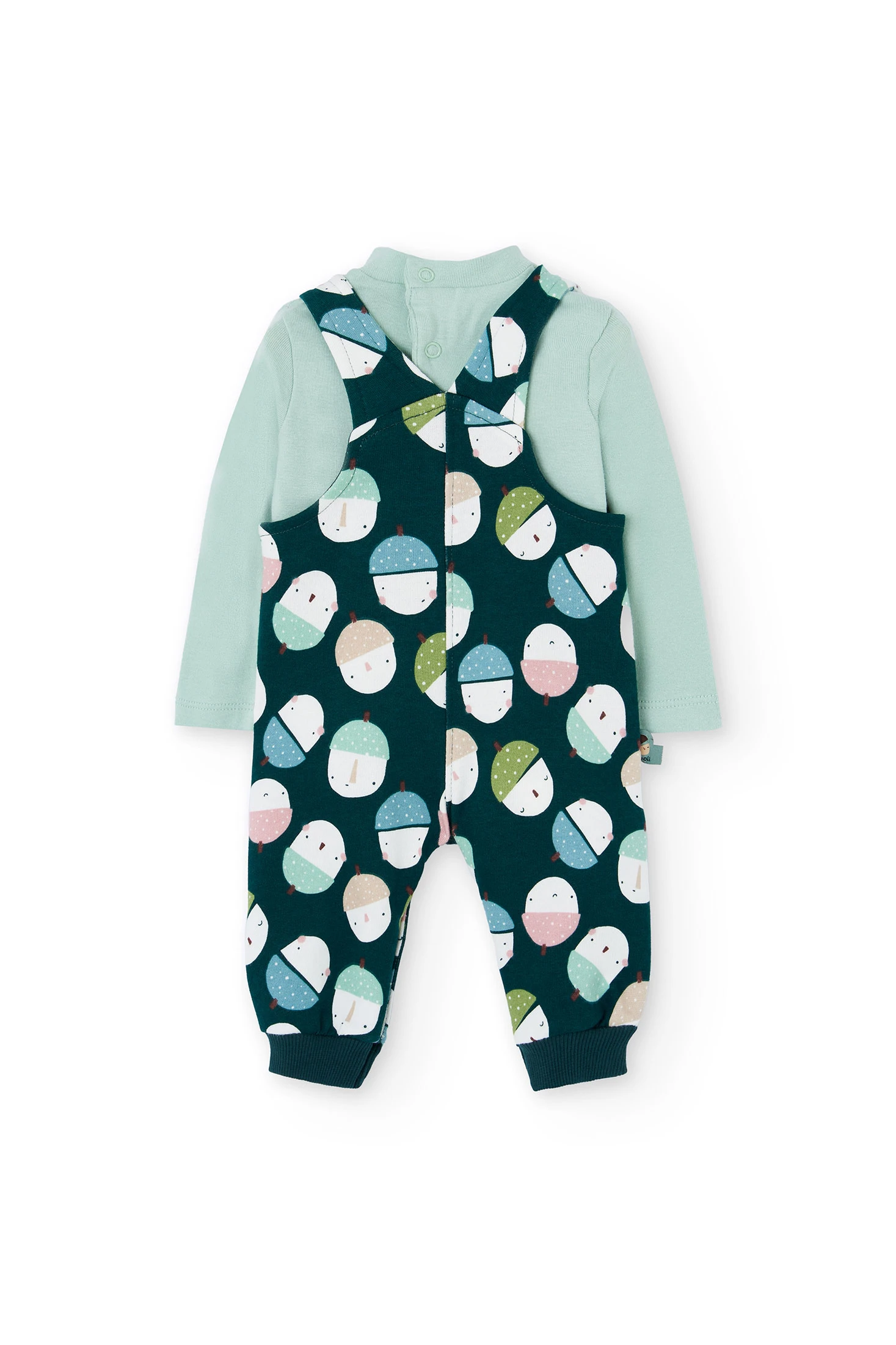 Strickset für Babys in Hellgrün, bestehend aus einem langärmeligen Body und einem Strampler mit lächelndem Eichelmuster. Hergestellt aus weicher Baumwolle, ist es ideal, um Ihr Baby in der kühleren Jahreszeit bequem und warm zu halten. Die dekorativen Knöpfe an den Trägern des Stramplers verleihen ein charmantes und praktisches Detail und erleichtern das Anziehen. In mehreren Größen erhältlich, lässt es sich leicht mit Strickschühchen oder leichten Jacken für einen kompletten und niedlichen Look kombinieren.
