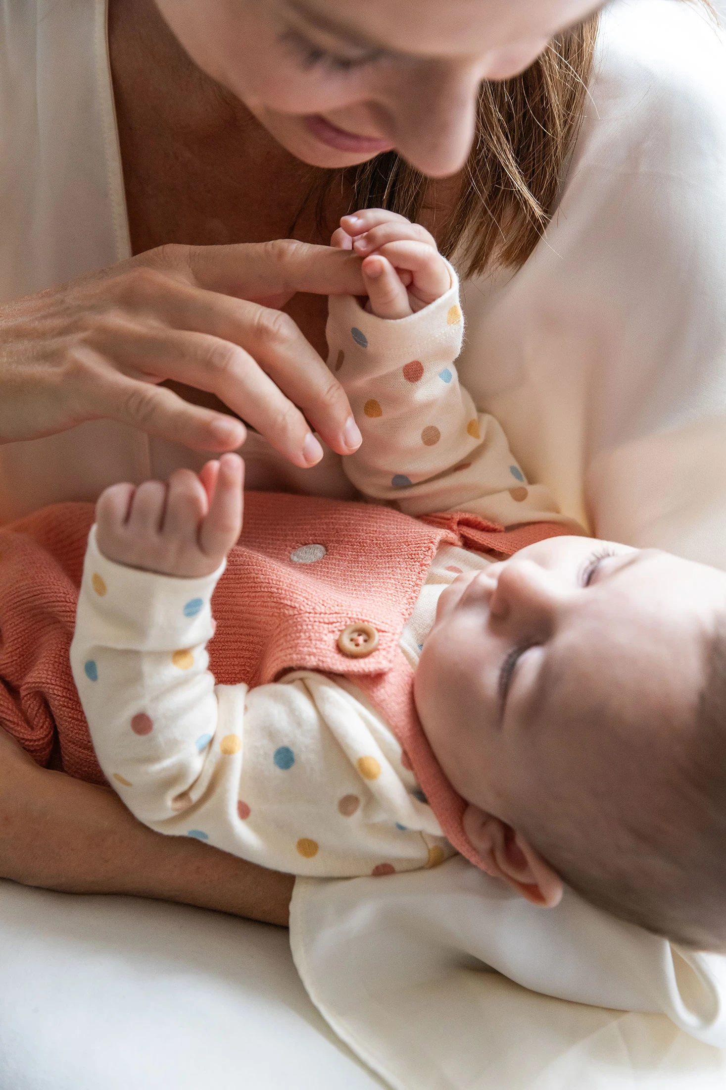 Gepunkteter Baby-Body, ein wesentliches Kleidungsstück für jede Jahreszeit, bietet Komfort und Stil für die Kleinsten. Aus weichem Rippstrick-Baumwolle gefertigt, macht sein gepunktetes Design ihn bezaubernd und perfekt kombinierbar mit Hosen oder Röcken für einen vollständigen Look. In verschiedenen Größen erhältlich, verfügt dieser Body über Druckknöpfe, um den Windelwechsel zu erleichtern. Ideal, um als Zwischenschicht im Winter oder als Hauptkleidungsstück im Sommer getragen zu werden, gewährleistet er höchsten Komfort und Bewegungsfreiheit für dein Baby.