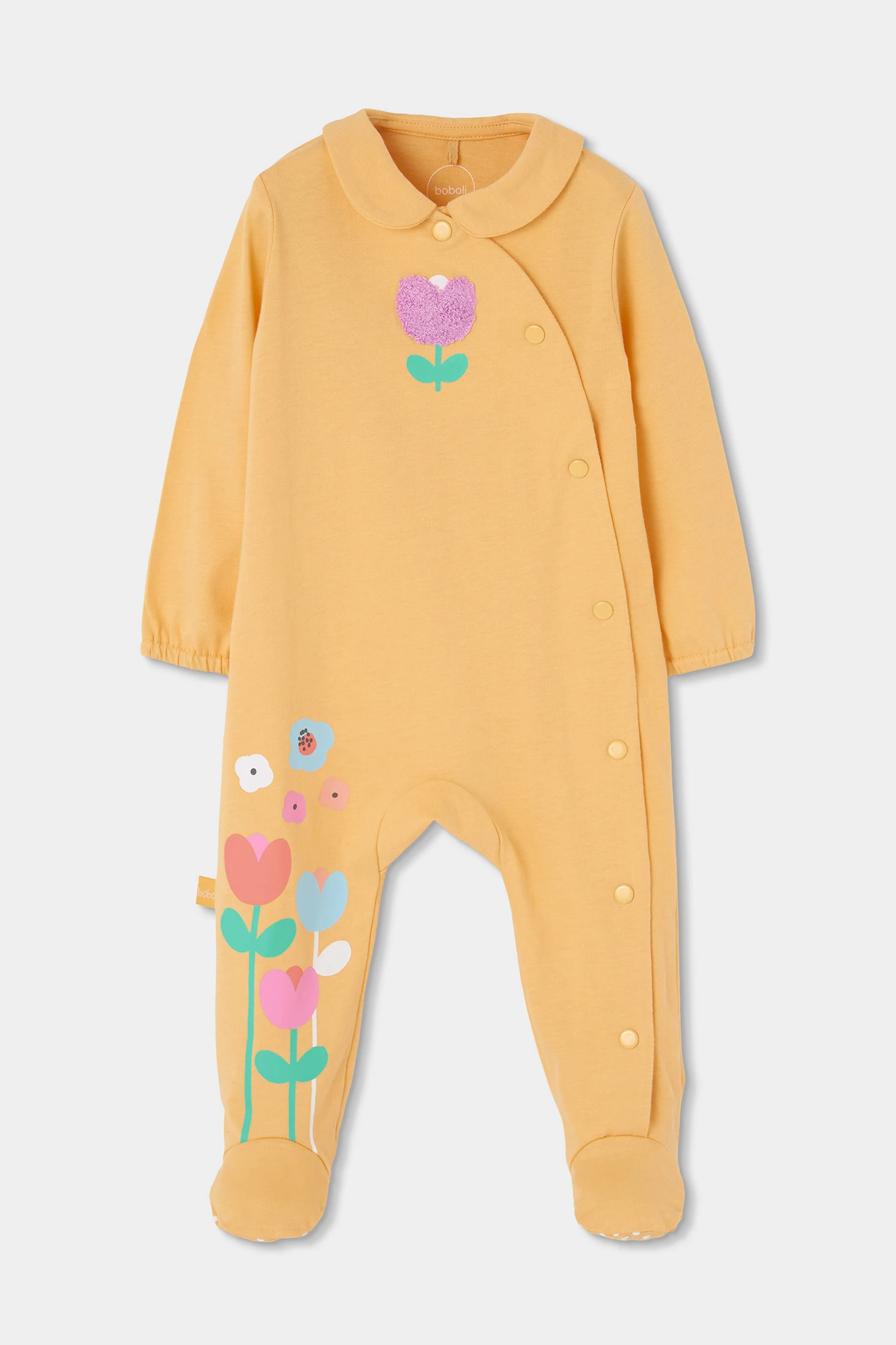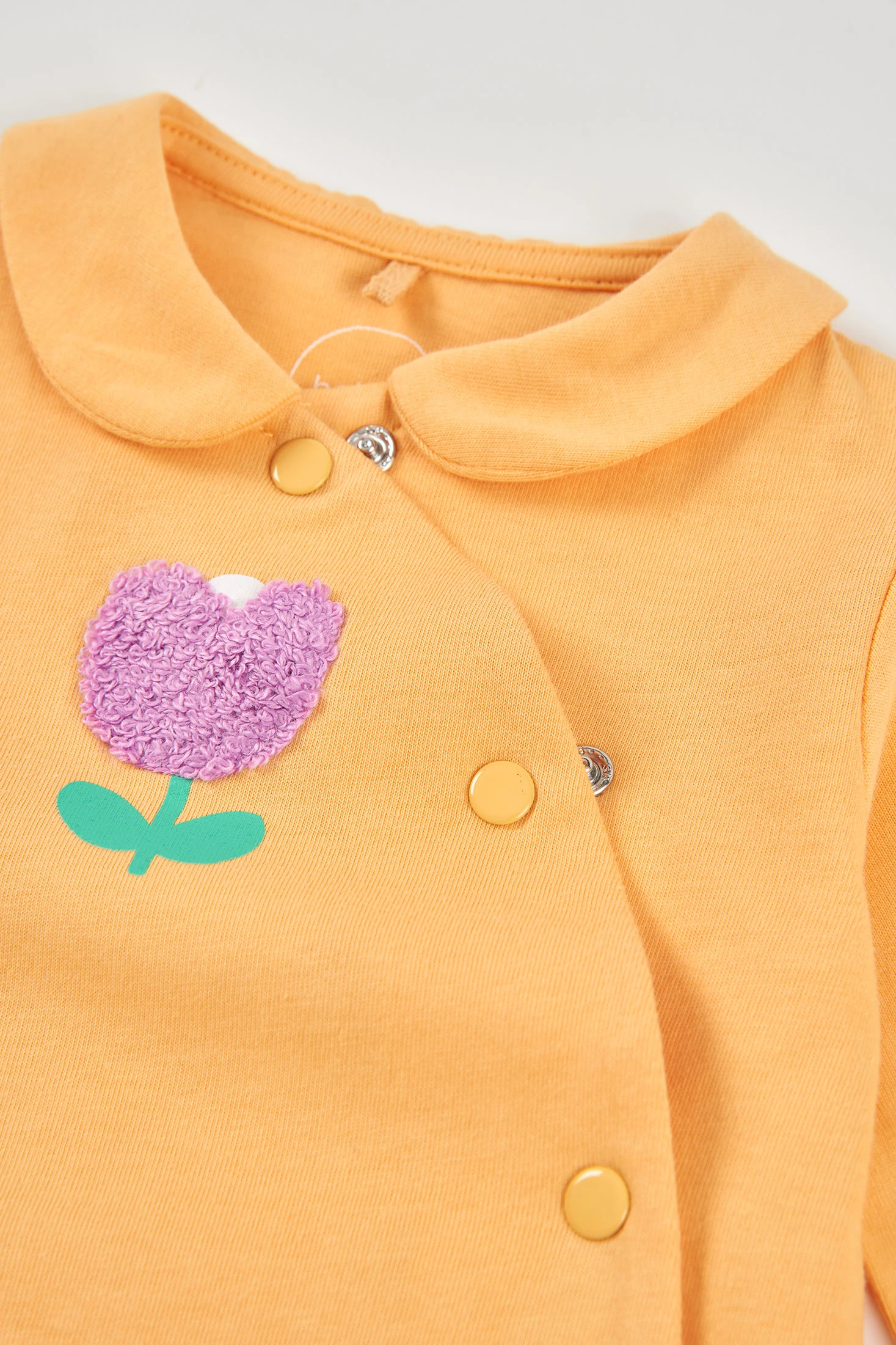 Baumwoll-Strampler für Baby-Mädchen, ideal, um sie bequem und warm zu halten. Erhältlich in Größen von 0 Monaten bis 24 Monaten, passt sich dem Wachstum Ihres Babys an. Die leuchtend gelbe Farbe ist mit einem charmanten Blumendesign verziert, das einen Hauch von Süße verleiht. Es hat lange Ärmel und einen Druckknopfverschluss, der den Windelwechsel erleichtert. Ein praktisches und stilvolles Kleidungsstück für die kühleren Tage.