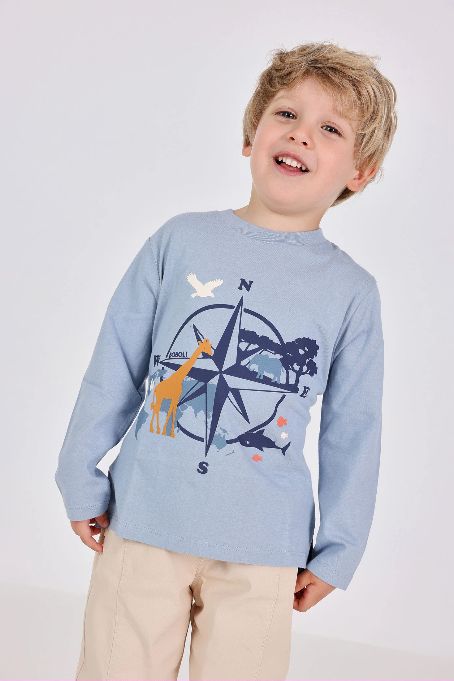 Graues Baumwoll-T-Shirt für Jungen, verziert mit einem Kompass-Design und Tieren wie Giraffen, Vögeln und Fischen, ideal für die Herbst- und Wintersaison. Hergestellt aus weichem Strickstoff, verfügt es über lange Ärmel und einen Rundhalsausschnitt, der Komfort und Wärme bietet. Erhältlich in Größen von 12 Monaten bis 10 Jahren, ist es ein vielseitiges Kleidungsstück, das sich problemlos mit Jeans oder Sporthosen für einen lässigen und abenteuerlichen Stil kombinieren lässt.