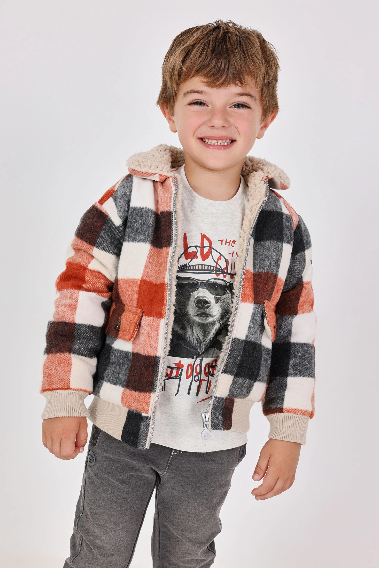 Strickjacke für Jungen mit Karomuster, ideal für die Herbst- und Wintermonate. Hergestellt aus warmen und weichen Materialien, zeigt sie ein klassisches Muster in Braun-, Schwarz- und Weißtönen, das Stil und Komfort garantiert. Der Teddykragen verleiht einen gemütlichen und raffinierten Touch, während der Reißverschluss die Handhabung erleichtert. Mit langen Ärmeln gestaltet, bietet sie effektiven Schutz vor Kälte. Erhältlich in den Größen von 12 Monaten bis 10 Jahren, ist diese Jacke ein vielseitiges Kleidungsstück, das sich leicht mit Jeans oder Freizeithosen kombinieren lässt.