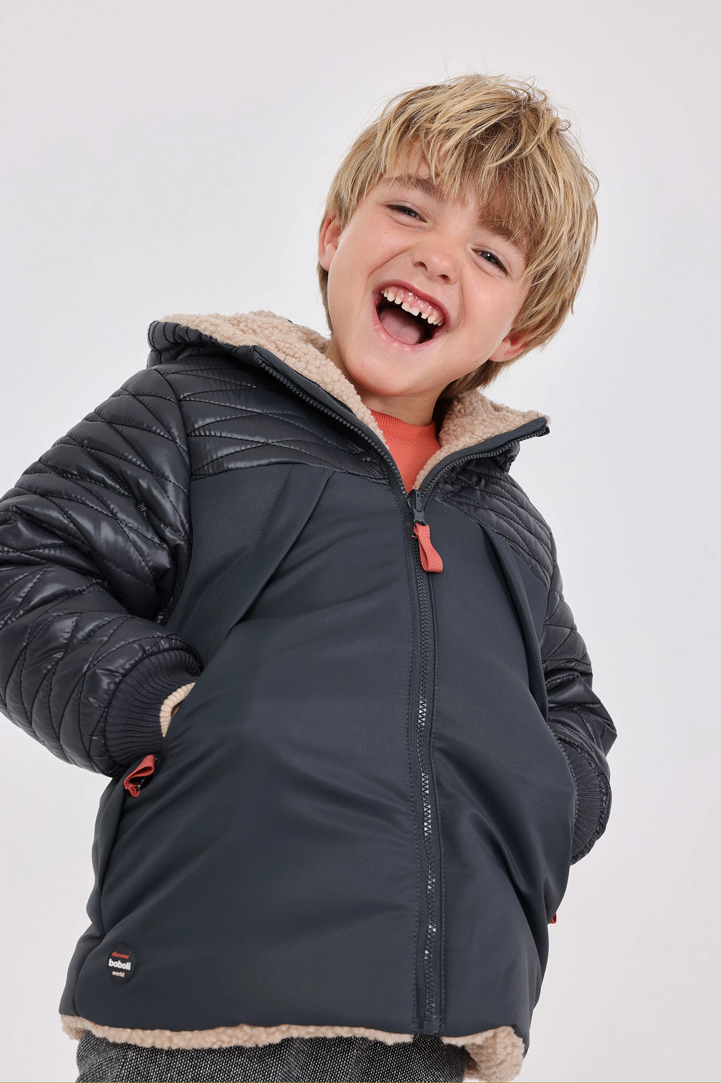 Reversible graue Parka aus Techno-Gewebe für Jungen, ideal für die kalten Monate, bietet Wärme und Schutz vor Wind. Hergestellt aus hochwertigen Materialien, bietet sie ein vielseitiges Design, das zwischen einer glatten grauen Seite und einer gesteppten Optik wechselt. Ausgestattet mit Kapuze und Reißverschluss für Komfort und einfache Handhabung. Erhältlich in Größen von 12 Monaten bis 10 Jahren, lässt sich dieses Kleidungsstück perfekt mit Hosen oder Latzhosen kombinieren und sorgt dafür, dass die Kleinen warm und stilvoll bleiben.