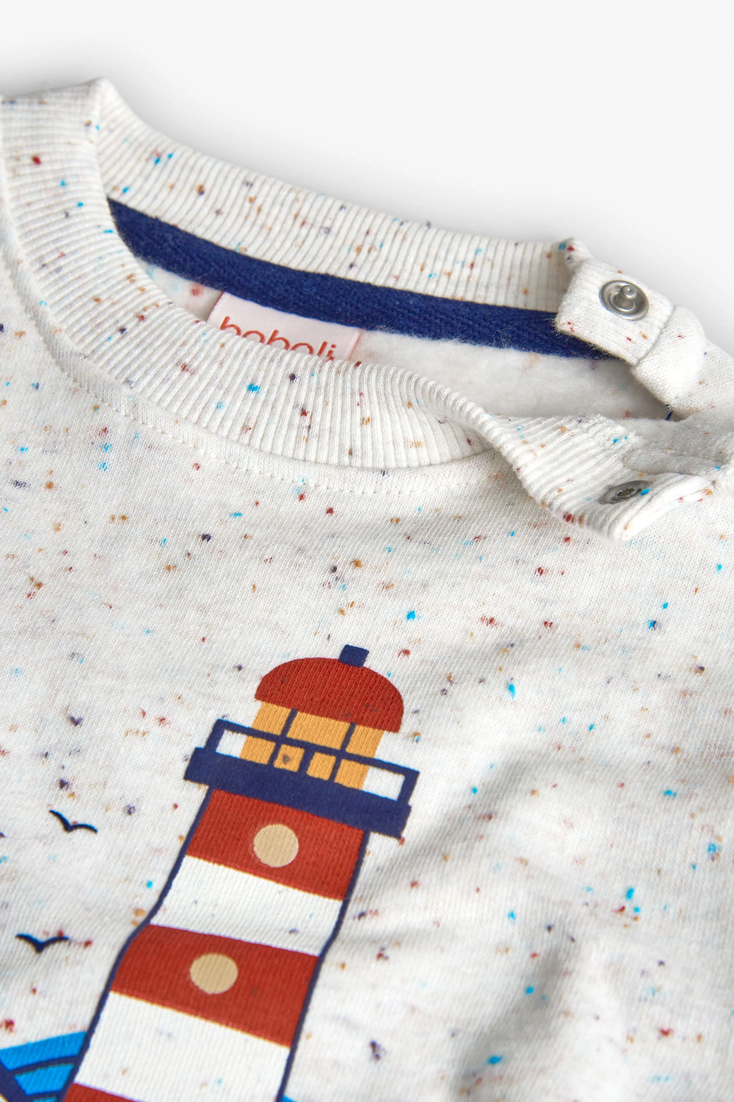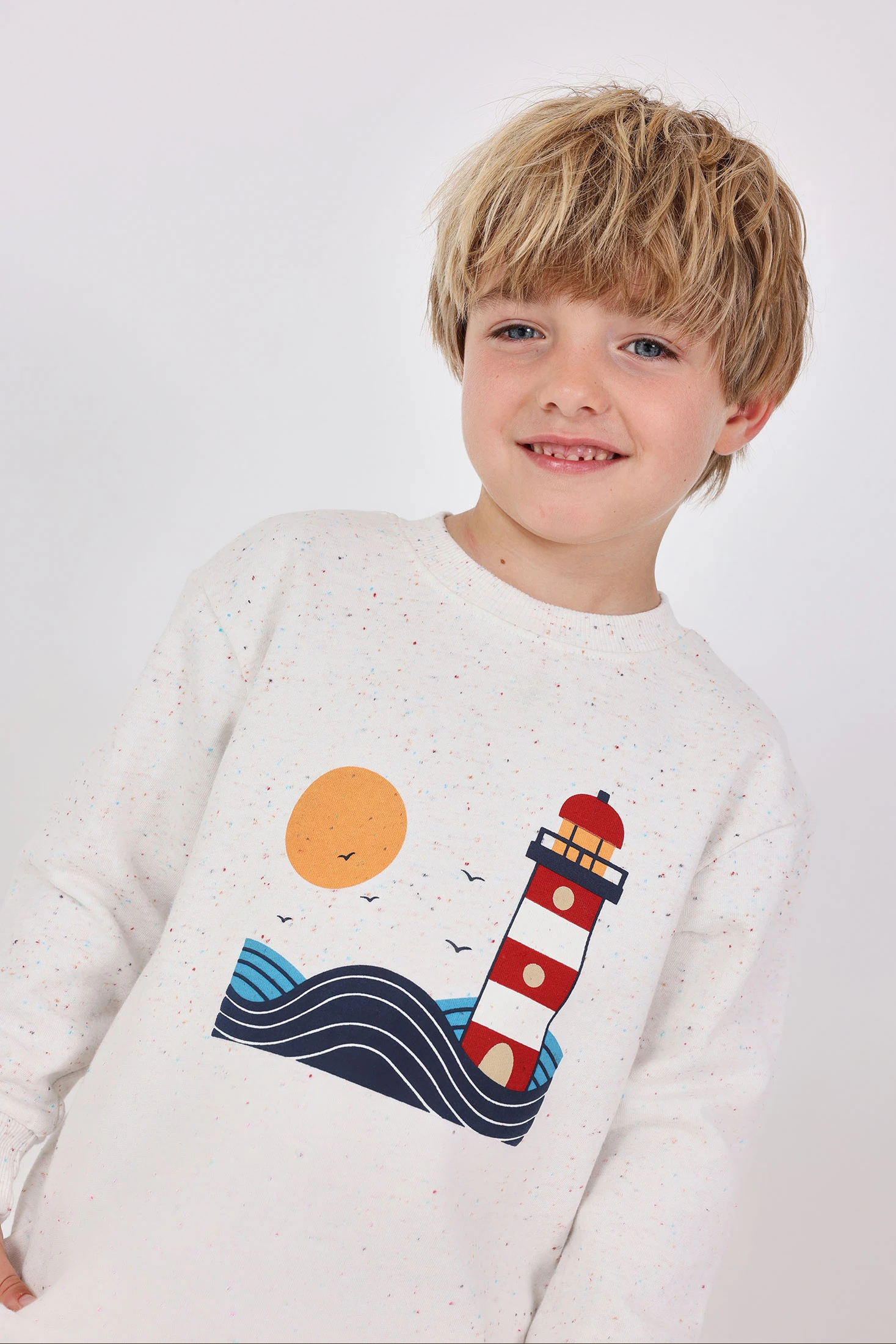 Fleece-Sweatshirt für Jungen in Weiß, entworfen, um Wärme und Komfort während Herbst und Winter zu bieten. Ein bezaubernder Druck eines Leuchtturms und einer Sonne verleiht der Kinderkleidung einen lustigen und originellen Touch. Der Rundhalsausschnitt und die langen Ärmel bieten Schutz an kalten Tagen, und es ist in Größen von 12 Monaten bis 10 Jahren erhältlich. Dieses vielseitige Kleidungsstück lässt sich leicht mit Jeans oder Hosen kombinieren und schafft einen lässigen und fröhlichen Look, der perfekt für jeden Anlass ist.