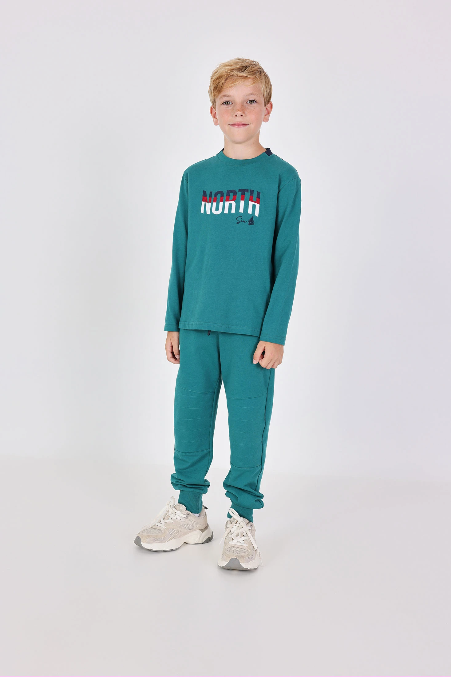 Baumwollhose für Jungen in einem raffinierten Grün mit navyblauen Details, ideal für die Herbst- und Wintersaison. Hergestellt aus hochwertigem Frottee, bietet sie Wärme und Komfort an kälteren Tagen. Ihr modernes Design passt sich leicht an lässige oder formalere Outfits an und lässt sich perfekt mit Sweatshirts oder T-Shirts kombinieren. Erhältlich in Größen von 2 bis 14 Jahren, ist sie eine praktische Wahl für den Alltag der Kleinen.