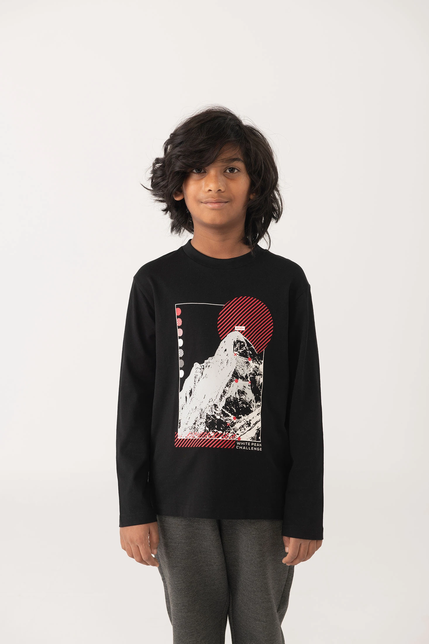 Schwarzes Baumwoll-T-Shirt für Jungen, ein essentielles Kleidungsstück für Herbst und Winter, gefertigt aus einem weichen und bequemen Stoff. Entworfen mit einem Bergmotiv, das einen abenteuerlichen Touch verleiht, ideal für kleine Entdecker. Die schwarze Farbe macht es zu einer vielseitigen Option, die sich leicht mit Jeans, Sporthosen oder Jacken kombinieren lässt. Erhältlich in Größen von 2 bis 14, ist dieses T-Shirt perfekt für den täglichen Gebrauch und gewährleistet Komfort und Stil den ganzen Tag über.