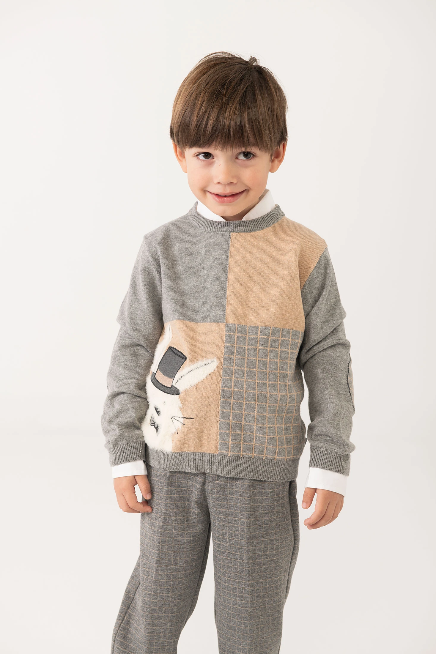 Strickpullover für Jungen in Grau, perfekt für die Herbst- und Wintersaison. Hergestellt aus einem weichen und warmen Stoff, präsentiert er ein charmantes Design in grau-beigen Farbblöcken, verziert mit einem Bild eines Kaninchens mit Zylinder und Fliege. Der Pullover hat einen Rundhalsausschnitt und lange Ärmel, sodass Ihr Kind an kälteren Tagen gut gewärmt ist. Erhältlich in Größen von 12 Monaten bis 10 Jahren. Ideal, um ihn mit Hosen oder Jeans zu kombinieren und einen lässigen und bequemen Stil für jede Gelegenheit zu bieten.