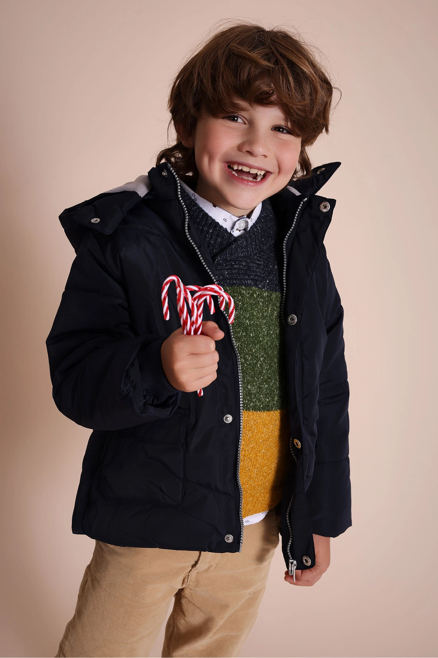 Technischer Parka für Jungen in Marineblau, ideal für die niedrigen Temperaturen im Herbst und Winter. Hergestellt aus hochwertigem Isoliermaterial, das jederzeit Wärme und Komfort gewährleistet. Inklusive einer abnehmbaren Kapuze, die zusätzlichen Schutz vor Wind bietet, sowie zwei praktischen Fronttaschen. Verfügbar in Größen von 12 Monaten bis 10 Jahren, kombiniert er Stil und Funktionalität und eignet sich perfekt, um Ihren Kleinen bei seinen Outdoor-Aktivitäten warmzuhalten.