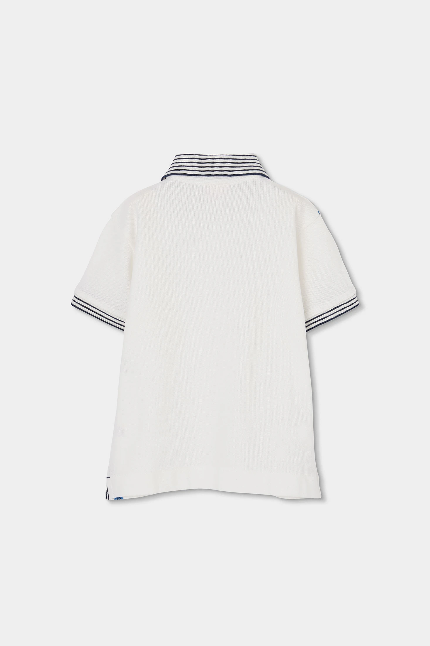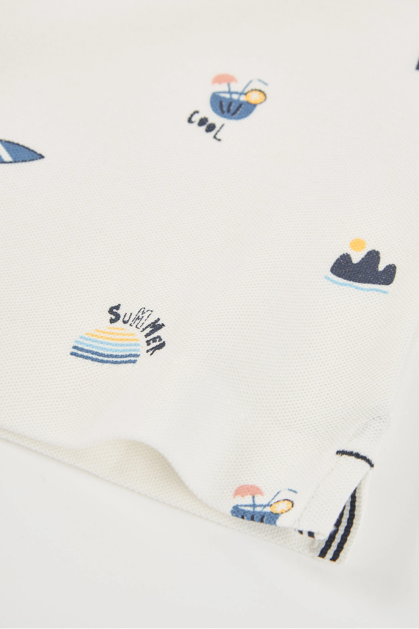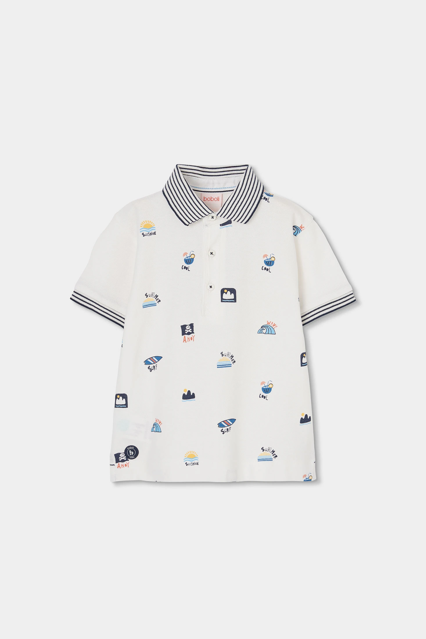 Piqué-Polo für Kinder, ideal für die Frühlings-Sommer-Saison, präsentiert sich in klassischem Weiß. Verziert mit kleinen Drucken, die nautische und sonnige Elemente beinhalten, verleiht es dem Outfit einen Hauch von Spaß. Kragen und Ärmel sind mit einem Streifenmuster versehen und bieten ein elegantes Finish. Erhältlich in Größen von 12 Monaten bis 10 Jahren. Perfekt kombinierbar mit kurzen Hosen oder Jeans, ist dieses Polo eine vielseitige und bequeme Wahl für den Alltag. Hergestellt aus Baumwolle garantiert es Frische und Sanftheit im Hautkontakt.