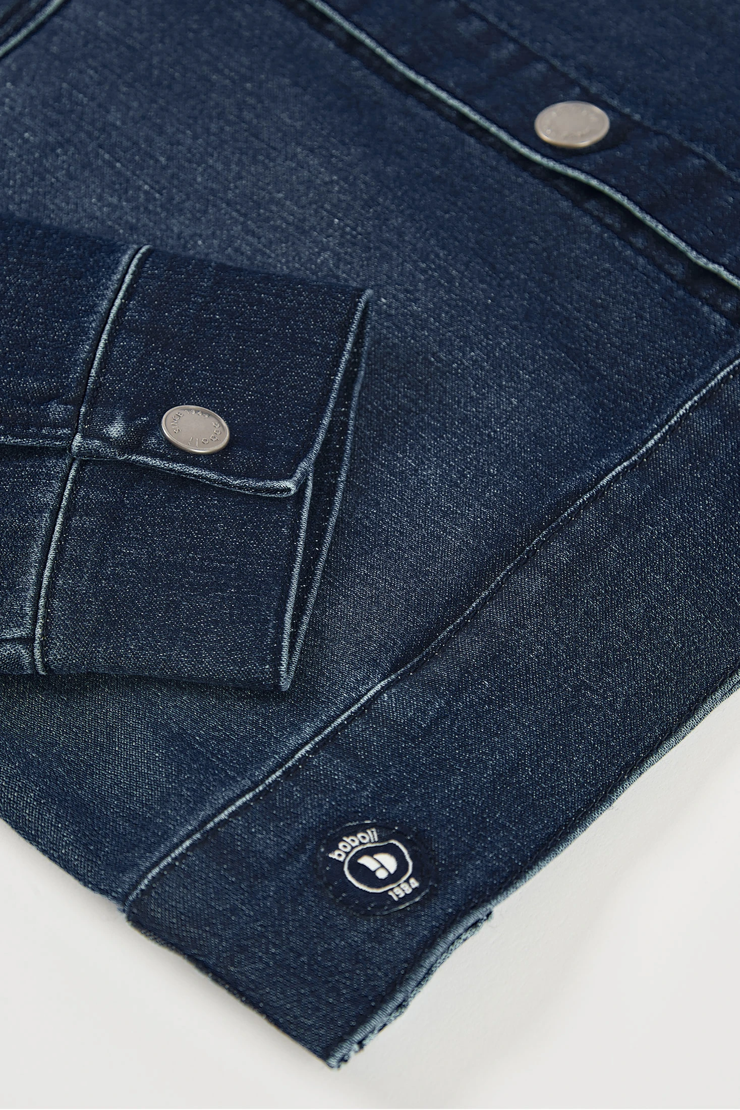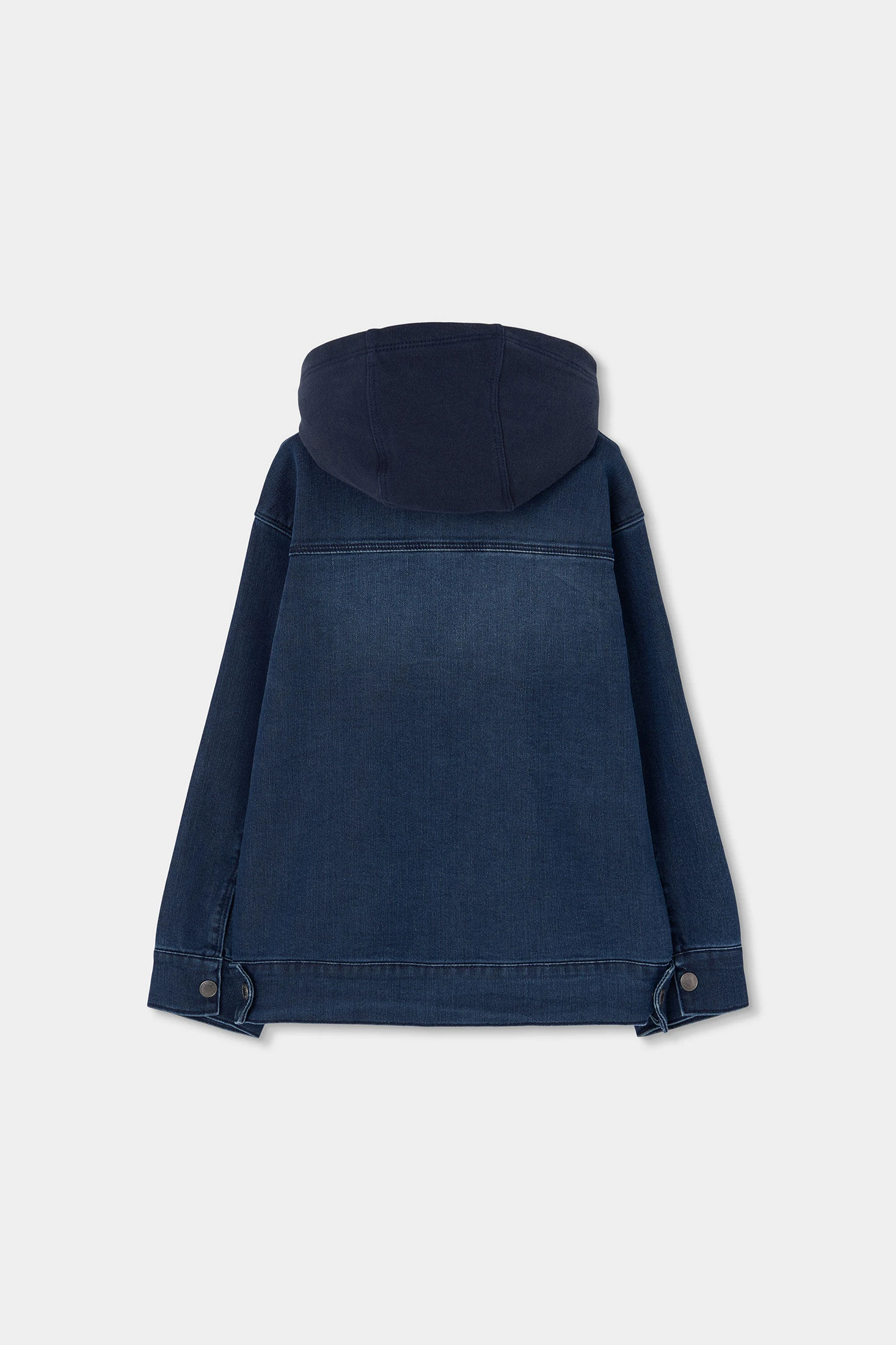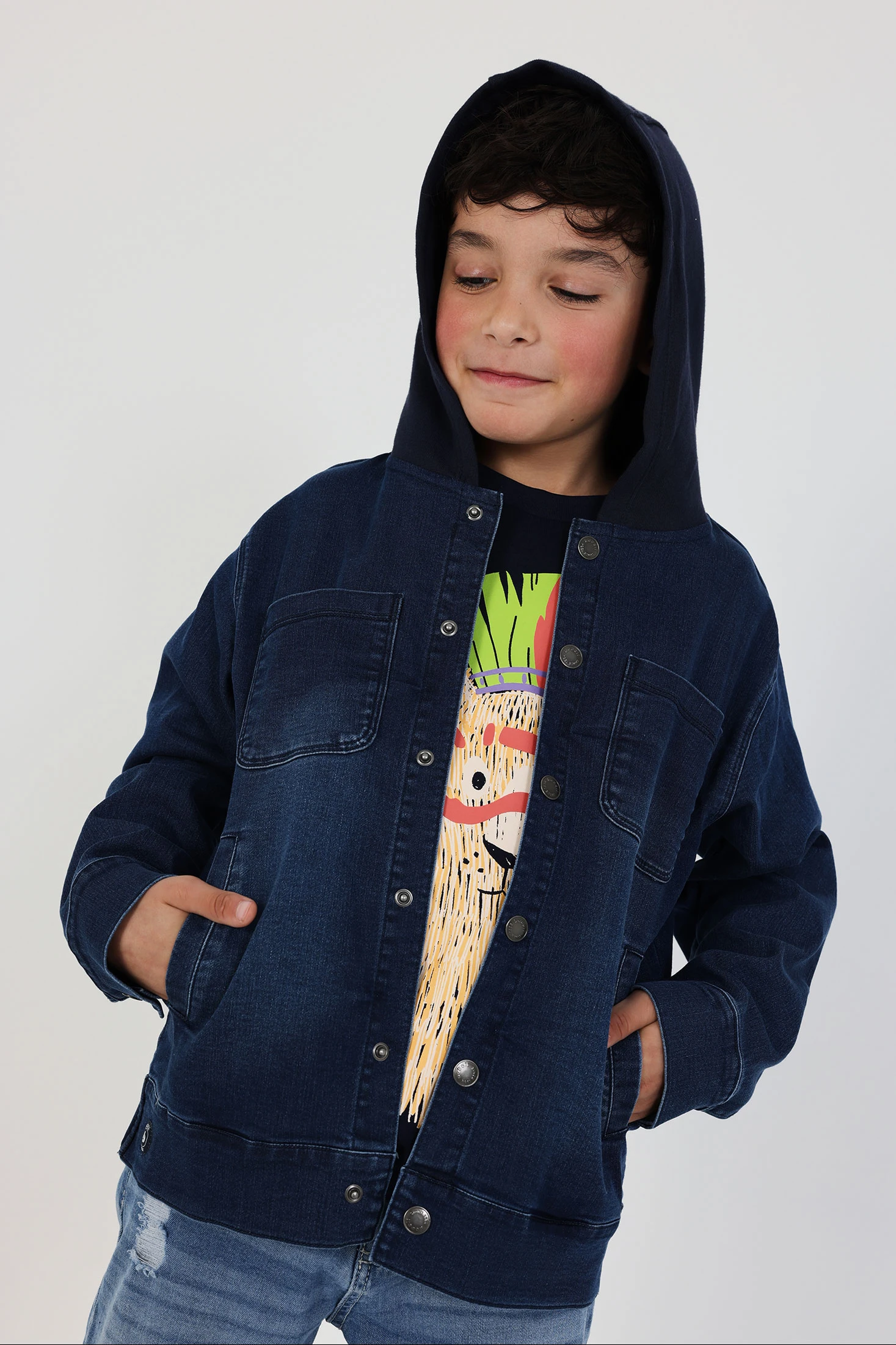Dunkelblaue Denim-Jacke kombiniert mit einer Kapuze aus Strick in Marineblau. Ihr Design ist modern und funktional, mit integrierter Kapuze und Druckknöpfen für mehr Komfort. Erhältlich in Größen von 12 Monaten bis 10 Jahren.