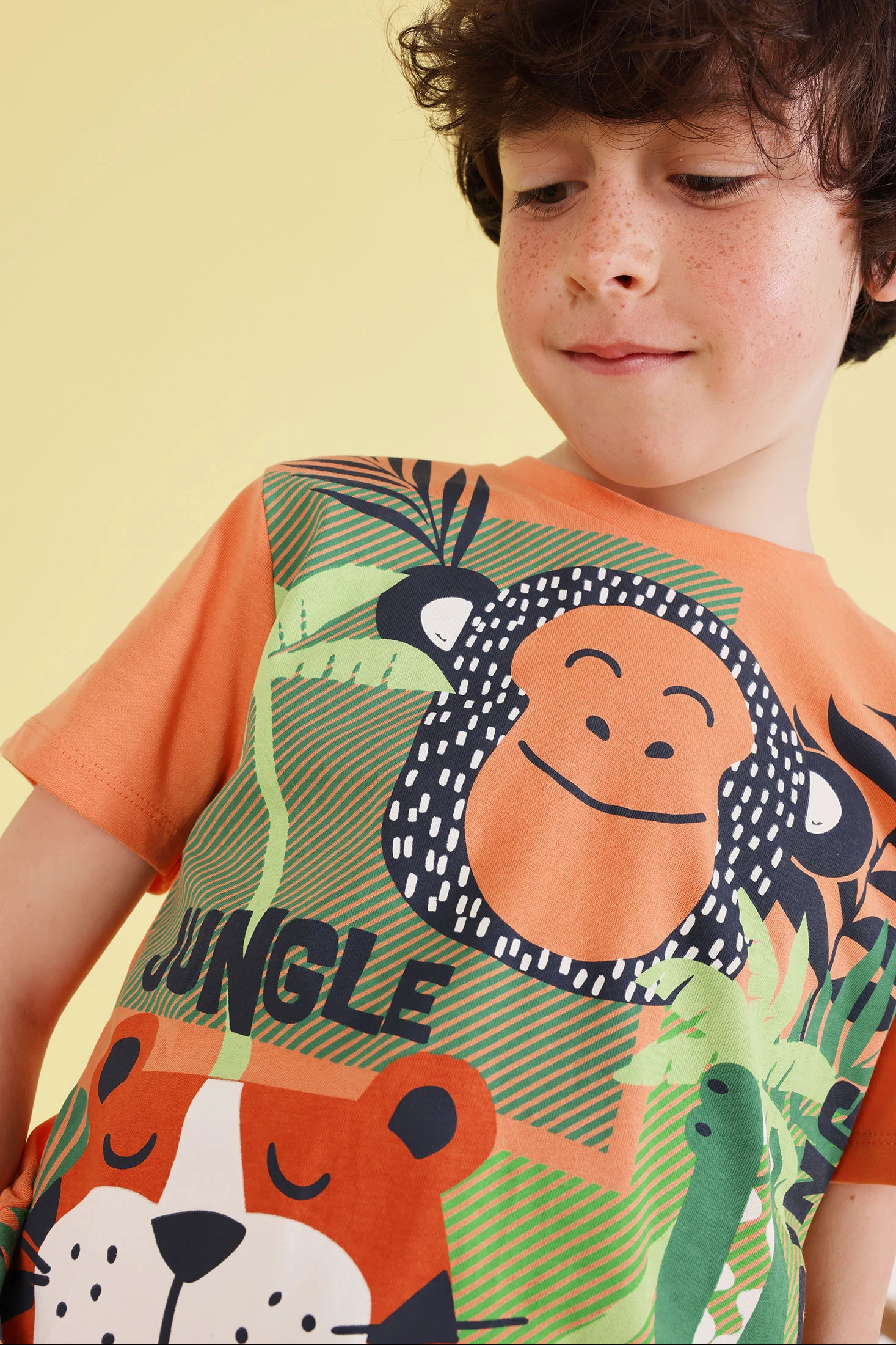 Strick-T-Shirt in Orange für Jungen, perfekt für die Frühlings- und Sommersaison. Aus Baumwolle hergestellt, bietet sie Komfort und Weichheit beim Berühren. Sie hat einen lustigen Druck mit Tieren und Vegetation, ideal für kleine Entdecker. Erhältlich in den Größen von 12 Monaten bis 10 Jahren, passt sie sich dem Wachstum des Kindes an. Ihr Design mit kurzen Ärmeln und Rundhalsausschnitt macht sie ideal, um mit Jeans oder Shorts kombiniert zu werden. Es ist ein vielseitiges Kleidungsstück, das jedem Kinderoutfit eine fröhliche Note verleiht.