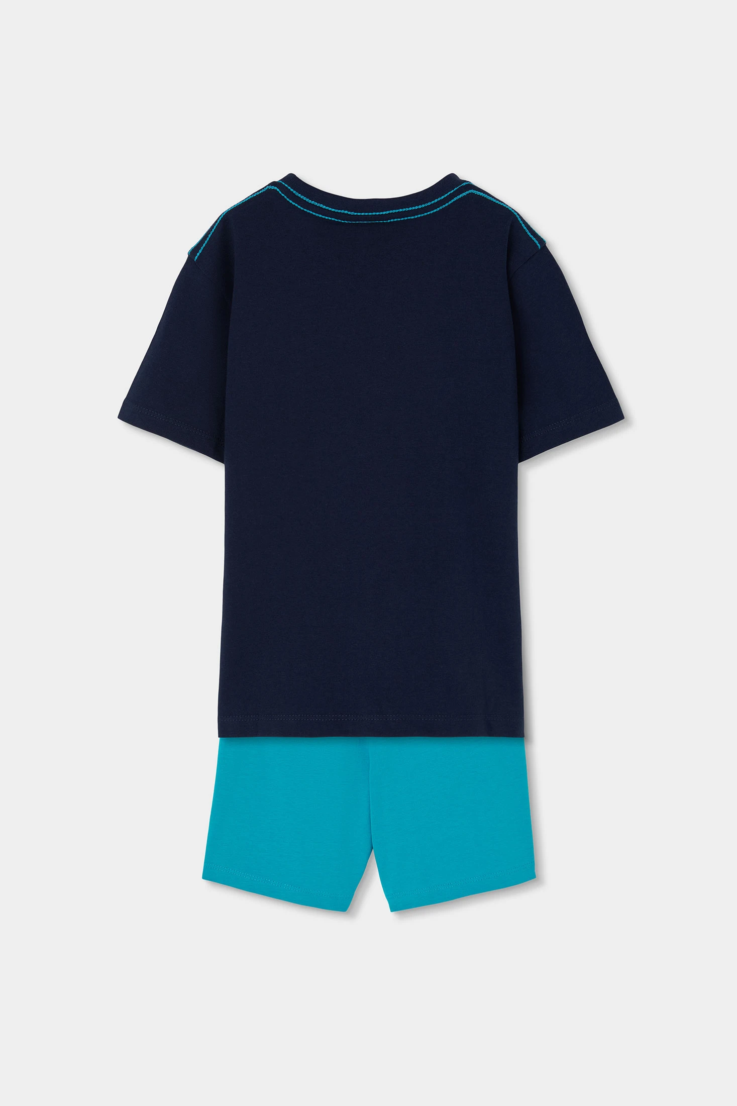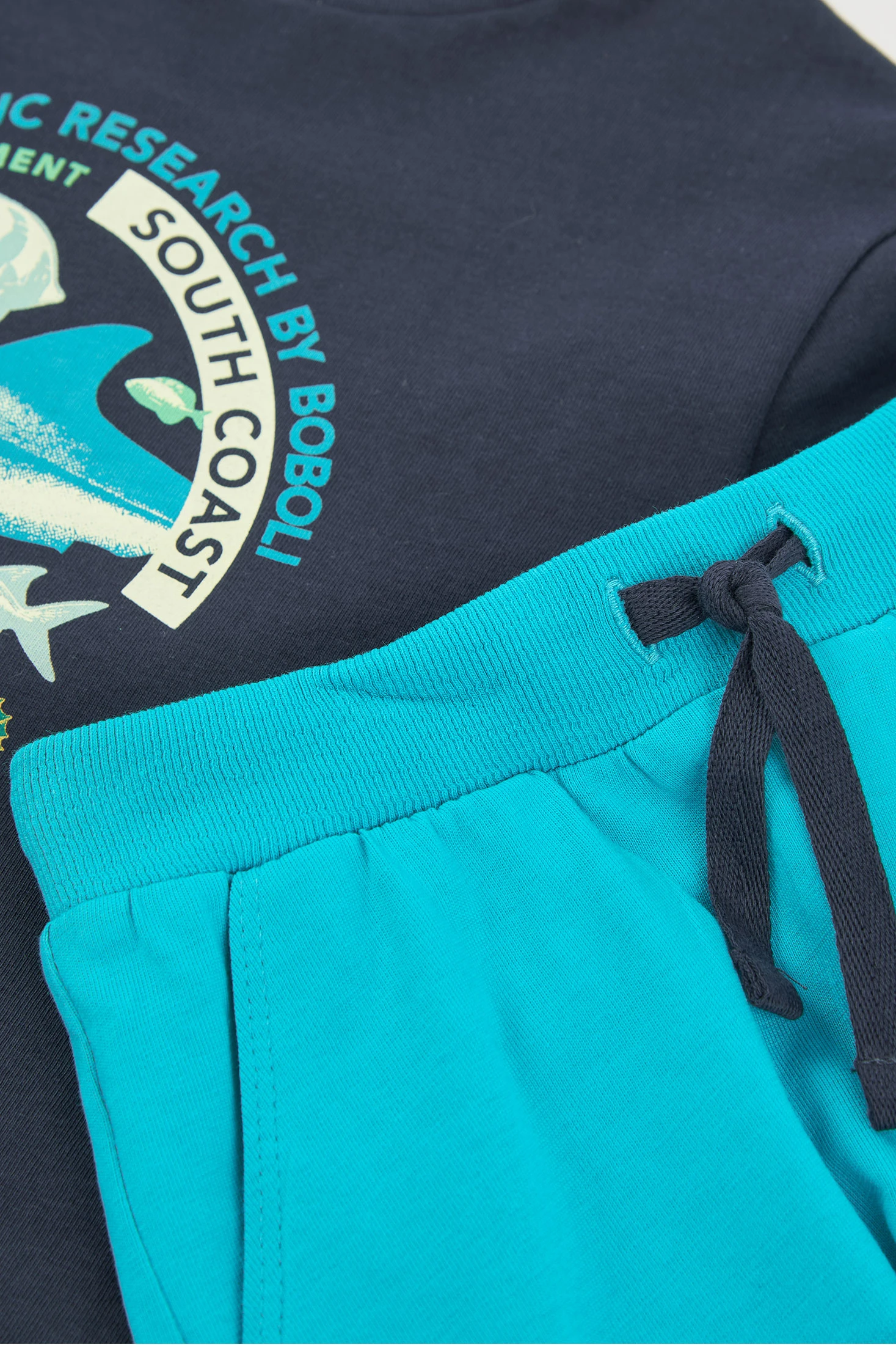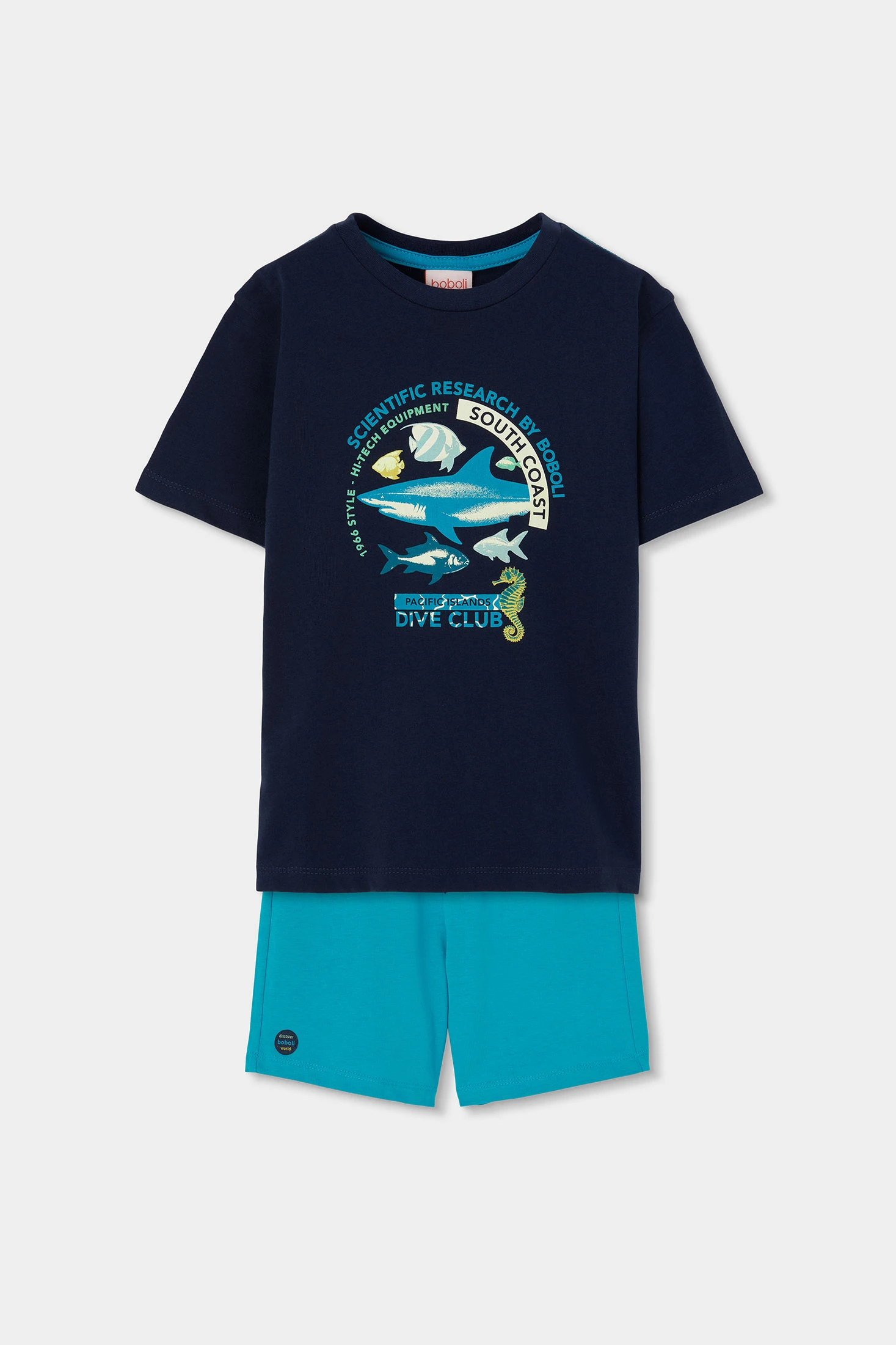 Sommeroutfit für Jungen, das ein T-Shirt und eine kurze Hose umfasst. Das marineblaue T-Shirt hat einen maritimen Aufdruck mit Fischen und einem Seepferdchen, was einen spielerischen Akzent setzt. Es besteht aus einem weichen und bequemen Baumwollstoff. Die kurze blaue Hose ergänzt das T-Shirt perfekt und bietet Frische an warmen Tagen. Die verfügbaren Größen reichen von 4 bis 10 Jahren. Es ist ein ideales Set für Outdoor-Aktivitäten und bietet Stil und Komfort.