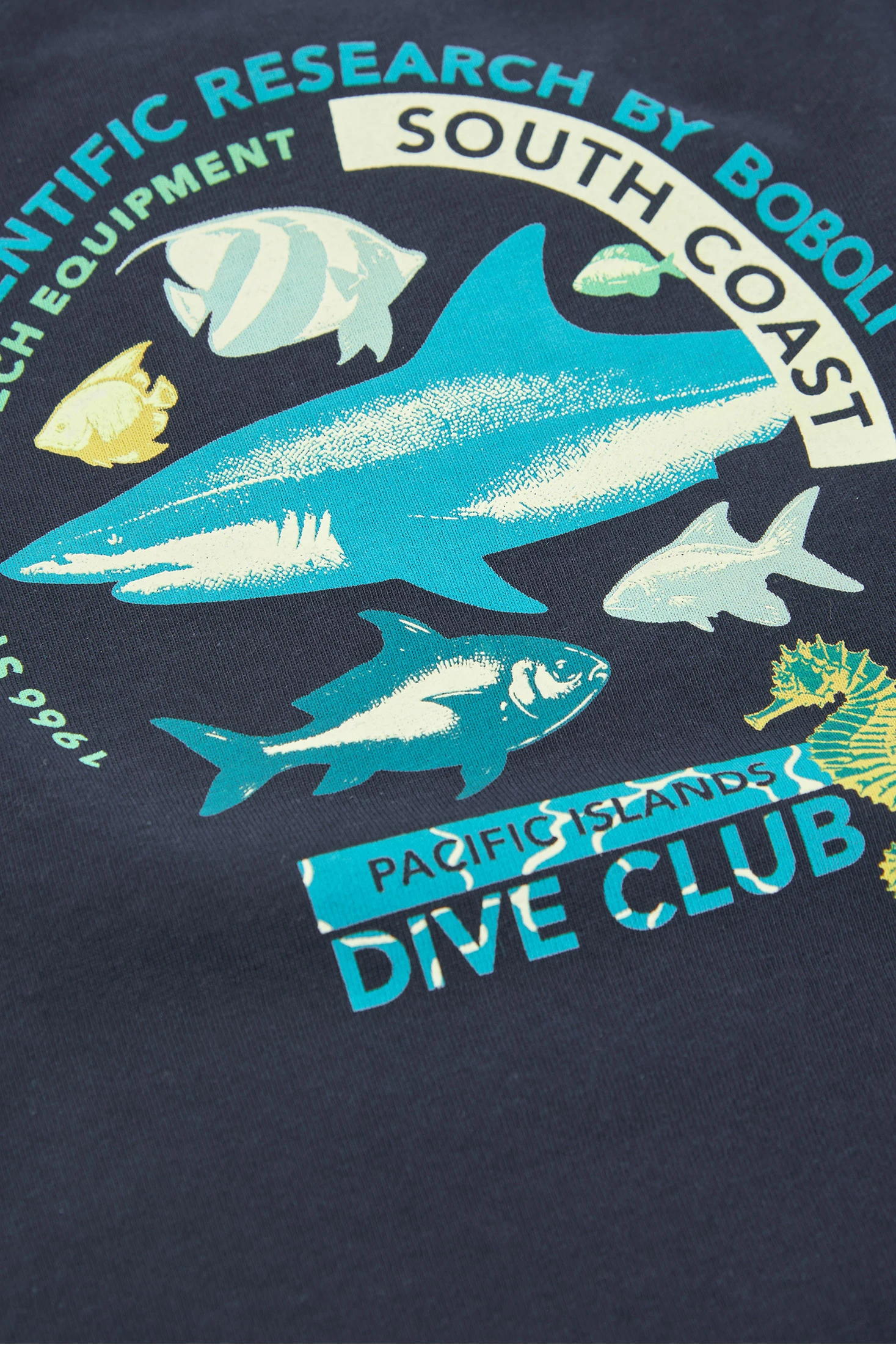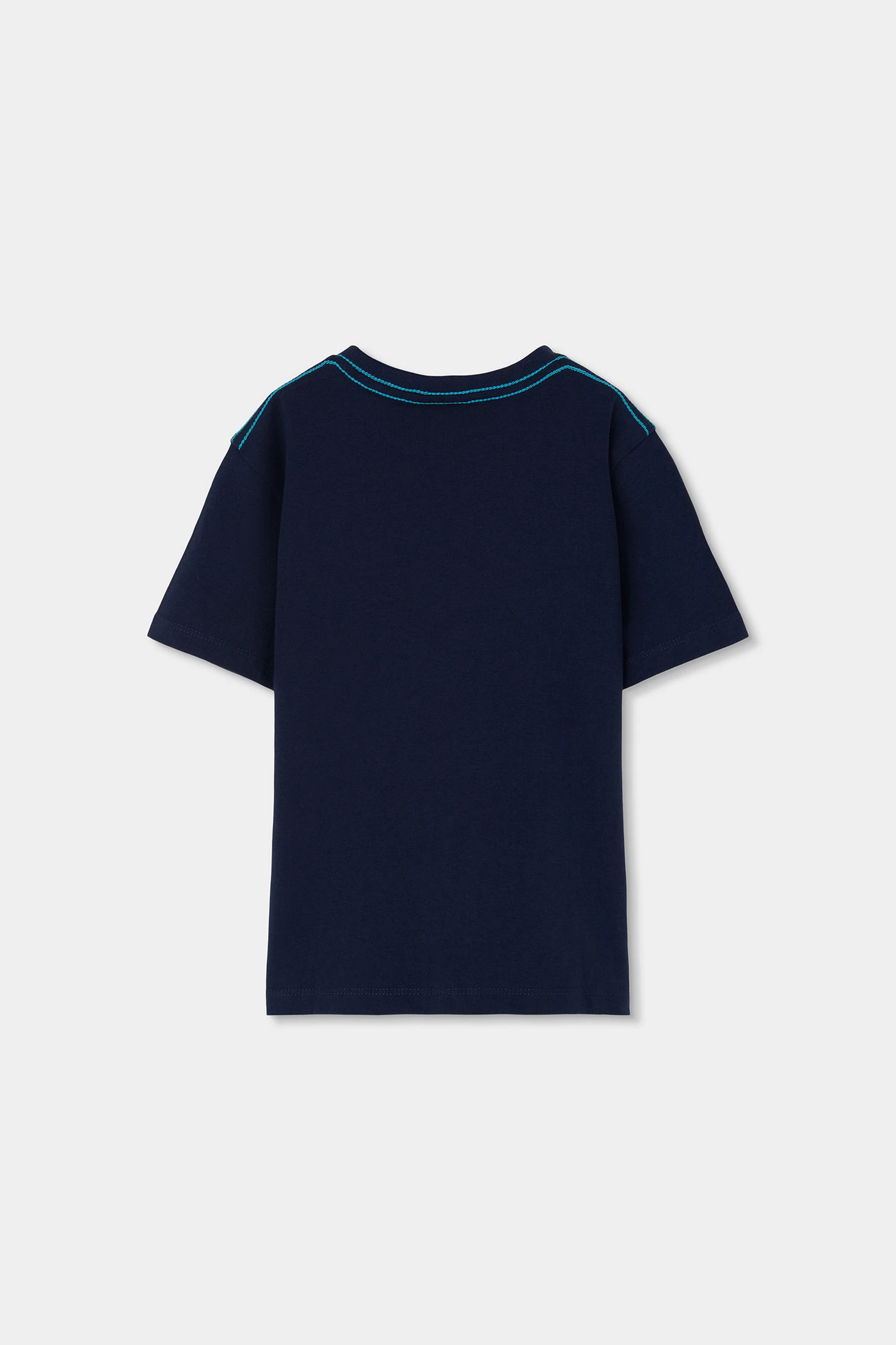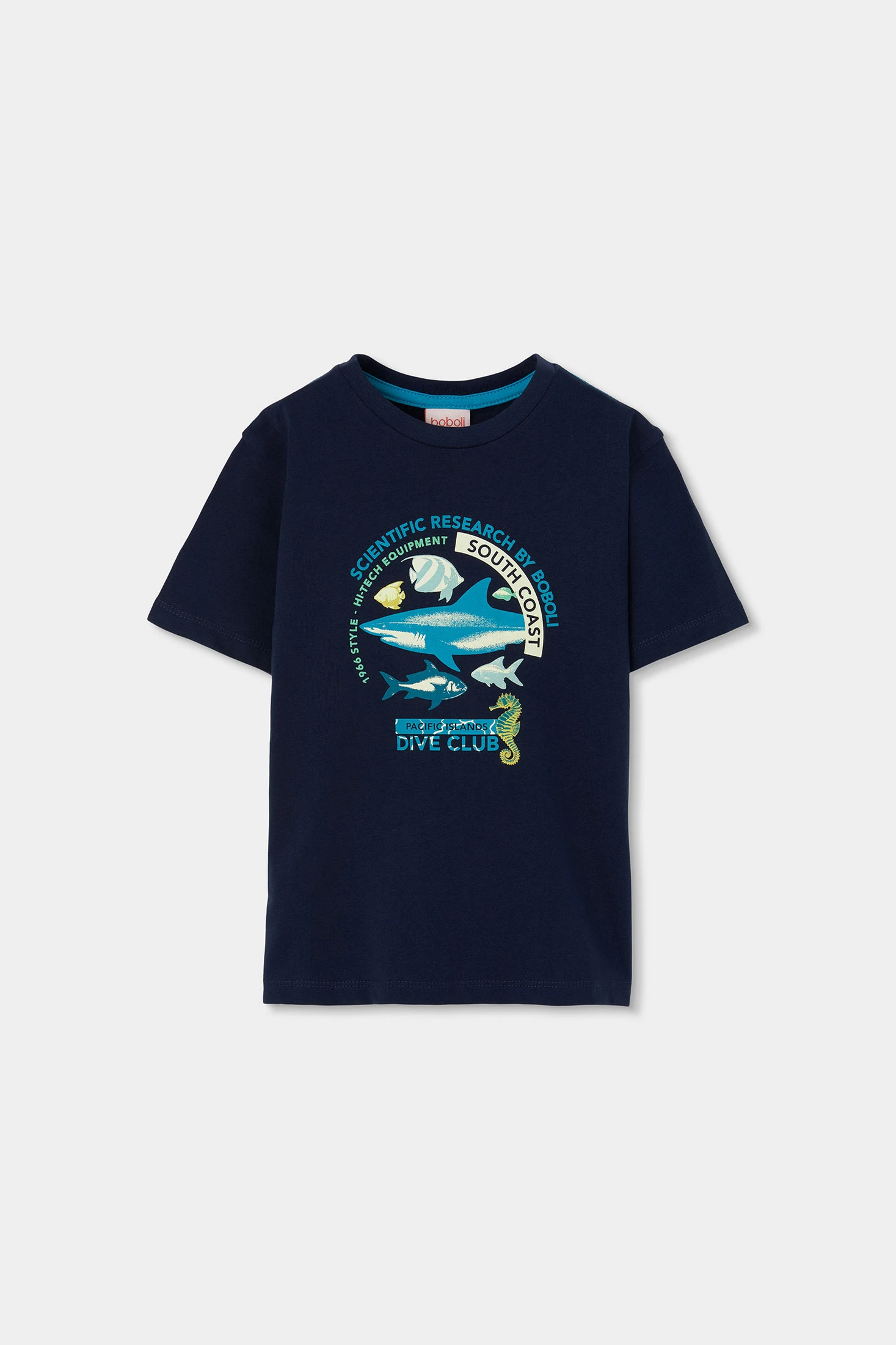 Sommeroutfit für Jungen, das ein T-Shirt und eine kurze Hose umfasst. Das marineblaue T-Shirt hat einen maritimen Aufdruck mit Fischen und einem Seepferdchen, was einen spielerischen Akzent setzt. Es besteht aus einem weichen und bequemen Baumwollstoff. Die kurze blaue Hose ergänzt das T-Shirt perfekt und bietet Frische an warmen Tagen. Die verfügbaren Größen reichen von 4 bis 10 Jahren. Es ist ein ideales Set für Outdoor-Aktivitäten und bietet Stil und Komfort.