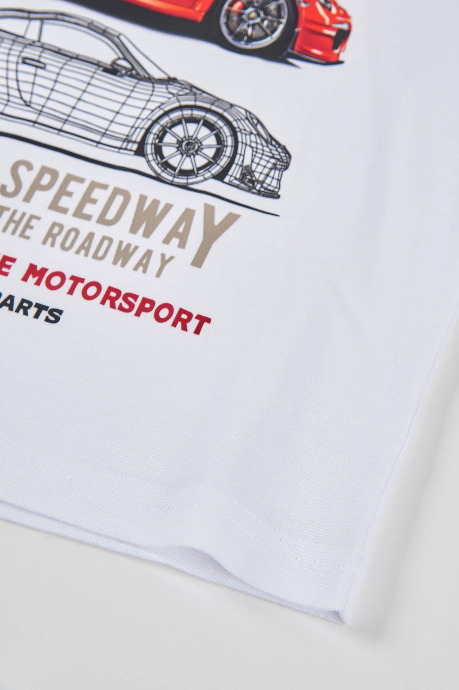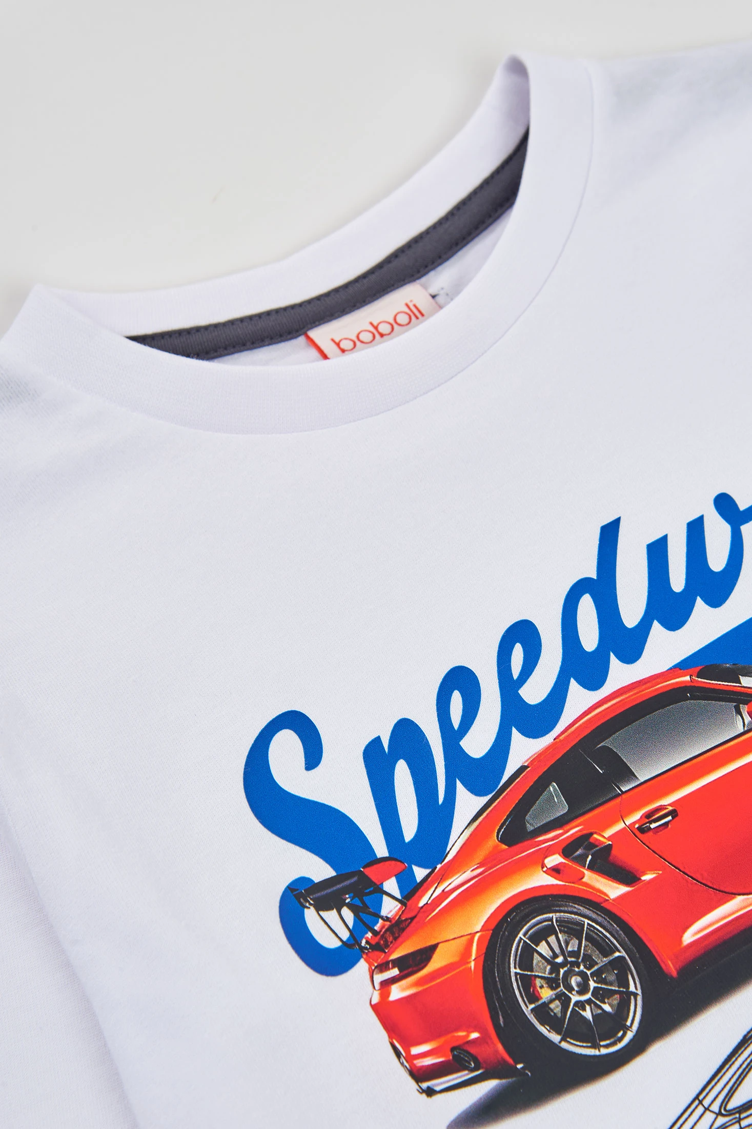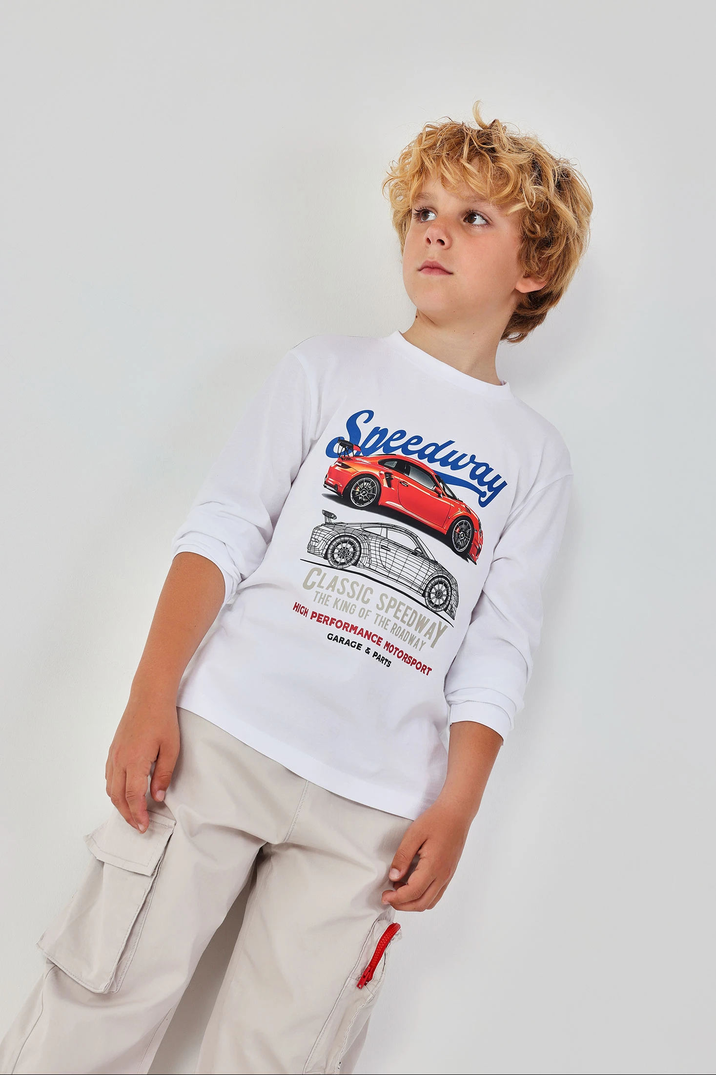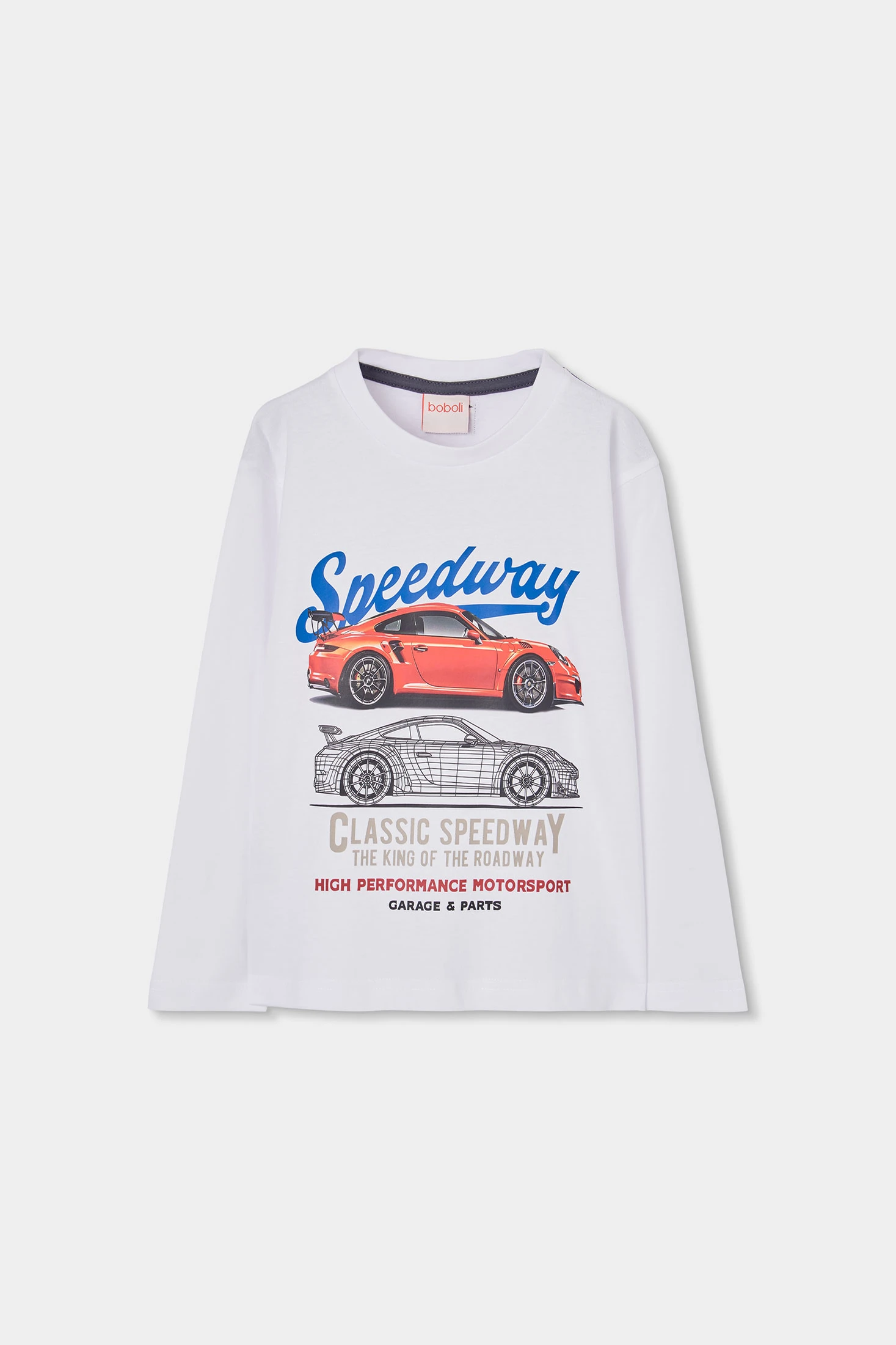Strick-T-Shirt für Jungen, ideal für den Frühling. Hergestellt aus weißer Baumwolle, bietet sie Komfort und Weichheit. Sie hat ein Design mit Autos in Aktion, das einen lustigen und sportlichen Touch verleiht. Sie hat einen Rundhalsausschnitt und lange Ärmel, was sie für kühlere Tage geeignet macht. Erhältlich in Größen von 2 bis 14 Jahren, perfekt kombinierbar mit Jeans oder Freizeithosen. Ihr vielseitiges und modernes Design macht sie zu einer unverzichtbaren Wahl für die tägliche Garderobe jedes Kindes.