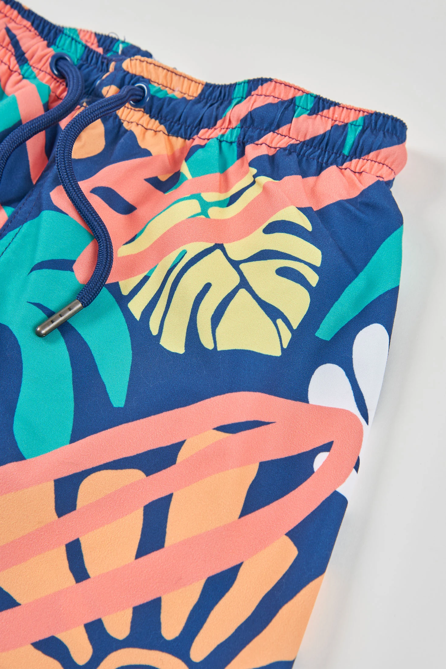 Blauer Badeanzug aus recyceltem Material, ideal für Strandtage. Er hat ein farbenfrohes Design mit Blättern und abstrakten Formen. Das Material ist leicht und schnelltrocknend und garantiert Komfort und Praktikabilität. Geeignet für Altersgruppen von 2 bis 14 Jahren, sorgt er für eine passende Passform während des Wachstums. Der elastische Bund mit verstellbarem Kordelzug bietet zusätzliche Sicherheit. Eine perfekte Option, um den Pool oder das Meer stilvoll und nachhaltig zu genießen.
