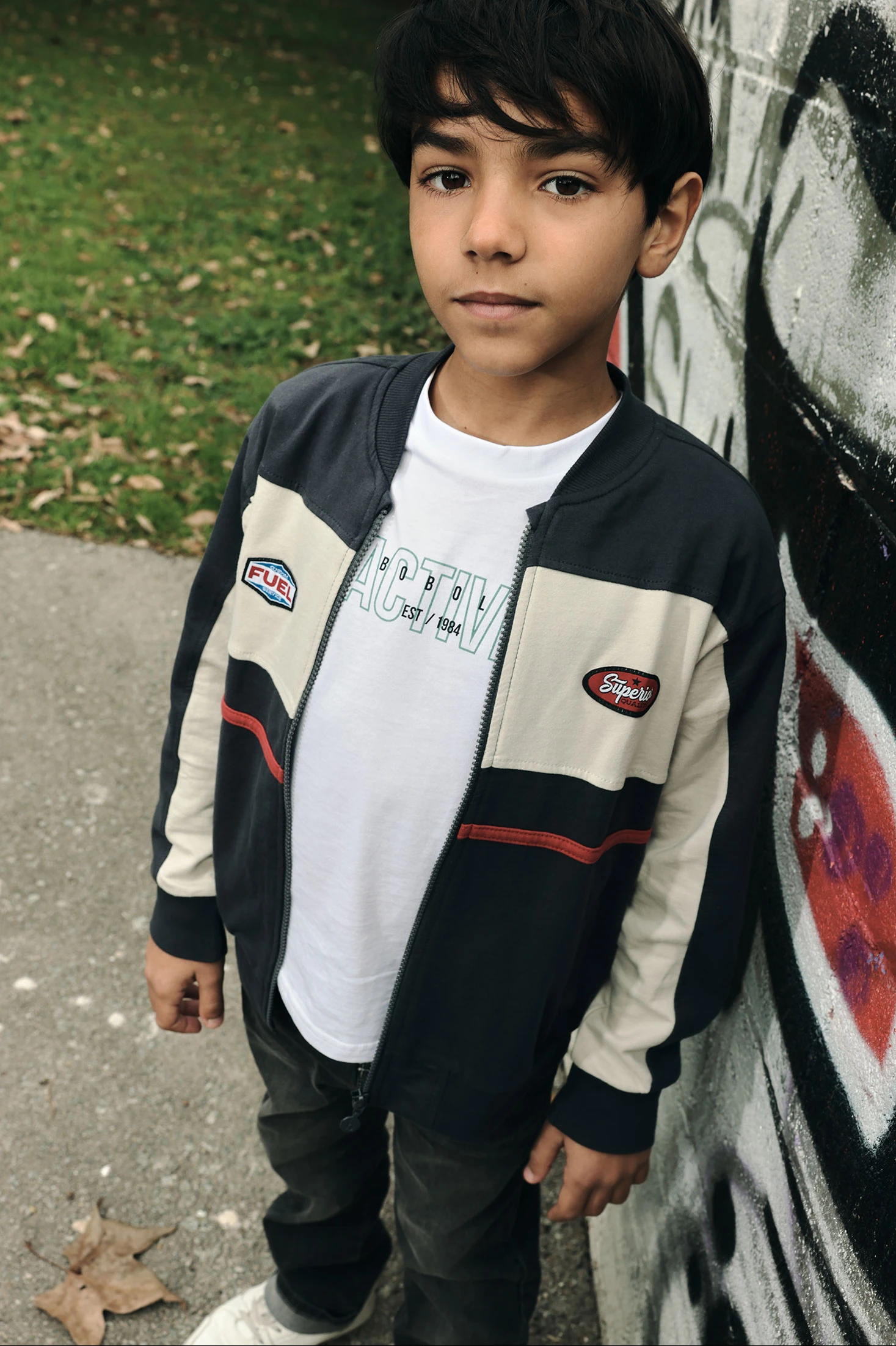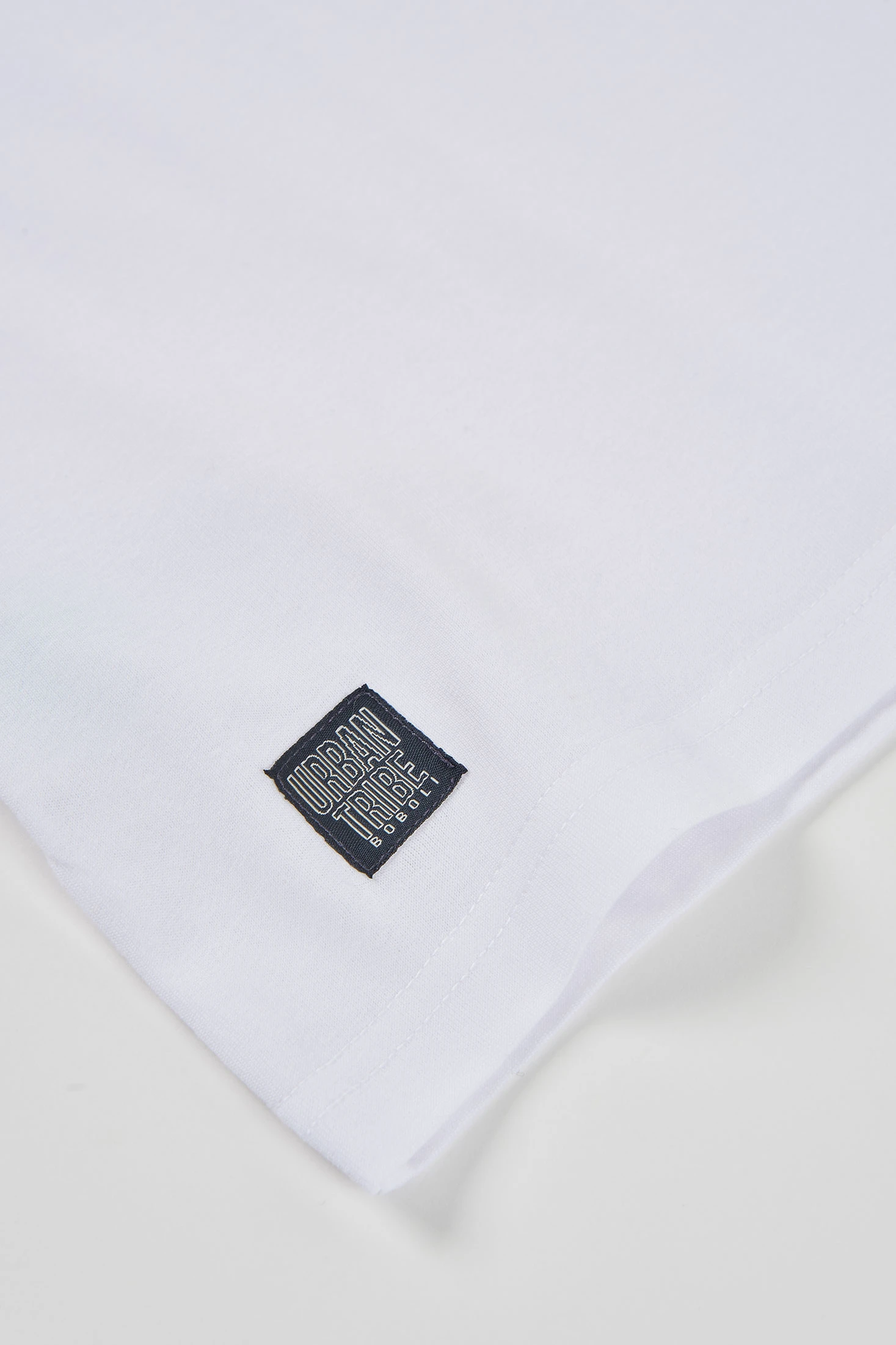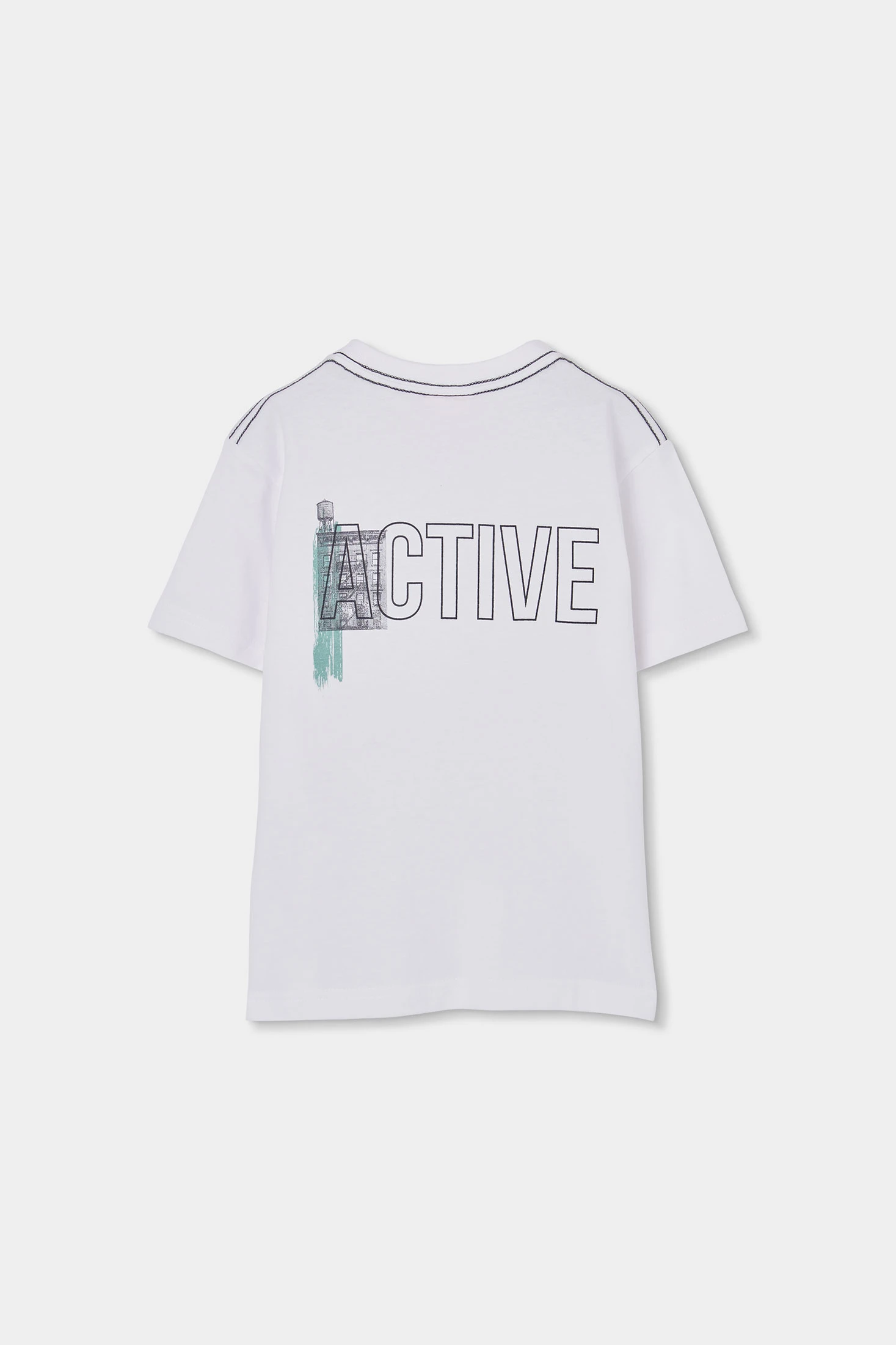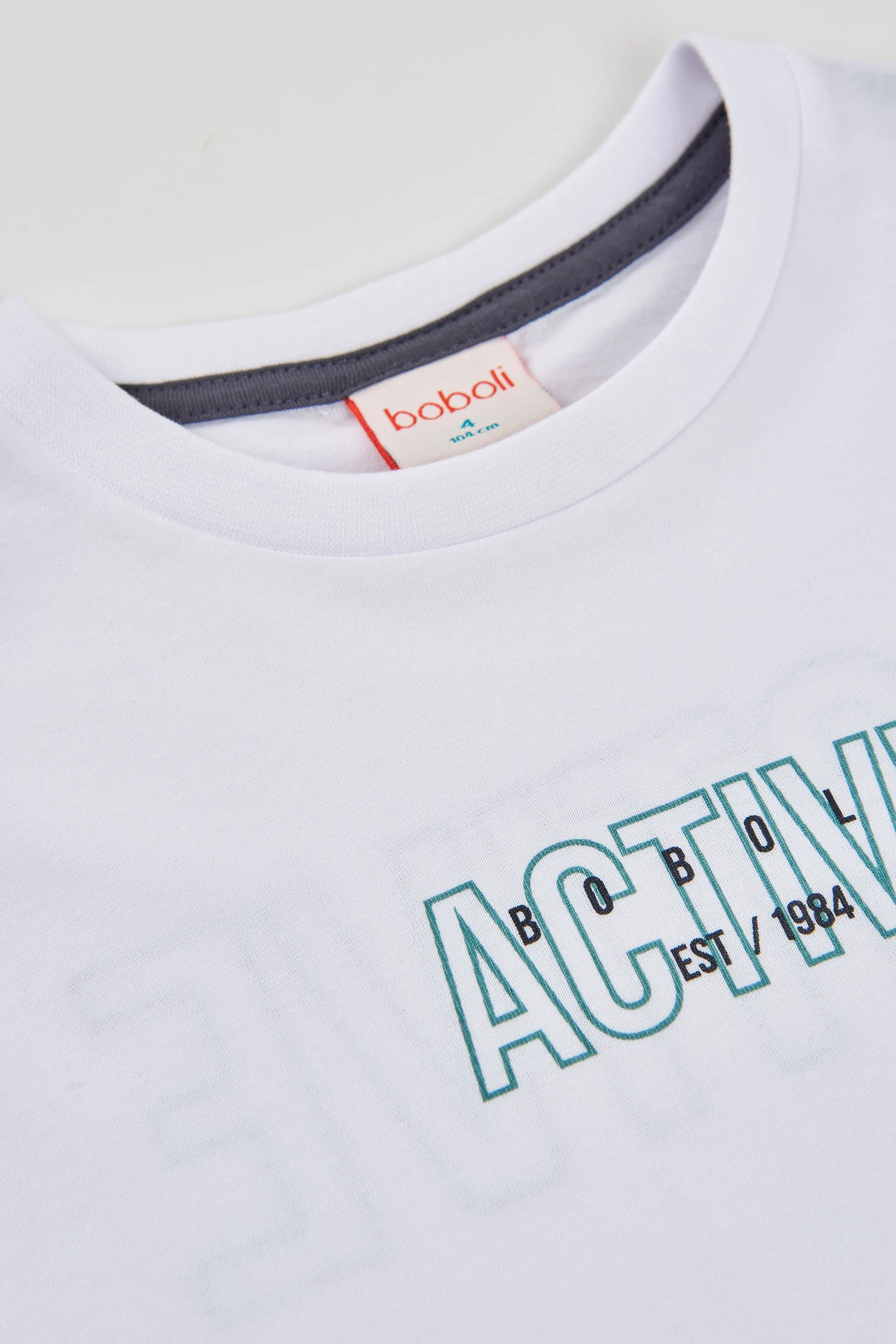 Weiße Baumwoll-T-Shirt für Jungen, ideal für jeden Anlass. Das Design ist einfach und bequem, mit dem Schriftzug "ACTIVE" auf der Vorderseite, der Dynamik verleiht. Hergestellt aus hochwertigem Material, ist dieses T-Shirt weich und atmungsaktiv. Erhältlich in Größen von 2 bis 14 Jahren, passend für verschiedene Altersstufen und Wachstumsphasen. Perfekt zum Kombinieren mit Shorts oder Jeans an warmen Tagen, bietet es einen lässigen und modernen Stil. Ein grundlegendes und vielseitiges Kleidungsstück für den Kleiderschrank eines jeden Kindes.