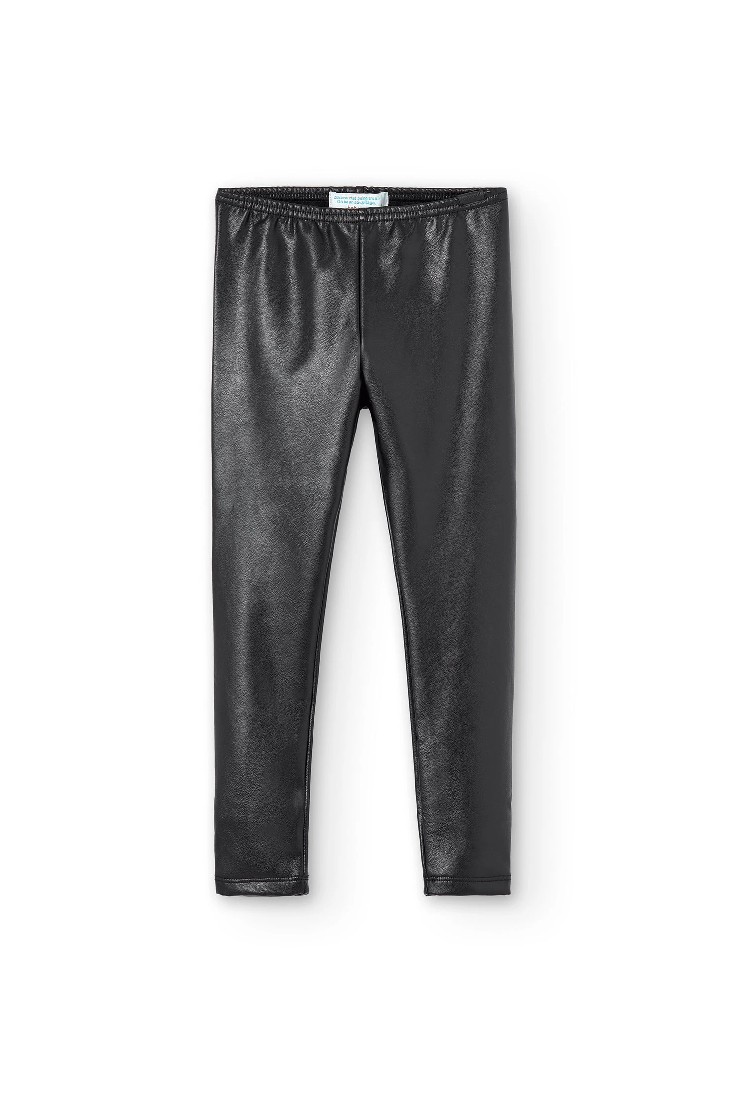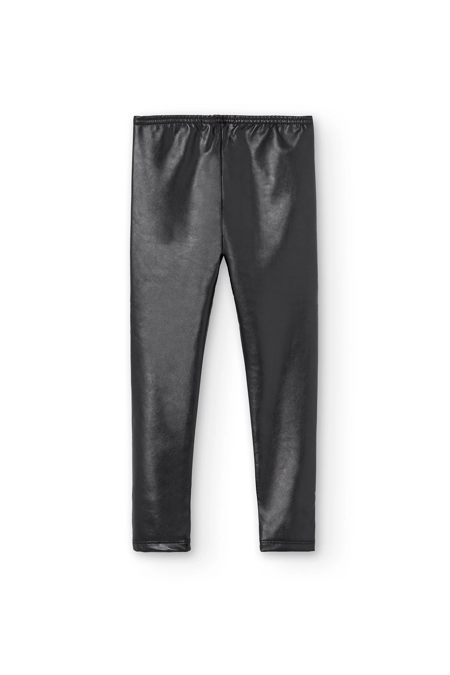 Mädchen-Leggings aus schwarzem Kunstleder mit Gummizug. Die Dekoration ist ein kleiner Aufdruck mit einem Detail der Marke. Erhältlich ab Größe 4 Jahre bis 16 Jahre.