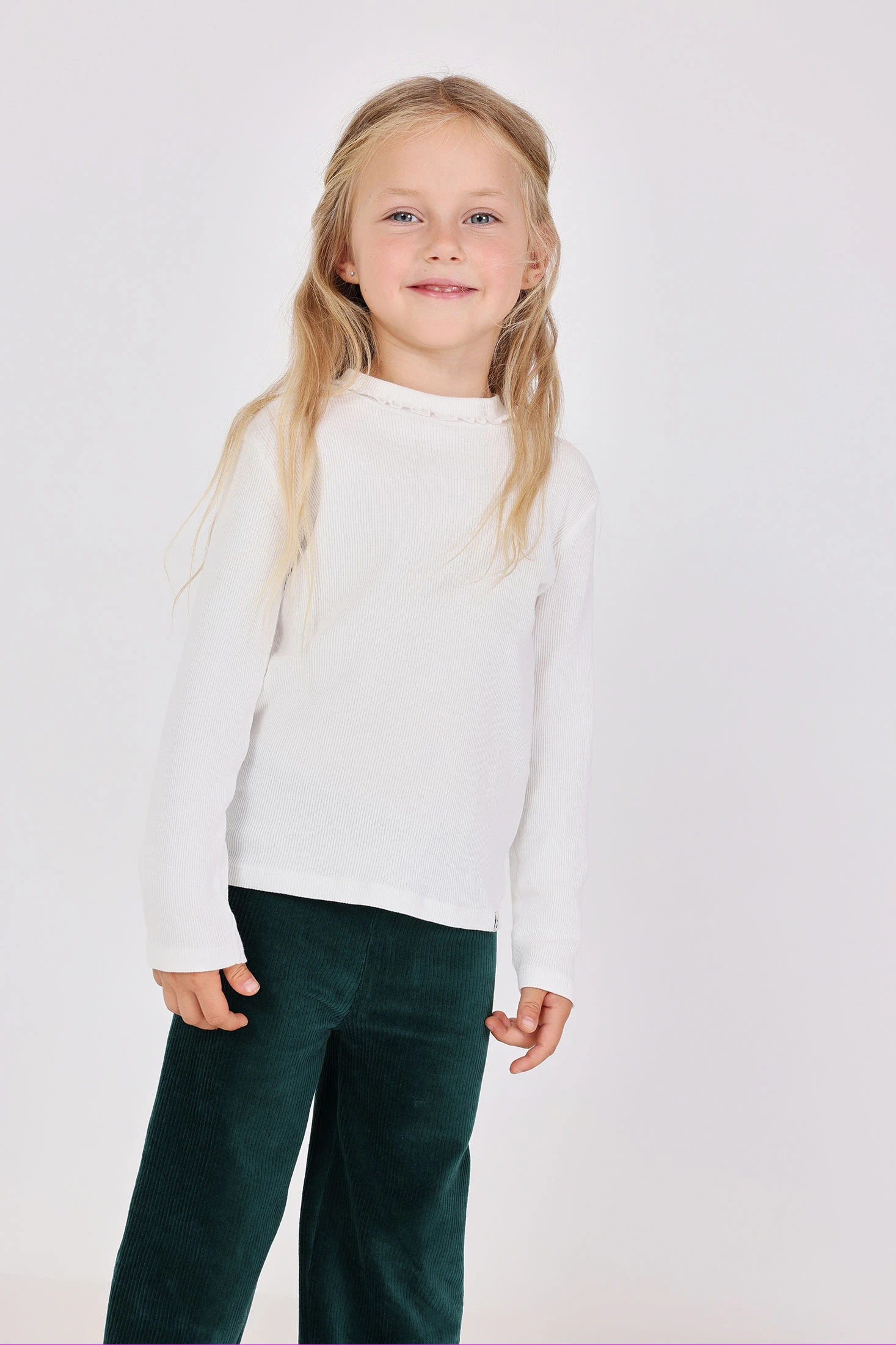 Baumwoll-T-Shirt für Mädchen, in Weiß, ideal für kühlere Klimazonen. Entworfen mit einem eleganten Rundhalsausschnitt, verziert mit einem zarten Rüschenbesatz und langen Ärmeln, bietet es Komfort und Anpassungsfähigkeit. Hergestellt aus hochwertigen Materialien, ist es in Größen von 12 Monaten bis 10 Jahren erhältlich und deckt eine Vielzahl von Wachstumsphasen des Kindes ab. Seine Vielseitigkeit ermöglicht es, es einfach mit Hosen oder Röcken zu kombinieren, und eignet sich sowohl für informelle als auch formelle Anlässe. Eine unverzichtbare Ergänzung für die Herbst- und Wintergarderobe, dieses T-Shirt garantiert Wärme
