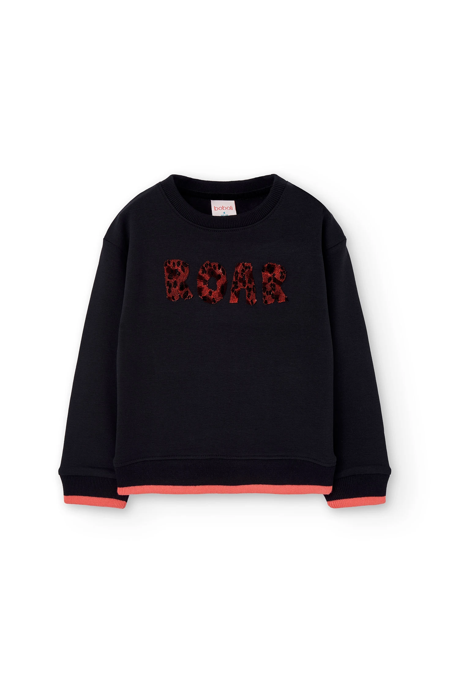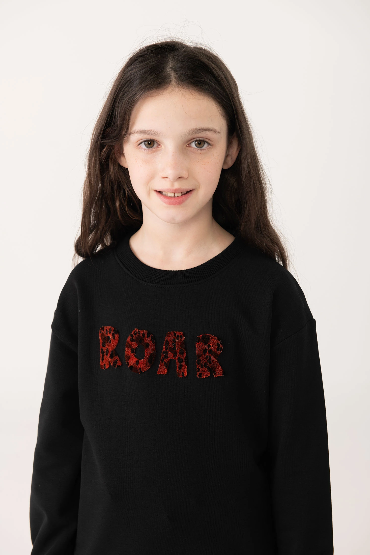 Schwarzer Sweater aus Frottee für Mädchen mit dem Aufdruck "ROAR" auf der Brust, ideal um dein kleines Mädchen in der Herbst- und Wintersaison warm und modisch zu halten. Hergestellt aus einem weichen und warmen Stoff, bietet dieses Kleidungsstück ein Design mit Rundhalsausschnitt und langen Ärmeln für Komfort und Schutz gegen die Kälte. Erhältlich in Größen von 2 bis 14 Jahren, lässt es sich perfekt mit Jeans oder Sporthosen kombinieren und bietet einen modernen und lustigen Stil.
