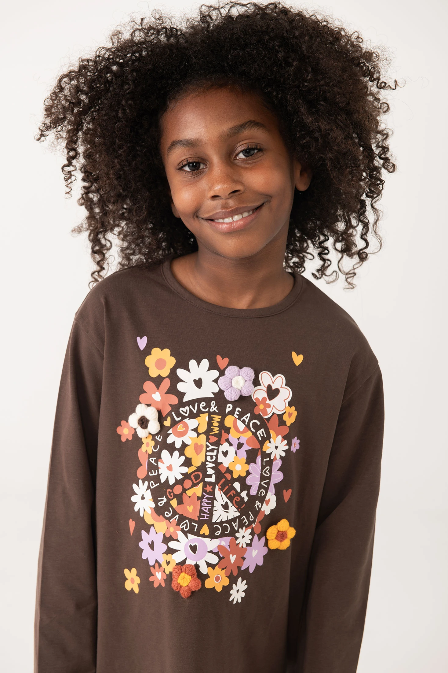 Strick-T-Shirt für Mädchen in einem bezaubernden Braunton, verziert mit einem bunten Blumenmuster, ideal, um den Kleiderschrank der Kleinen mit einem lustigen und originellen Akzent zu bereichern. Gefertigt aus einem weichen und bequemen Stoff, ist es perfekt für die Herbst- und Wintersaison. Erhältlich in Größen von 2 bis 14, ist es ein vielseitiges Kleidungsstück, das leicht mit Hosen oder Röcken zu lässigen und stilvollen Outfits kombiniert werden kann.