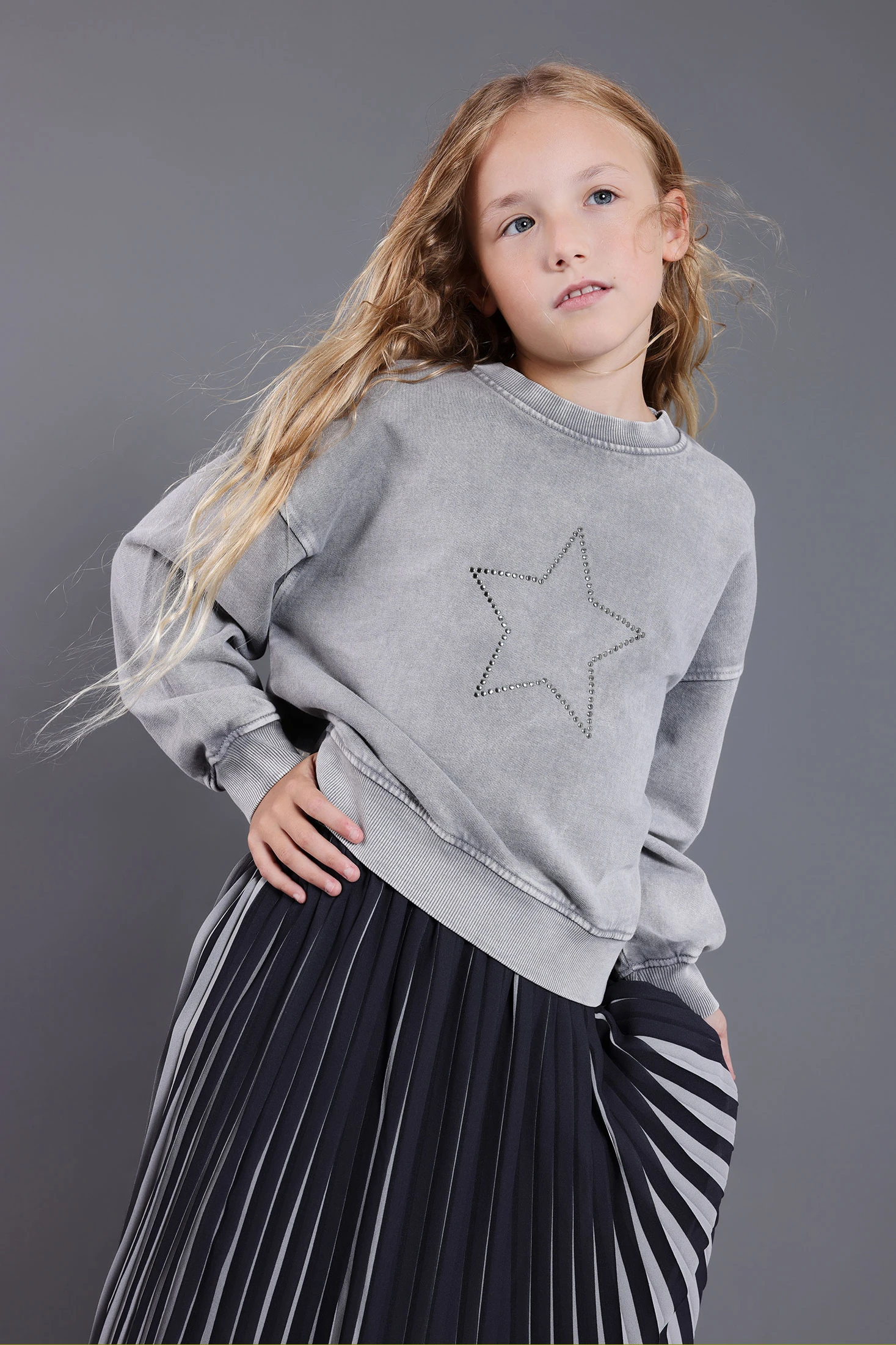Graues Mädchen-Flauschsweatshirt, perfekt, um die Kleinen während des Herbstes und Winters warm und modisch zu halten. Hergestellt aus einer angenehmen Mischung aus Baumwolle und Polyester, bietet es Weichheit und Wärme für den täglichen Gebrauch. In verschiedenen Größen erhältlich, garantiert es eine bequeme und passende Passform für verschiedene Altersgruppen. Kombiniere es mit Jeans, Leggings oder Röcken, um vielseitige und bezaubernde Looks zu kreieren. Ideal für den Alltag, macht sein vielseitiges Design es zu einem unverzichtbaren Kleidungsstück in der Kinder-Garderobe.