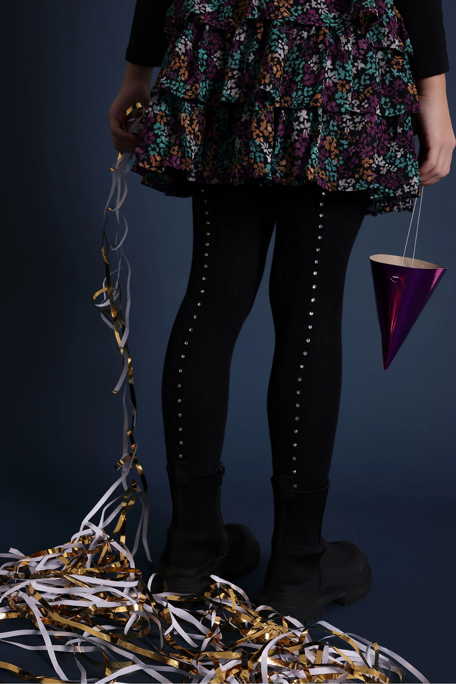 Schwarze Strumpfhose für Mädchen mit glänzenden Details, ideal für einen eleganten Look während der Herbst- und Wintersaison. Das Design integriert eine feine Linie kleiner Glitzersteine, die einen glamourösen Touch verleihen. Aus einem weichen und elastischen Material gefertigt, bietet es Komfort und eine optimale Passform. Erhältlich in Größen von 2 bis 14 Jahren, lässt es sich ideal mit Röcken oder Kleidern für ein warmes und schickes Outfit kombinieren.