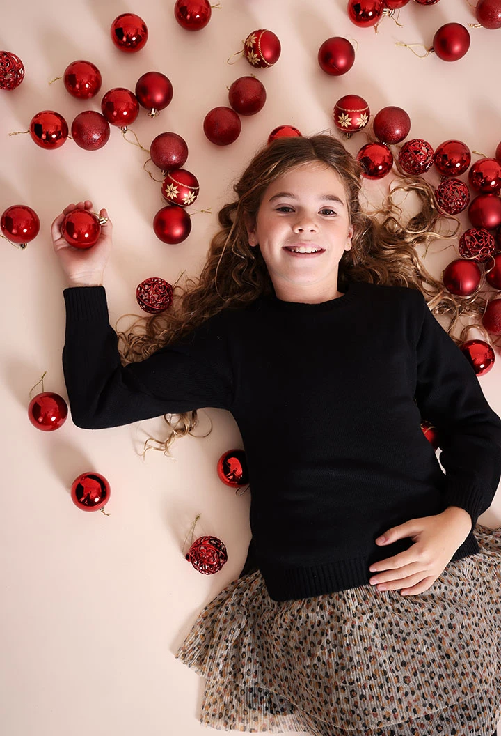 Schwarzes Strickkleid mit Blumen, ideal für Mädchen in den Herbst- und Wintersaisons, sorgt für Wärme und Stil. Gefertigt aus einem weichen Stoff, präsentiert es ein elegantes florales Design in Brauntönen und Beige am unteren Teil, das einen markanten Akzent setzt. Rundhalsausschnitt und lange Ärmel machen es perfekt für kalte Tage, erhältlich in Größen von 2 bis 14 Jahren. Kombiniere es mit einfachen Strumpfhosen, um einen vielseitigen und bequemen Look für jede Gelegenheit zu erzielen.