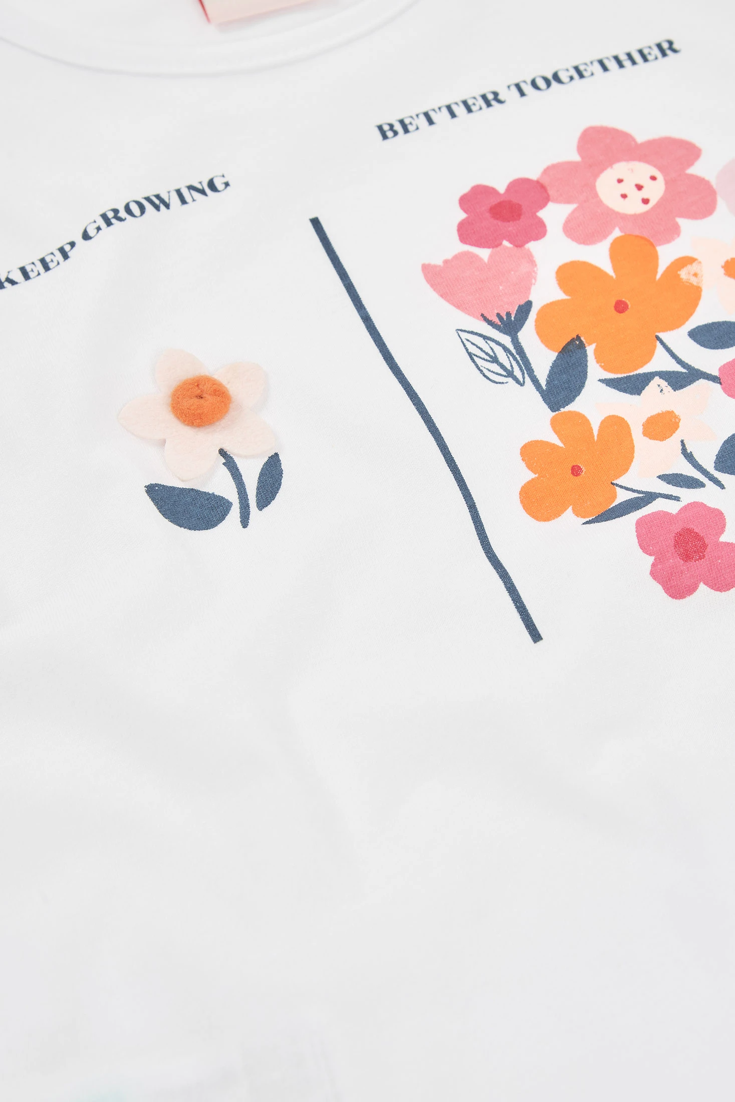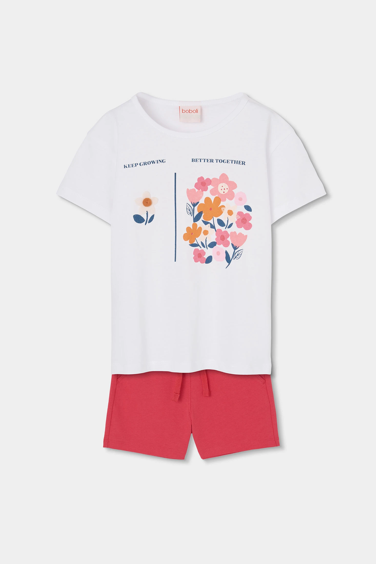 Mädchen-Strickset aus Baumwolle, perfekt für den Alltag. Es enthält ein weißes T-Shirt mit einem frischen Blumenprint in Rosatönen und Orange, begleitet von dem Satz ''Keep Growing Better Together''. Die Shorts sind in einem lebhaften Rosa und verleihen einen fröhlichen Touch. Das Strickmaterial sorgt für Komfort und Weichheit, ideal für warme Klimazonen. Erhältlich in Größen von 12 Monaten bis 14 Jahren, kombiniert dieses Set Stil und Komfort und ist eine praktische und vielseitige Option für jeden ungezwungenen Anlass.