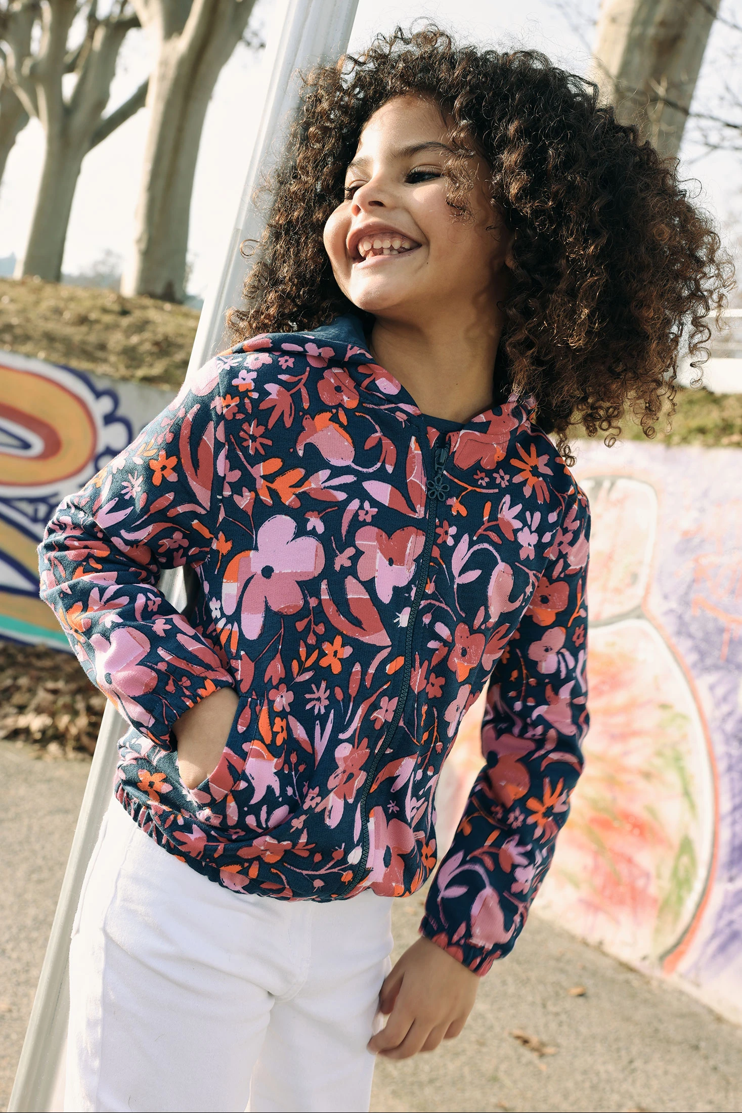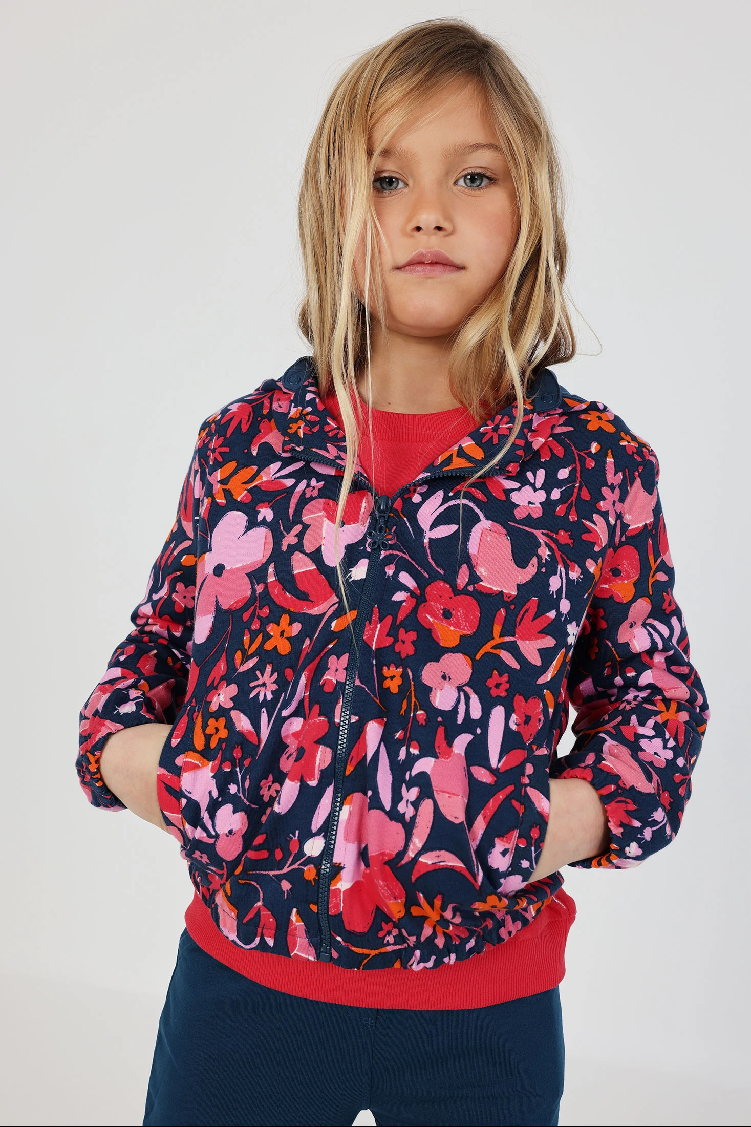 Bedruckte Kapuzenjacke aus Plüsch für Mädchen, ideal, um Stil und Komfort in kühleren Monaten zu bieten. Mit einem lebhaften Blumenmuster in Rosa- und Orangetönen, das auf einem blauen Hintergrund hervorsticht. Das Plüschmaterial sorgt für Wärme und Weichheit. Enthält eine praktische Kapuze und einen Reißverschluss zum einfachen Anpassen. Die Größen sind von 12 Monaten bis 14 Jahren erhältlich. Perfekt zur Kombination mit Jeans oder Leggings, verleiht diese Jacke der Kinder-Garderobe eine fröhliche und farbenfrohe Note.