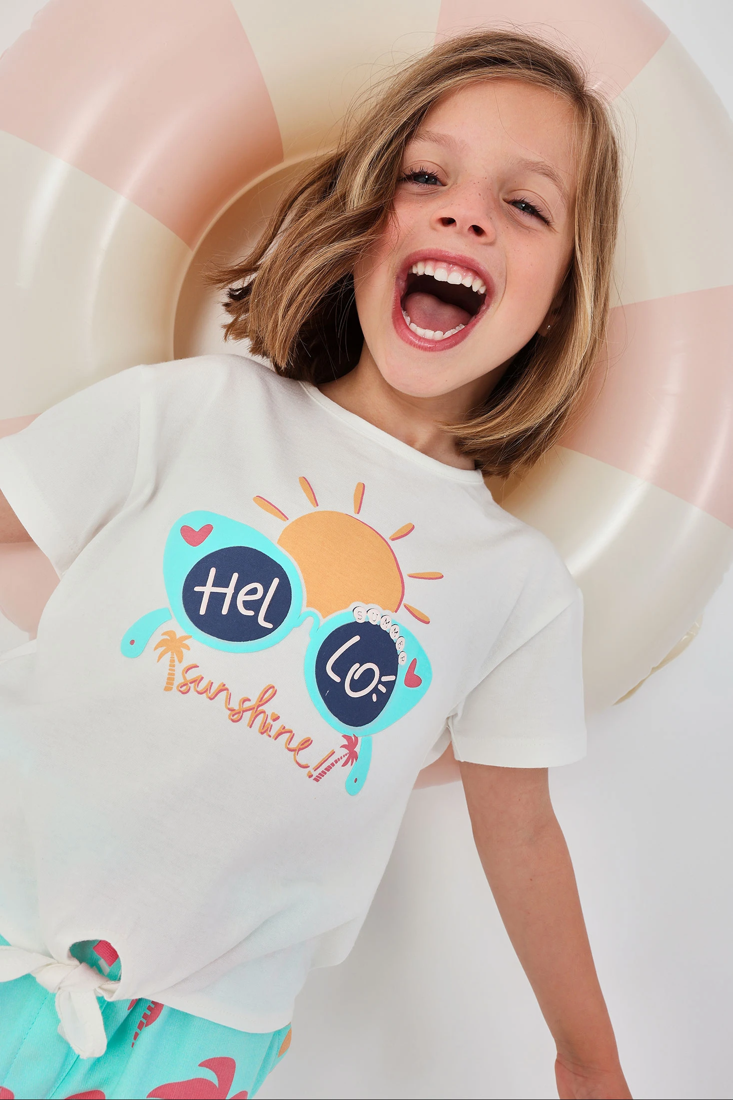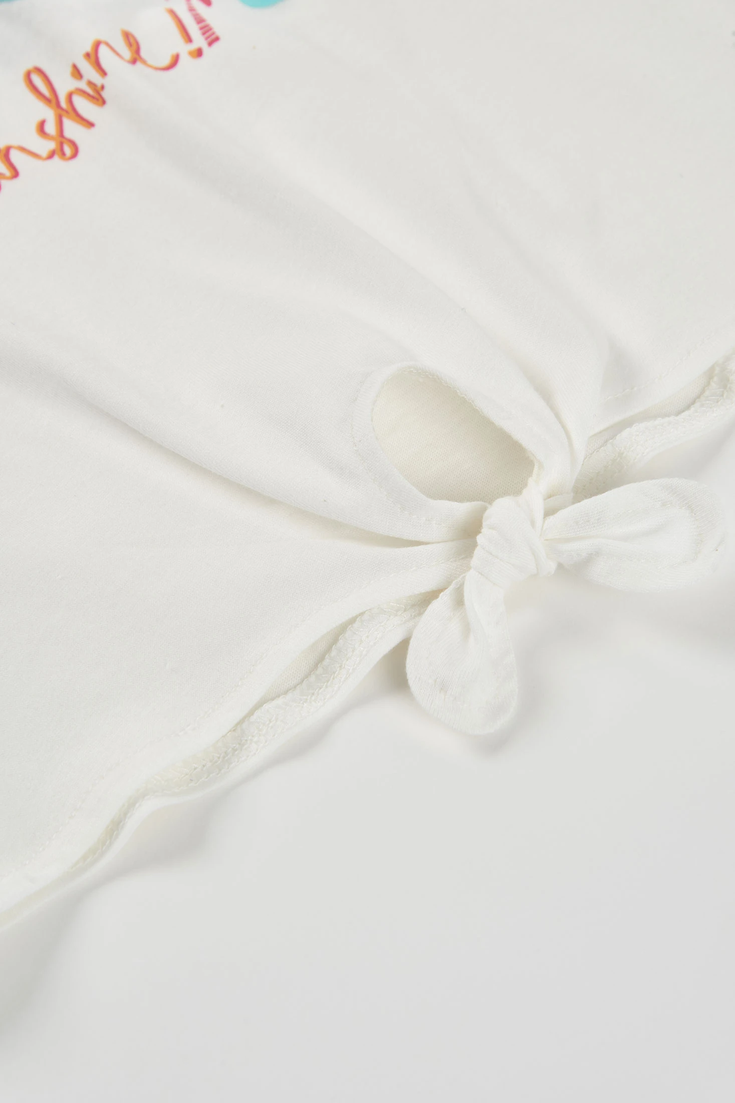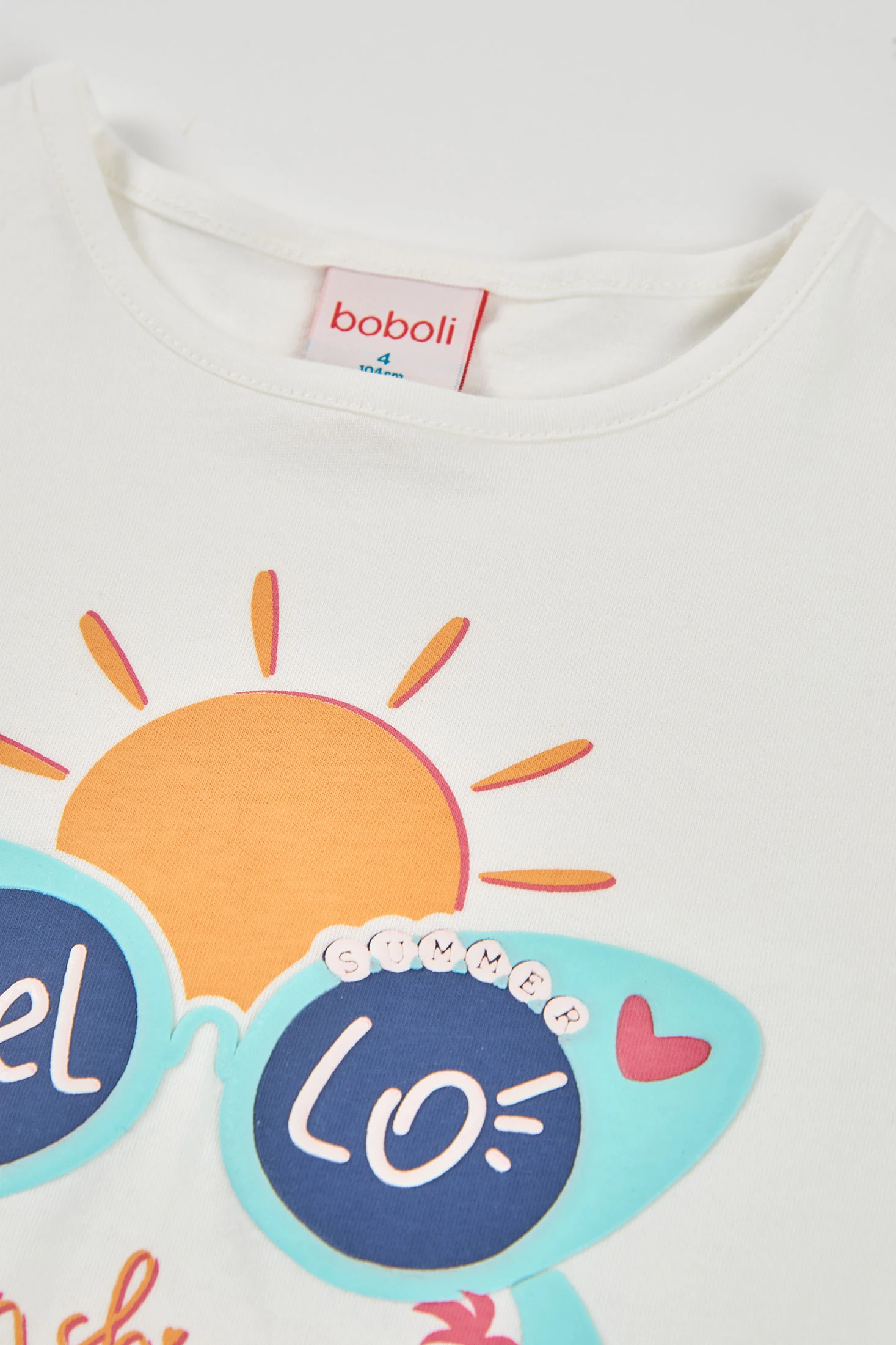 Baumwoll-T-Shirt für Mädchen, perfekt für sonnige Frühlingstage und den Sommer. In Weiß gehalten, zeigt es auf der Vorderseite ein auffälliges Design mit einer Sonne und einer Brille, die "Hello Sunshine" sagen, was einen fröhlichen und lustigen Akzent setzt. Das Baumwollmaterial bietet Komfort und Frische. Der Knoten am unteren Ende fügt ein stilvolles Detail hinzu. Verfügbar in Größen von 12 Monaten bis 10 Jahren, ist es eine vielseitige Option zum Kombinieren mit Röcken oder Hosen, ideal für einen lässigen und bequemen Look.