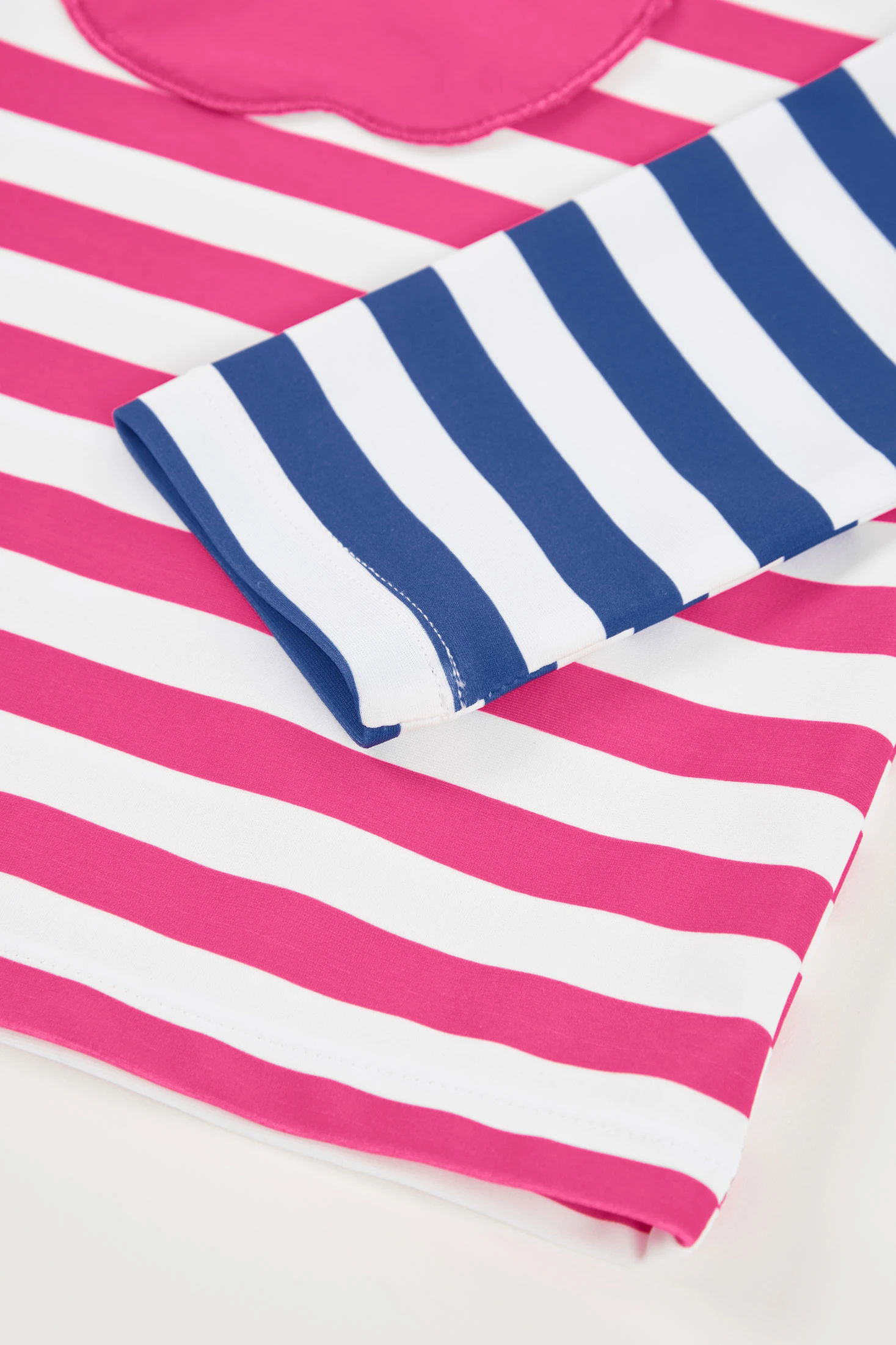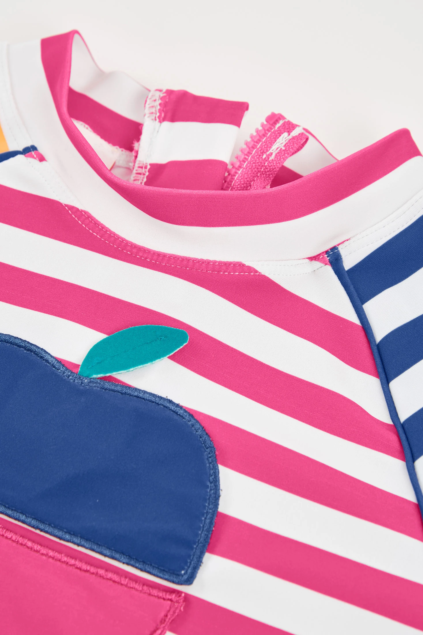 Mehrfarbiges technisches T-Shirt für Mädchen mit zertifiziertem UPF50+-Sonnenschutz, ideal für Aktivitäten im Freien. Der Streifendruck in Gelb, Rosa und Blau, kombiniert mit einer lustigen Apfelzeichnung auf der Vorderseite, bietet einen fröhlichen und lässigen Look. Die langen Ärmel bieten zusätzlichen Sonnenschutz. Aus leichtem und bequemem Material gefertigt, erhältlich in Größen von 12 Monaten bis 14 Jahren.