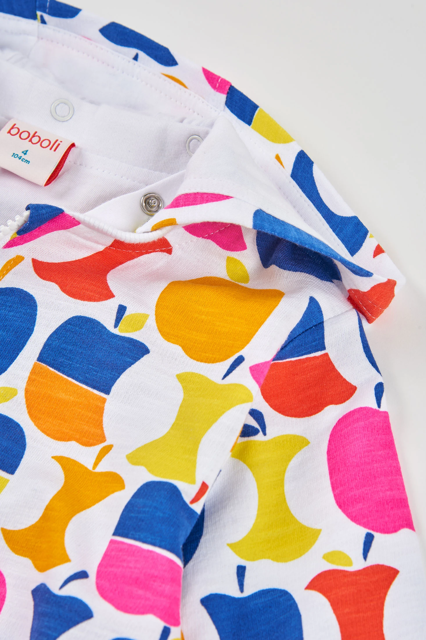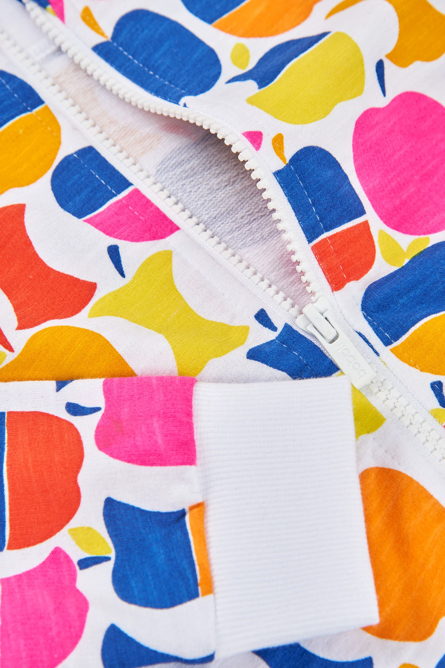 der weiße Hintergrund hebt die farbenfrohen Details hervor und macht diese Jacke zu einer fröhlichen und funktionalen Wahl.