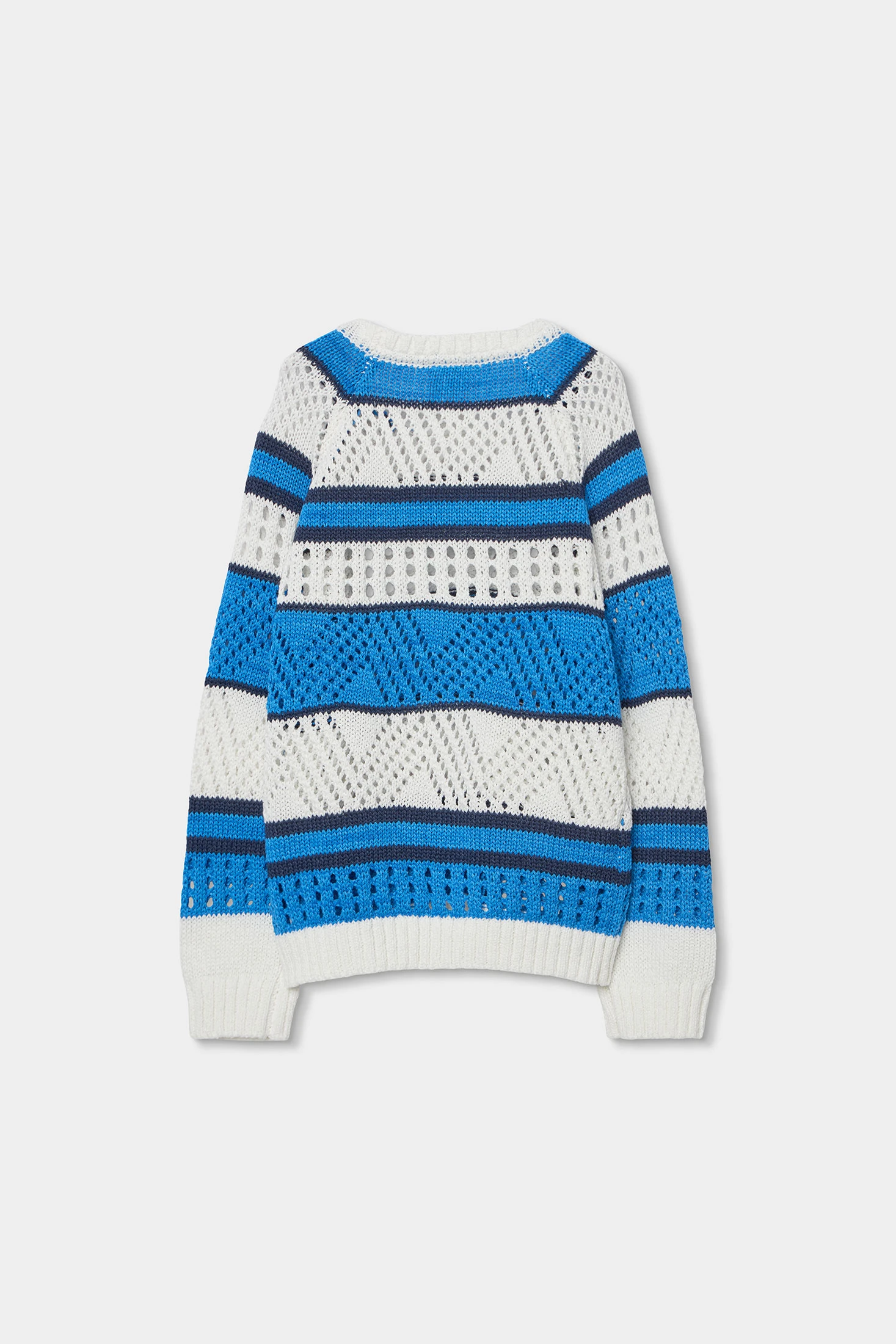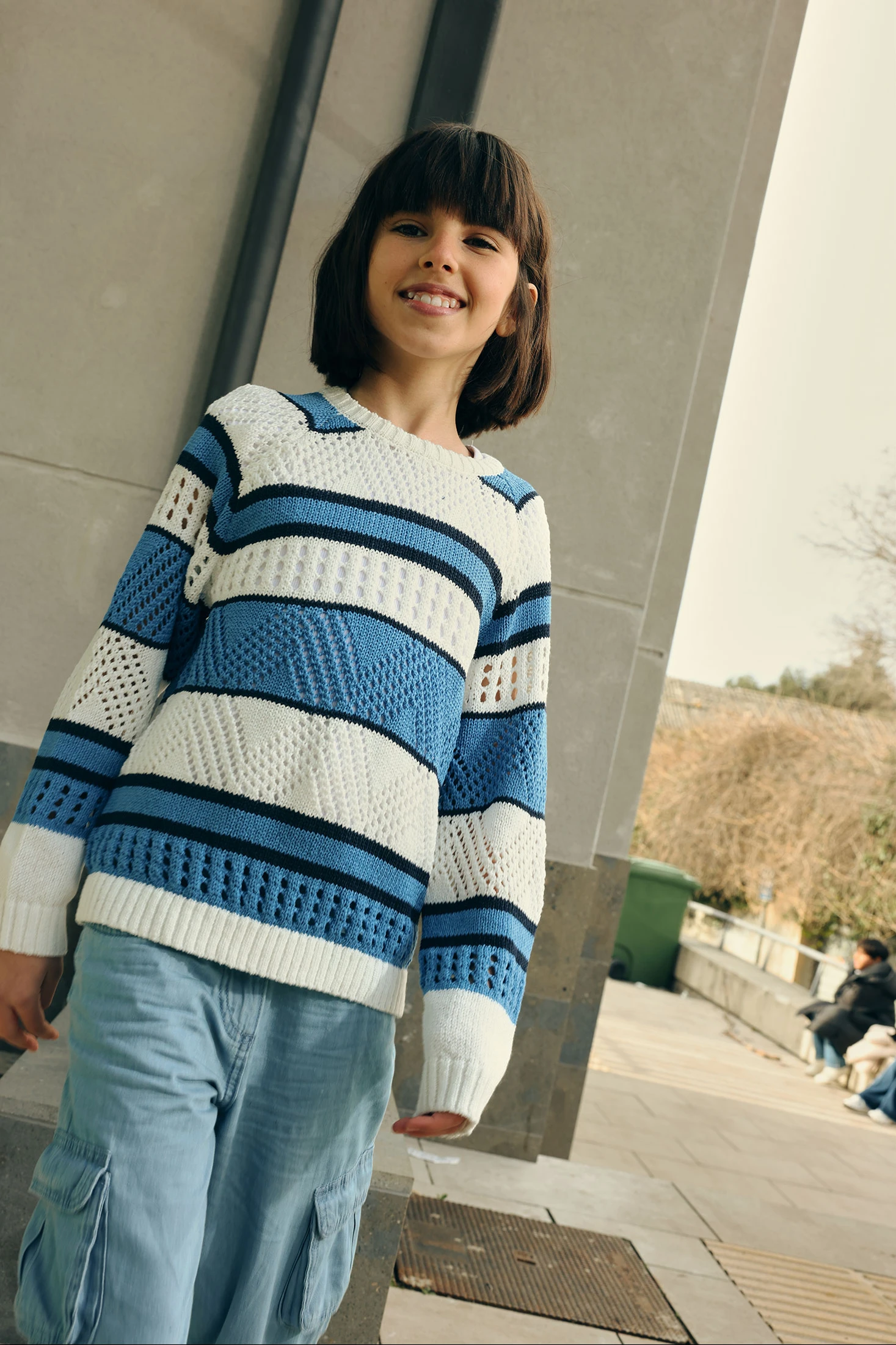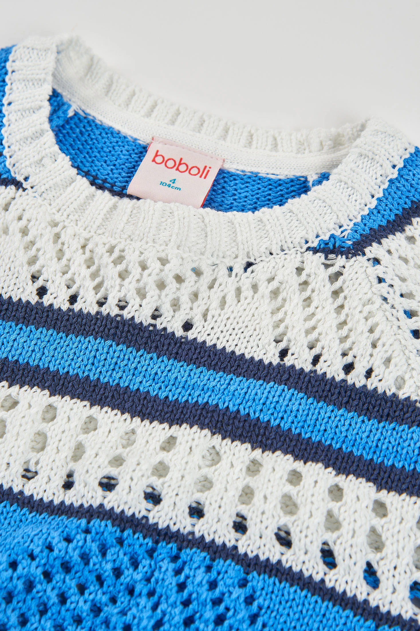 Gestreifter Baumwollpullover für Mädchen, perfekt für Herbst und Winter. Er verfügt über ein Streifendesign in Weiß- und Blautönen, mit offenen Gewebedetails, die Textur und Stil verleihen. Das Baumwollmaterial sorgt für Komfort und Wärme, ideal für kalte Tage. Erhältlich in Größen von 12 Monaten bis 14 Jahren, passt er sich verschiedenen Altersstufen an. Sein Rundhals und die langen Ärmel machen ihn praktisch für den täglichen Gebrauch. Kombiniere ihn mit Jeans oder Leggings für einen legeren und bequemen Look.