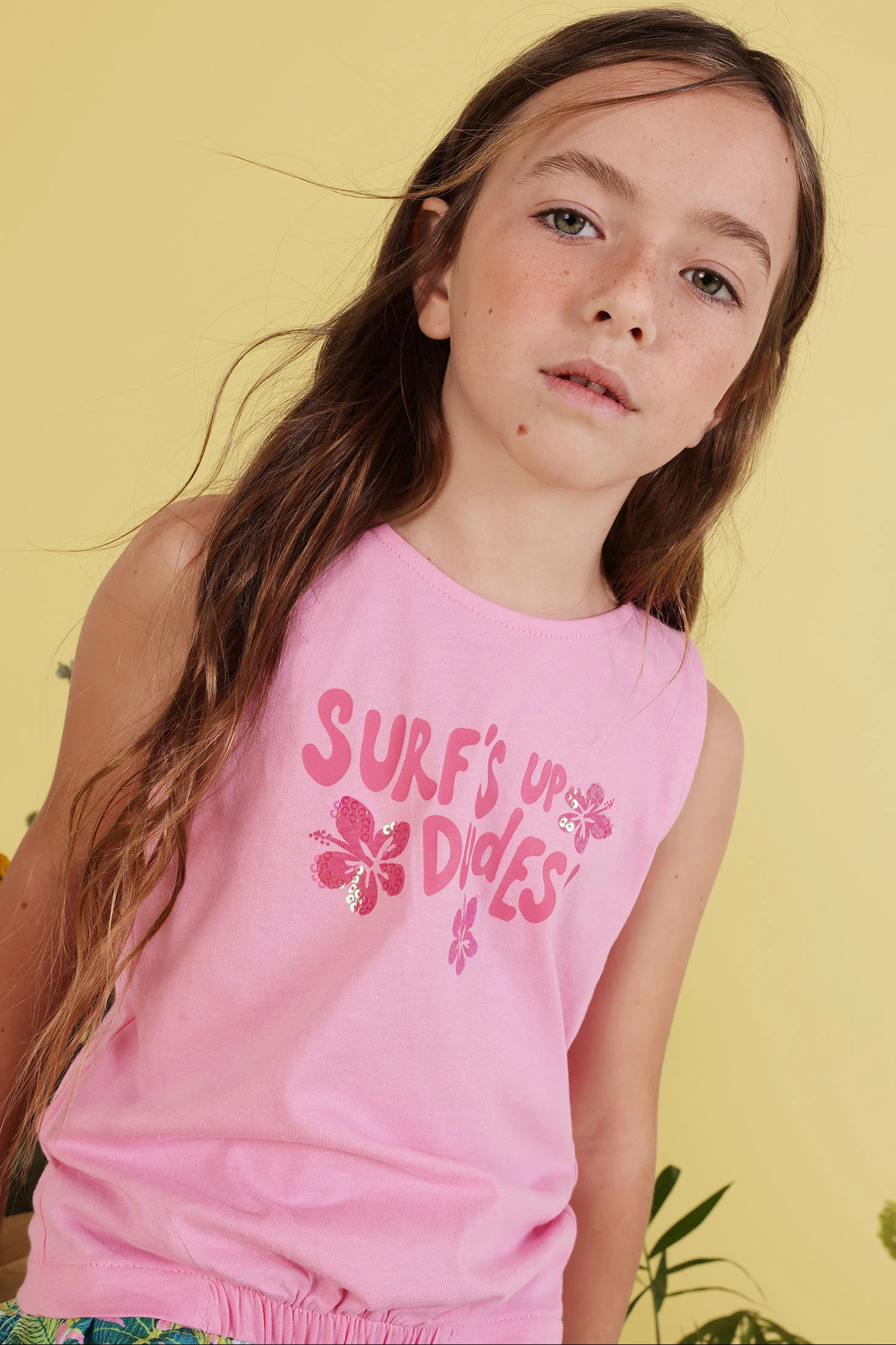 Ärmelloses T-Shirt für Mädchen, gefertigt aus weicher rosa Baumwolle, ideal für die Sommersaison. Es zeigt ein attraktives Design mit lustigem Text und floralen Details, die einen fröhlichen Akzent setzen. Gedacht für Mädchen von 2 bis 14 Jahren, bietet es Komfort und Frische für den Alltag. Mit einem Rundhalsausschnitt ist es perfekt für die Kombination mit Shorts oder Röcken an sonnigen Tagen. Sein lässiger und ungezwungener Stil macht es zu einer vielseitigen und praktischen Option für den Kinderkleiderschrank.