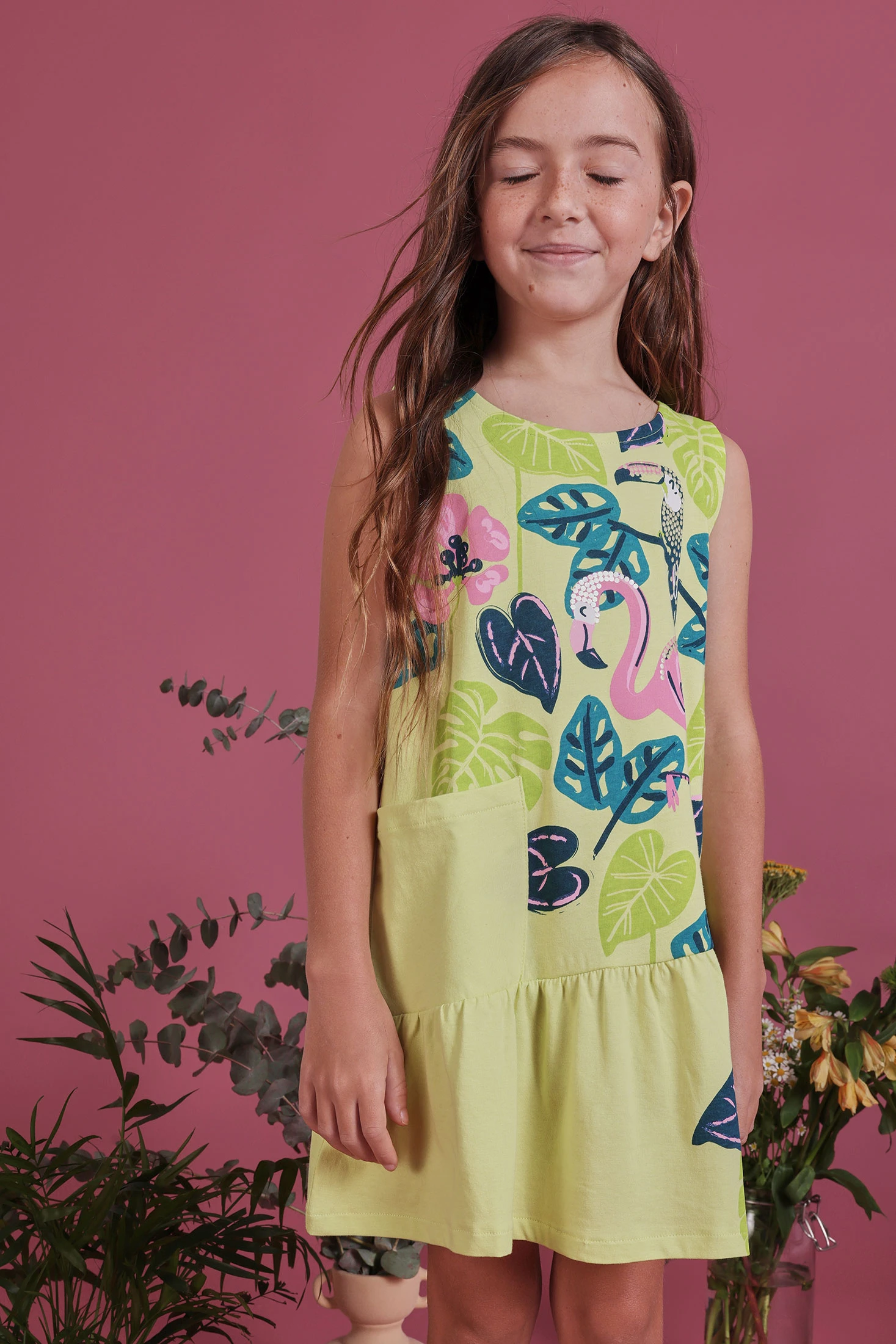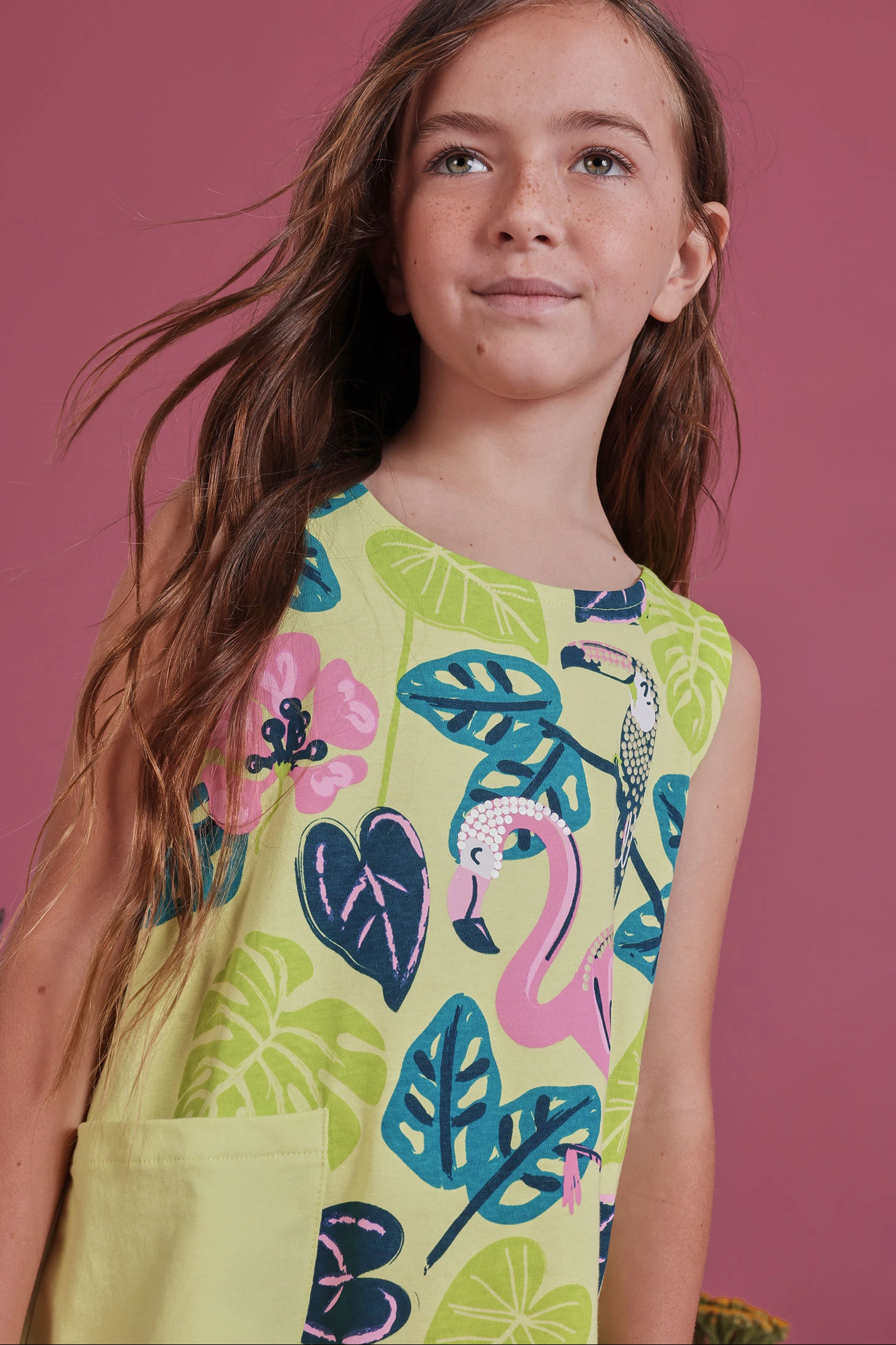 Bezauberndes Strickkleid für Mädchen, perfekt für die Frühlings- und Sommersaison. Mit einer leuchtenden grünen Farbe und einem lustigen Muster aus Blättern und Vögeln ist es ideal für kleine Entdeckerinnen. Das Material ist weich und bequem, ideal für den täglichen Gebrauch. Verfügbar in Größen von 2 bis 14 Jahren, passt es für alle Kinderjahre. Sein ärmelloses Design macht es zu einer frischen und vielseitigen Wahl für jede lässige Gelegenheit. Ein fröhliches und farbenfrohes Kleidungsstück, das dem Kleiderschrank Ihres Mädchens Stil verleiht.