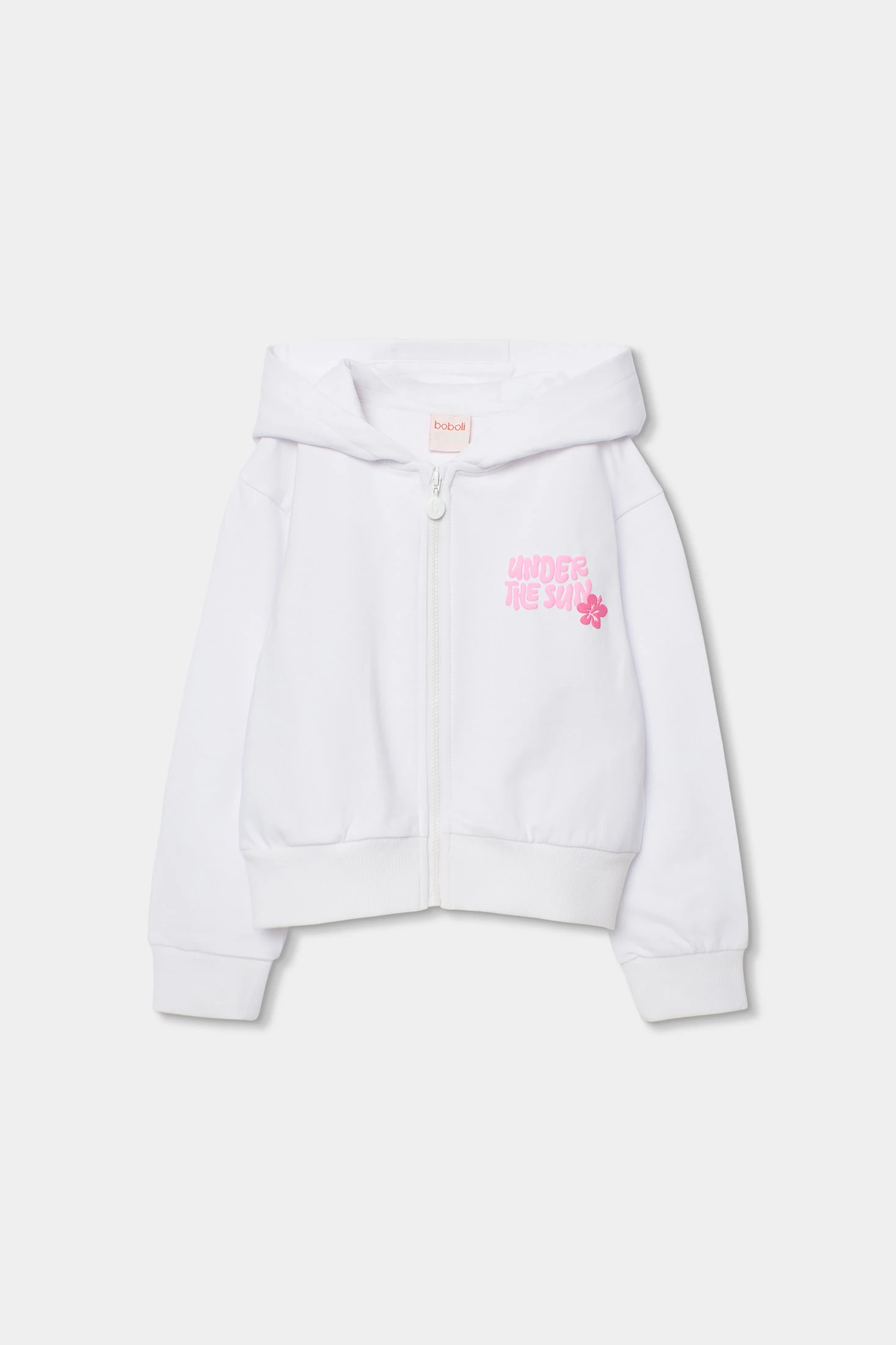 Fleece-Jacke in Weiß für Mädchen. Perfekt für die ersten Frühlingstage oder die Sommernächte, in denen es noch frisch wird. Aus einem weichen Stoff gefertigt, bietet sie Komfort und Bewegungsfreiheit. Auf der Rückseite befindet sich ein Design mit großen grünen Blättern und einer kleinen Signatur auf der Brust. Verfügbar in Größen von 2 bis 14 Jahren, um sich dem Wachstum eines jeden Mädchens anzupassen.