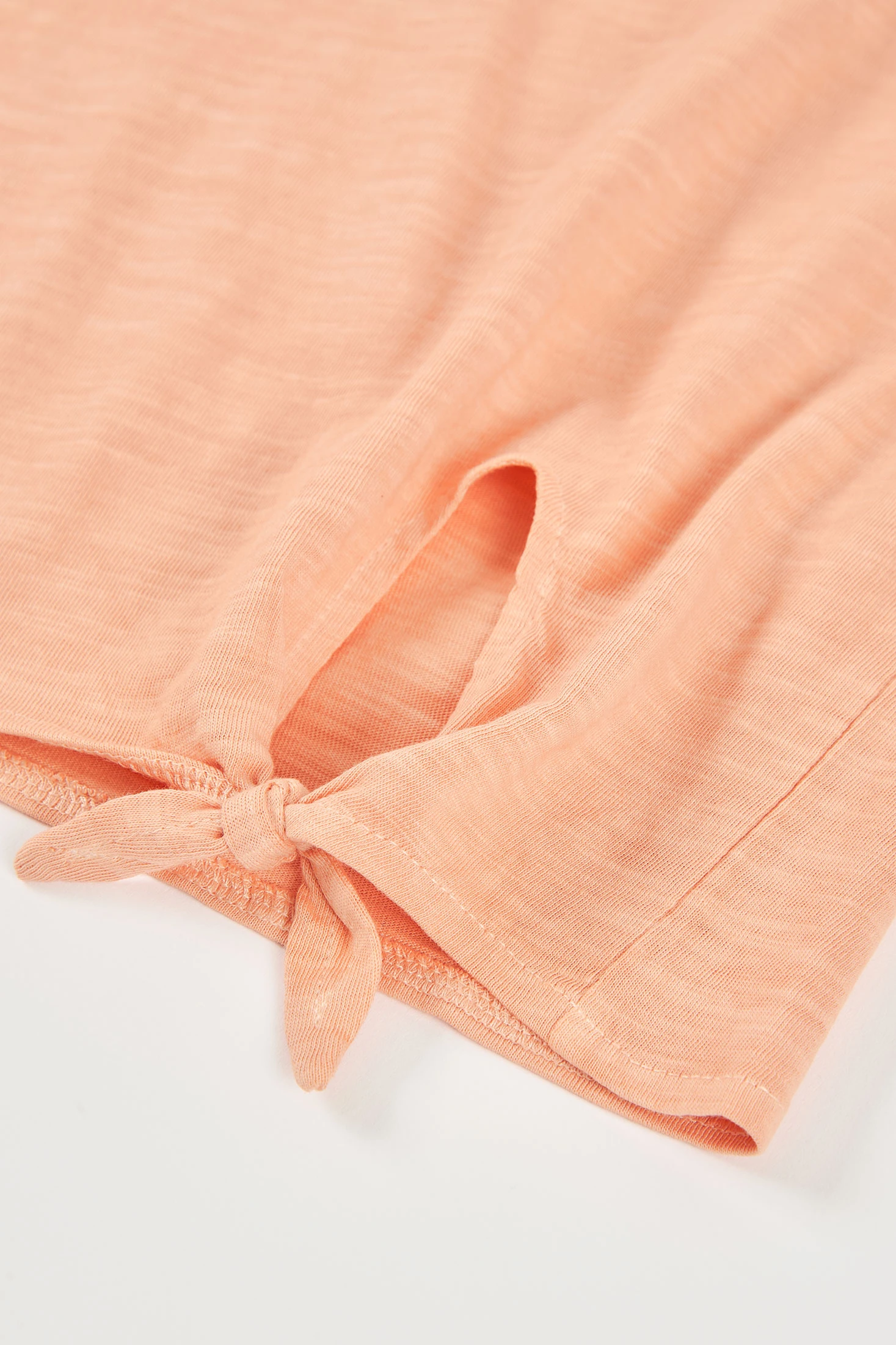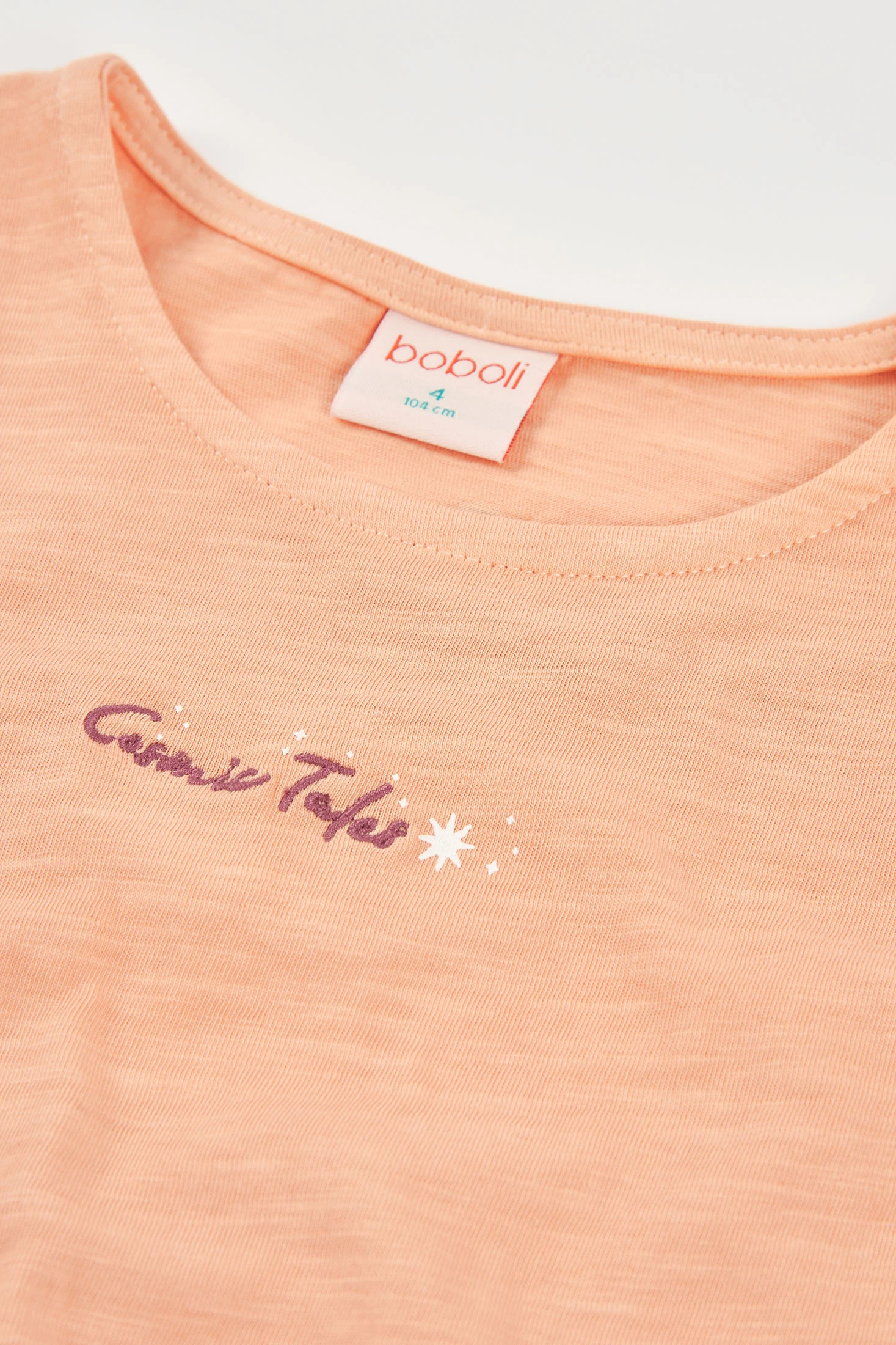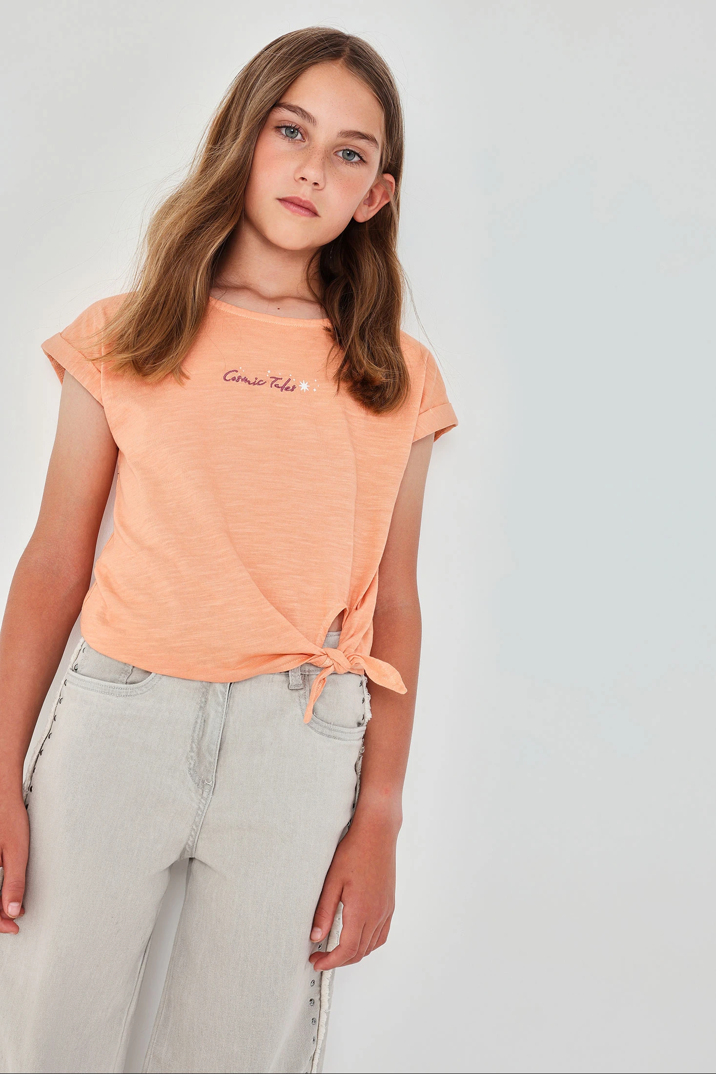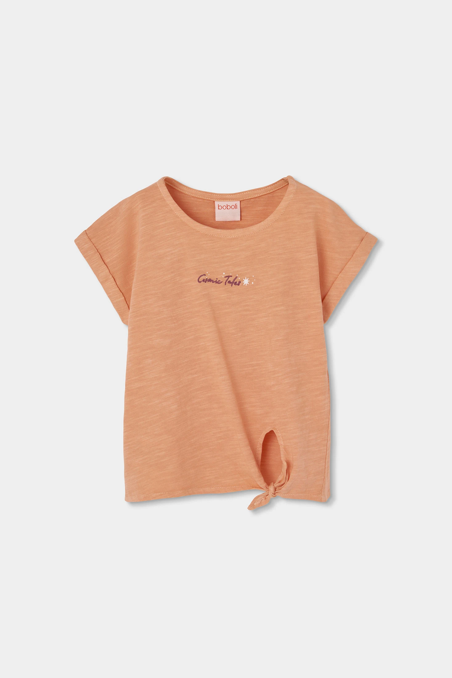 Mädchen-T-Shirt aus flammgesponnener Baumwolle in Lachsfarbe, perfekt für Frühling und Sommer. Ihr leichtes und atmungsaktives Material bietet den ganzen Tag über Komfort. Mit einem Knoten-Design am Saum fügt es eine moderne und lustige Note hinzu. Ein Textdetail auf der Vorderseite verleiht Stil. Erhältlich in Größen von 2 bis 14 Jahren, ideal zum Kombinieren mit Jeans oder Röcken für lässige Looks. Ein vielseitiges und frisches Kleidungsstück für die Kinder-Garderobe.
