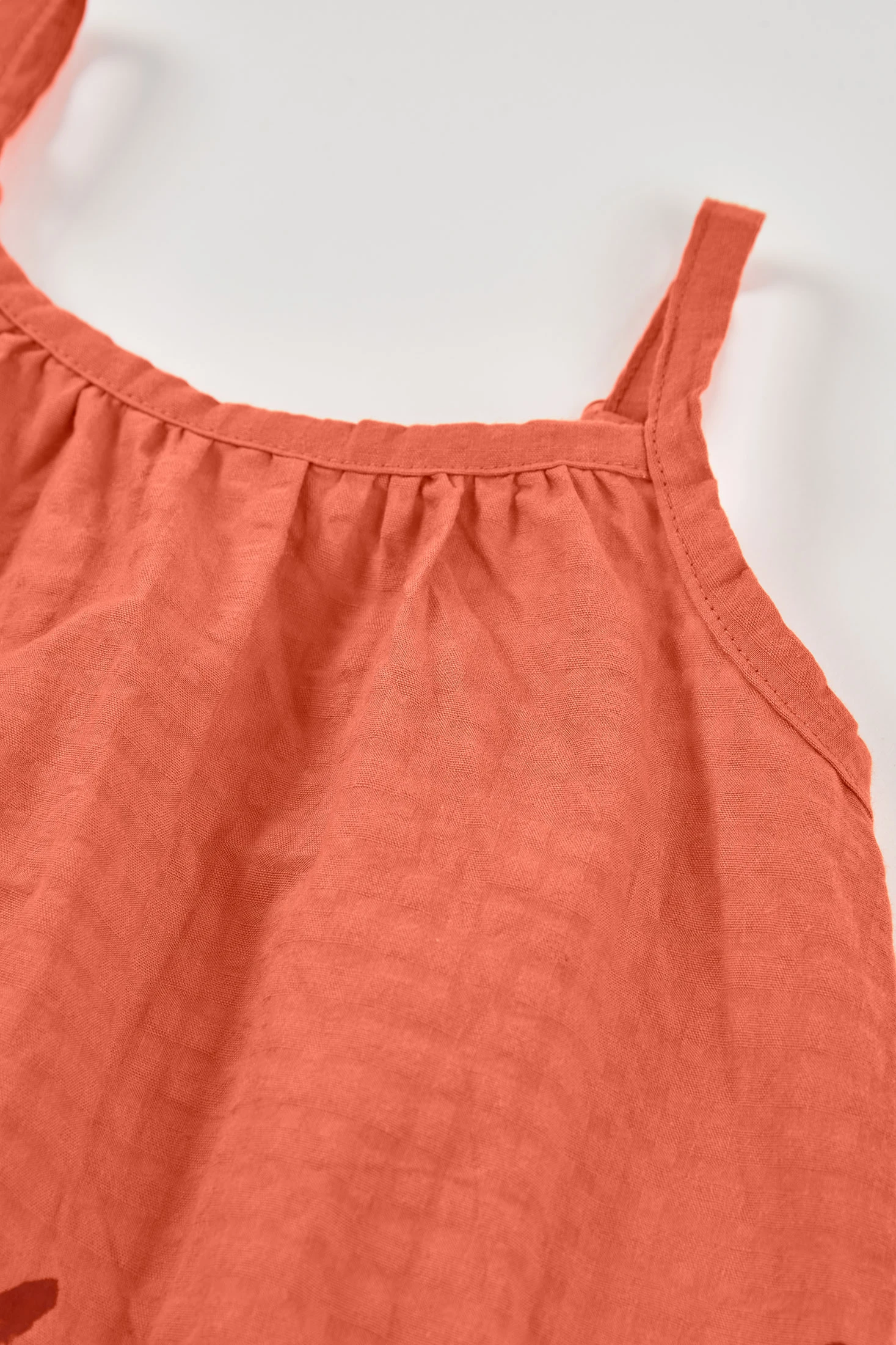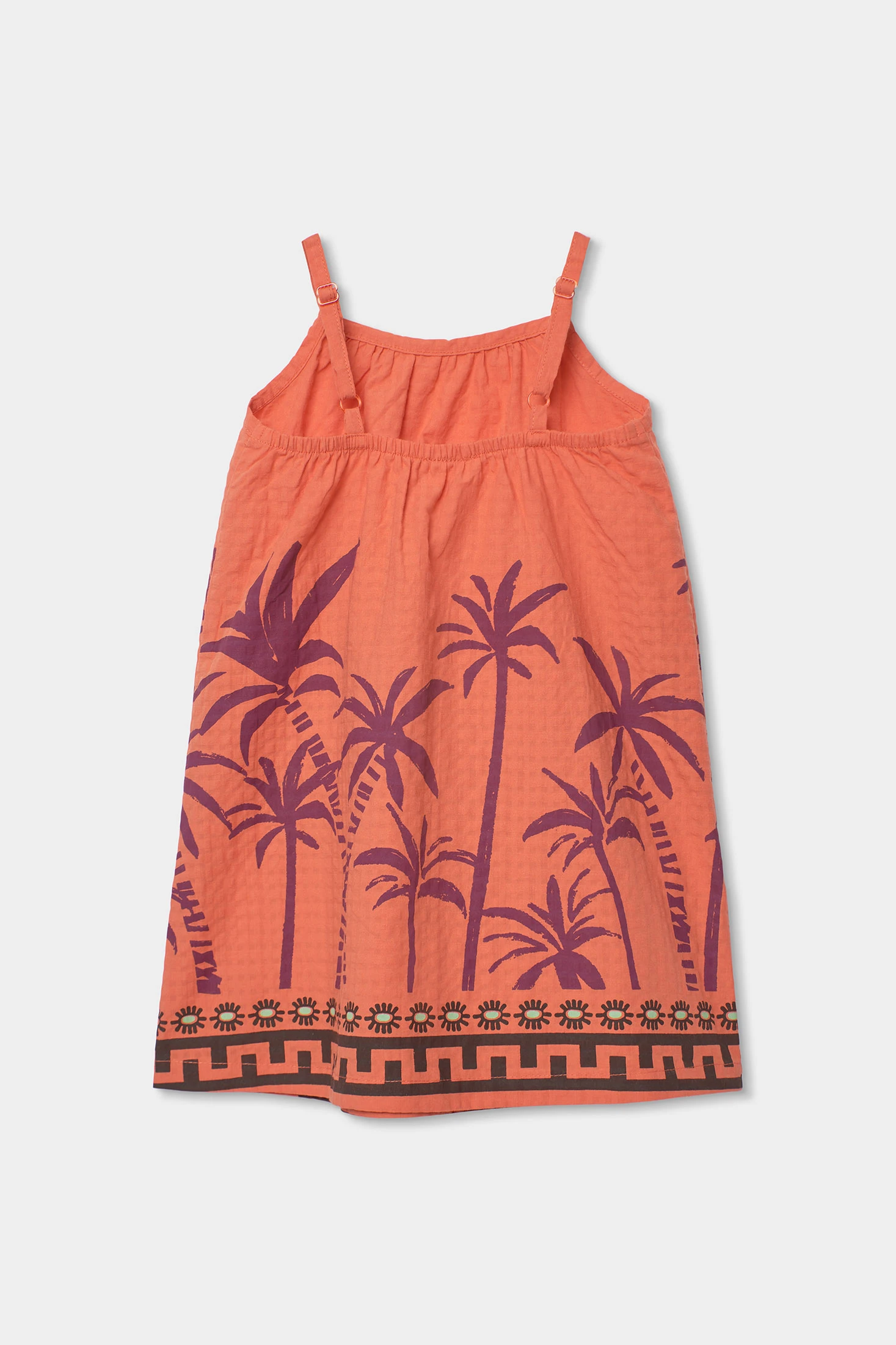 Orangefarbenes Kleid, ideal für warme Tage. Sein ärmelloses Design mit dünnen Trägern sorgt für Frische und Komfort, perfekt für den Sommer. Der Palmen-Print verleiht dem Look einen tropischen und verspielten Touch. Erhältlich in Größen von 2 bis 14 Jahren, passt es sich dem Wachstum des Mädchens an. Das weiche und leichte Material gewährleistet ganztägigen Komfort. Eine fröhliche Wahl, die sich leicht mit anderen Stücken wie Leggings, Hemden oder Jacken kombinieren lässt.