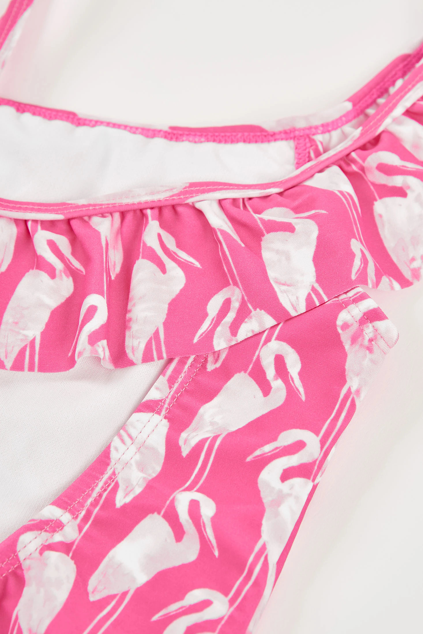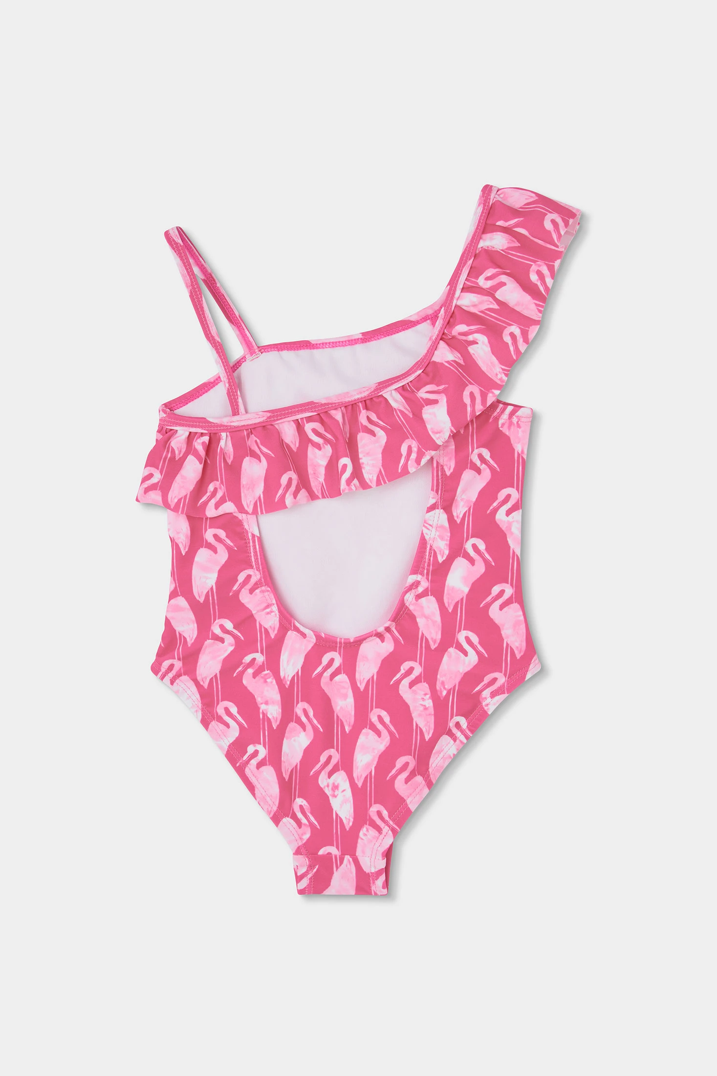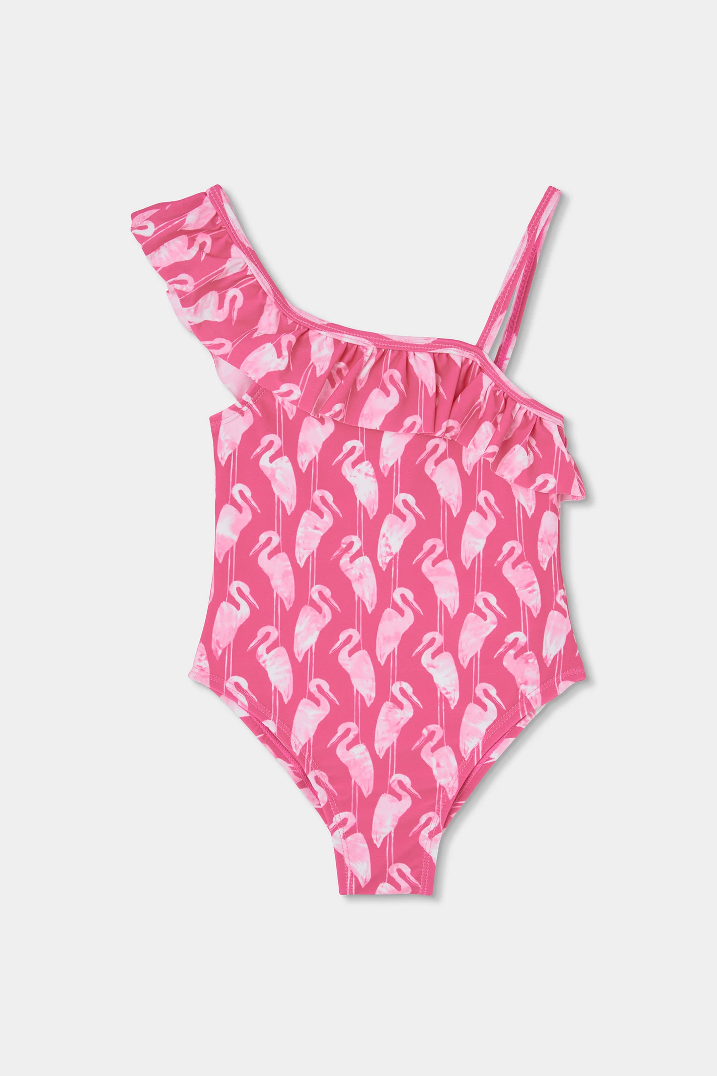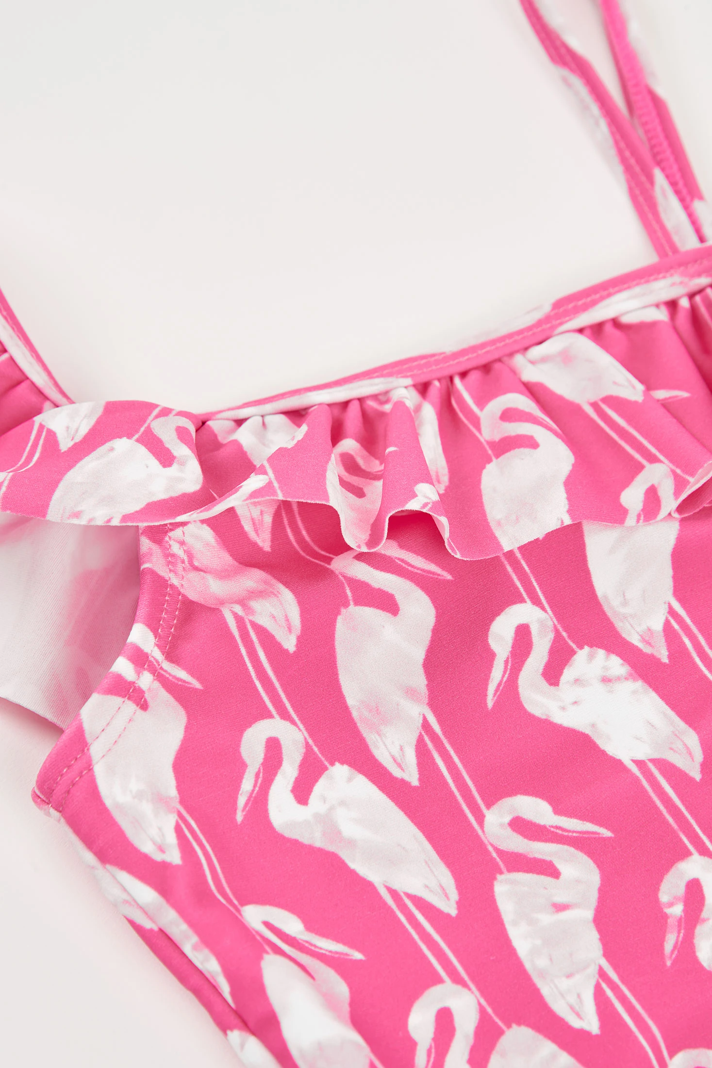 Bedruckter Badeanzug für Mädchen, perfekt für Sommertage. Hergestellt aus elastischem Material und mit UPF50 Sonnenschutz, bietet er Komfort und Bewegungsfreiheit. Sein rosafarbenes Design zeigt einen Druck mit Vögeln auf einem neonrosafarbenen Hintergrund. Das Kleidungsstück enthält ein Rüschen-Detail an einer Schulter, das einen einzigartigen Stil verleiht. Erhältlich in Größen von 2 bis 14 Jahren. Ideal für den Strand oder das Schwimmbad, ist dieser Badeanzug eine bunte und fröhliche Option, um die Sonne zu genießen.