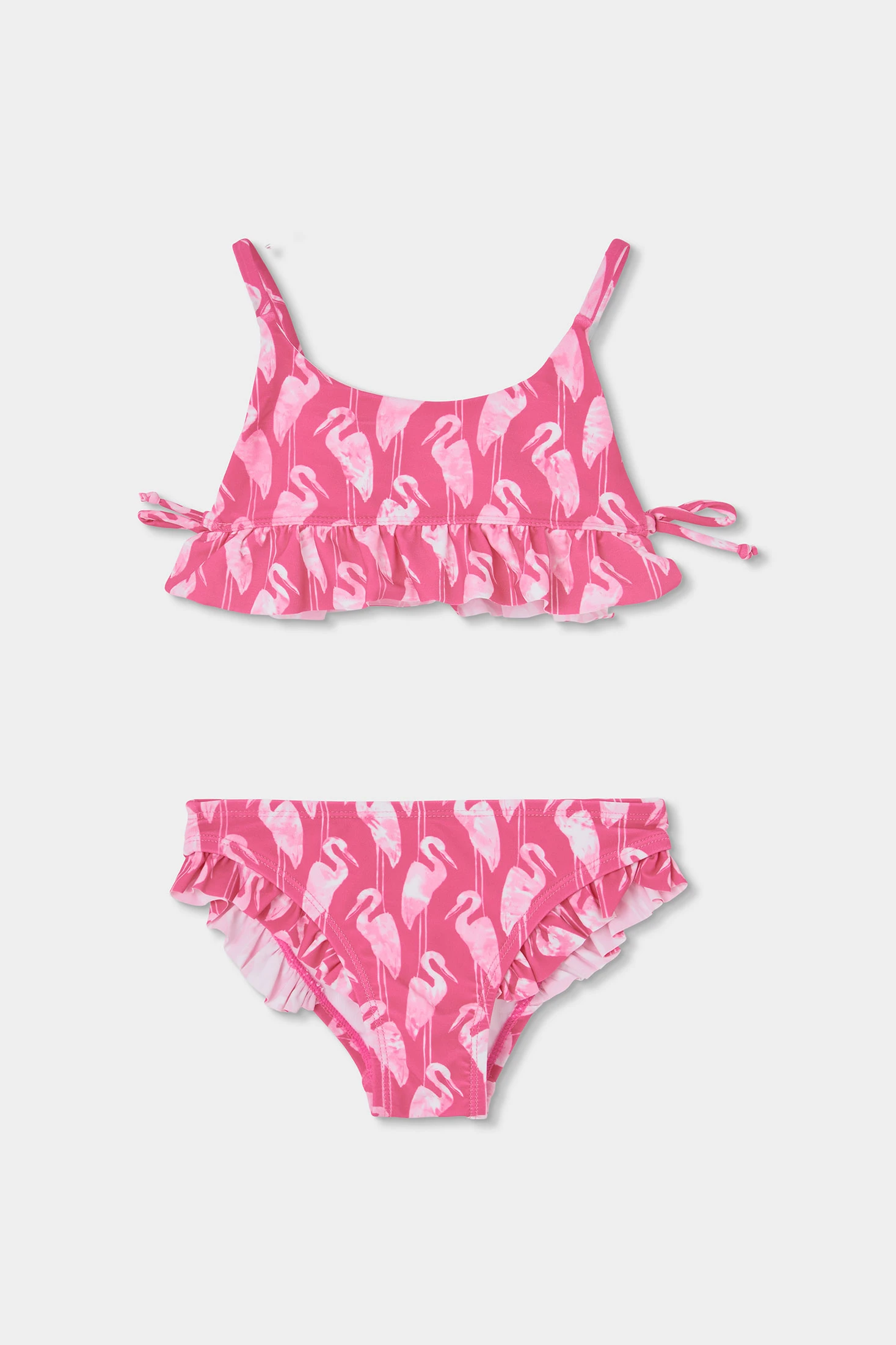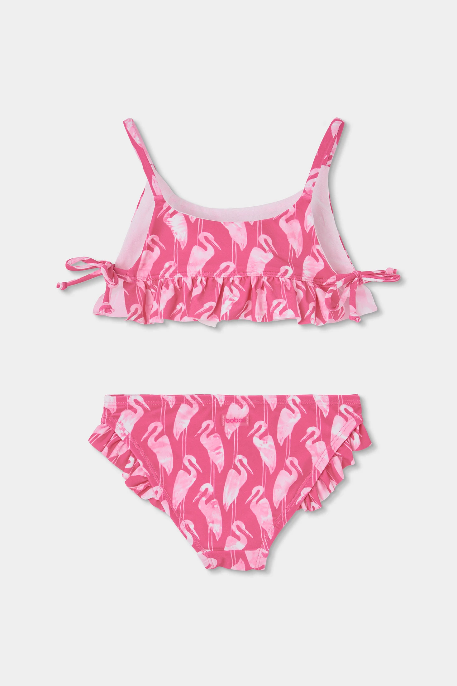 Bedruckter Bikini für Mädchen, ideal für die Sommersaison. Hergestellt aus einem elastischen Material mit UPF50 Sonnenschutz und Komfort, bietet er Bewegungsfreiheit. Er zeigt sich in einem leuchtenden Rosa mit einem Vogelmuster, das einen lustigen Akzent setzt. Er hat Volantdetaillierungen am Saum des Oberteils und an der Hose. Verfügbar in Größen von 2 bis 14 Jahren, perfekt für einen stilvollen und bequemen Tag am Strand oder Pool.