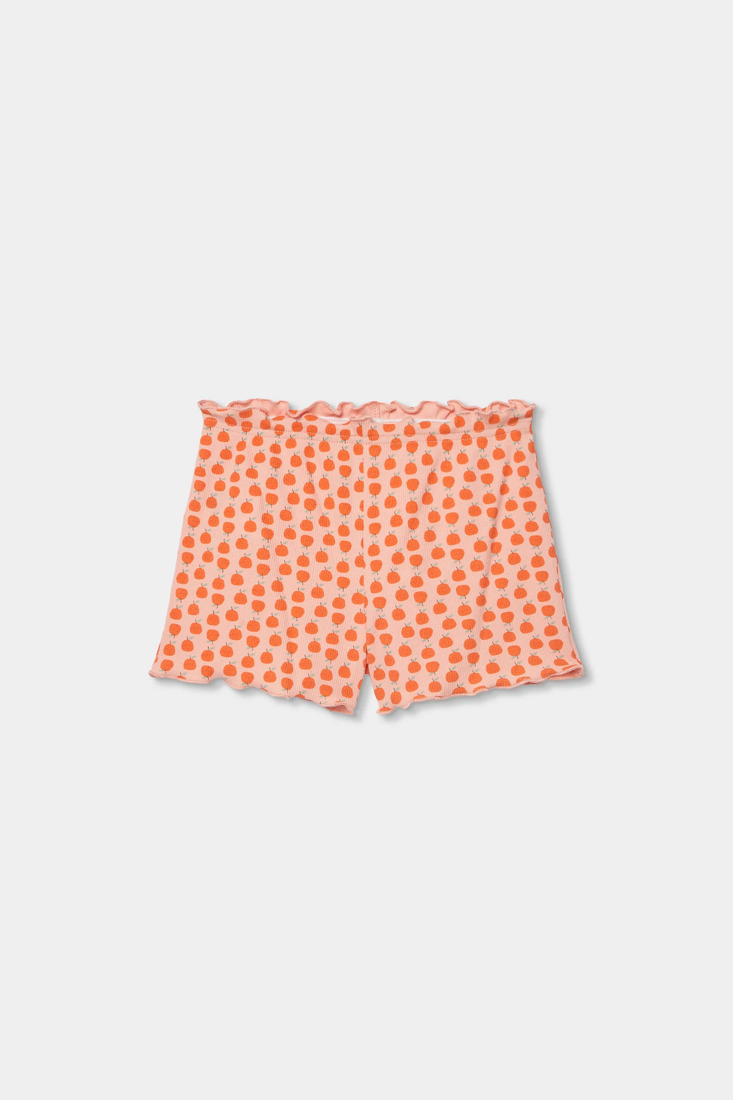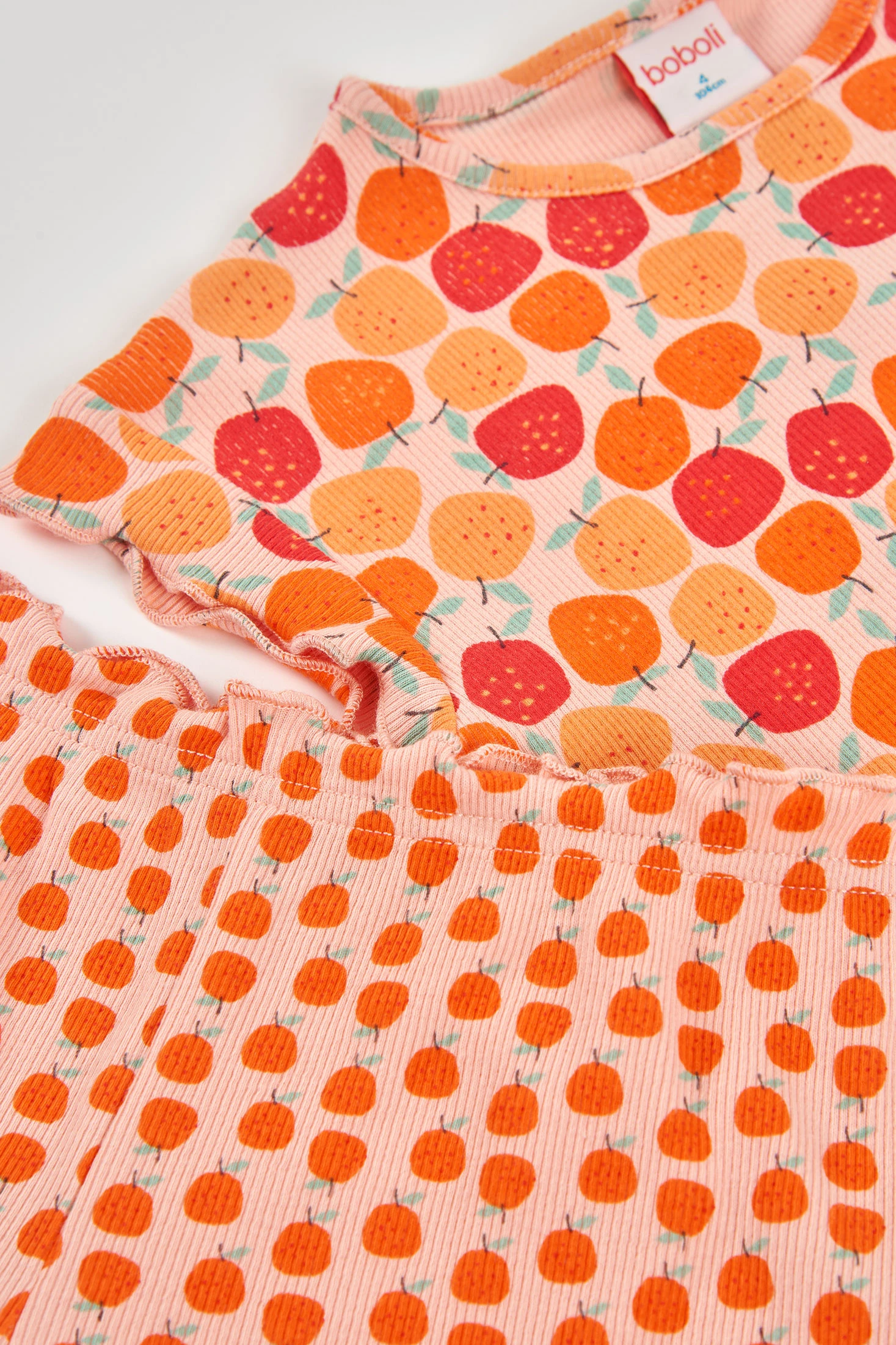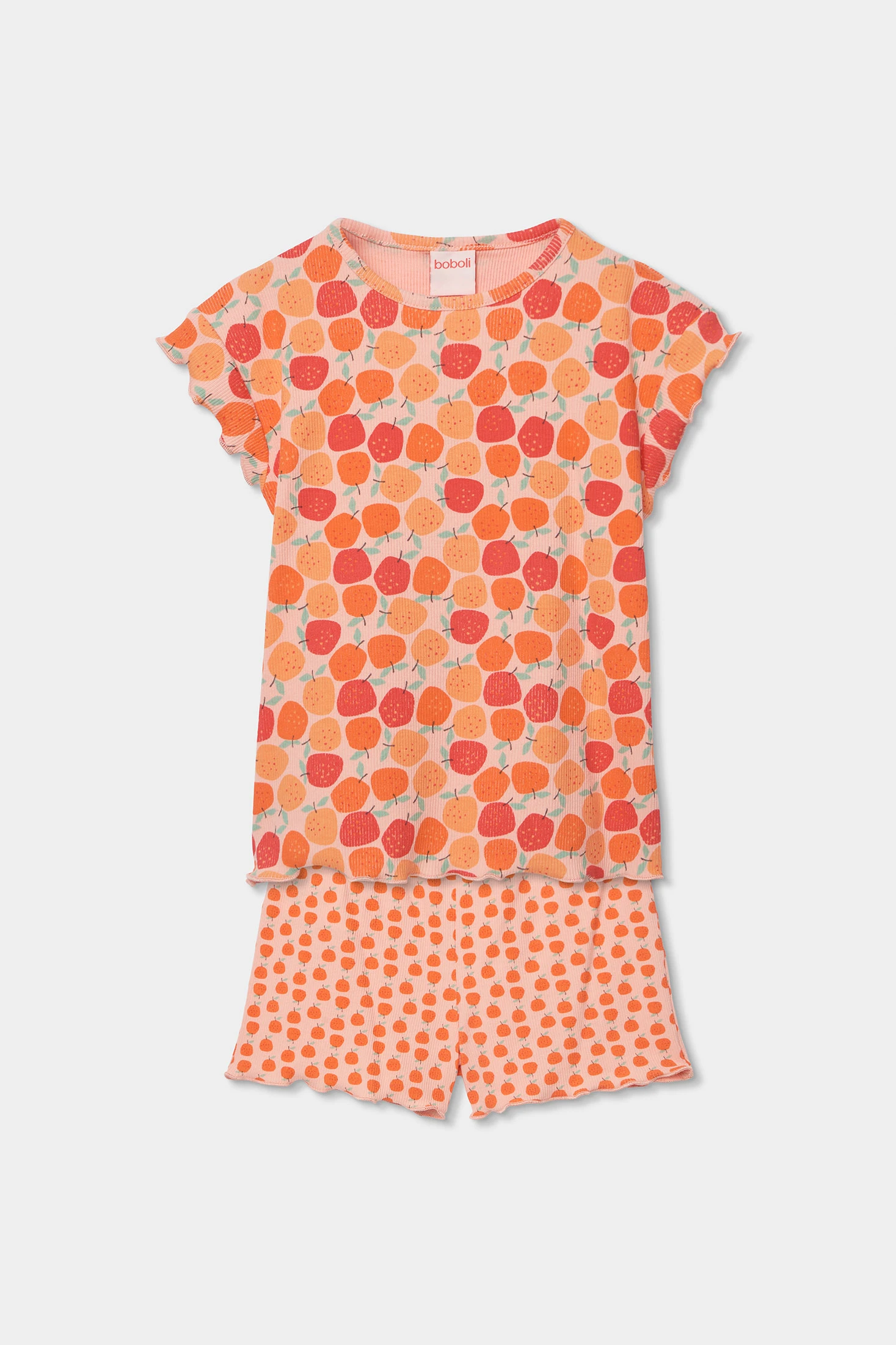 Baumwoll-Pyjama für Mädchen, perfekt um Komfort während der Nächte zu gewährleisten. Er hat einen fröhlichen Fruchtprint in Orangetönen und Rot, der einen lustigen und farbenfrohen Touch verleiht. Er umfasst ein kurzärmeliges T-Shirt und kurze Hosen, ideal für warme Klimazonen. Erhältlich in Größen von 0 Monaten bis 12 Jahren, passt sich dem Wachstum der Mädchen an. Sein weiches und atmungsaktives Gewebe ist ideal für den täglichen Gebrauch und bietet Komfort während der Ruhezeit.
