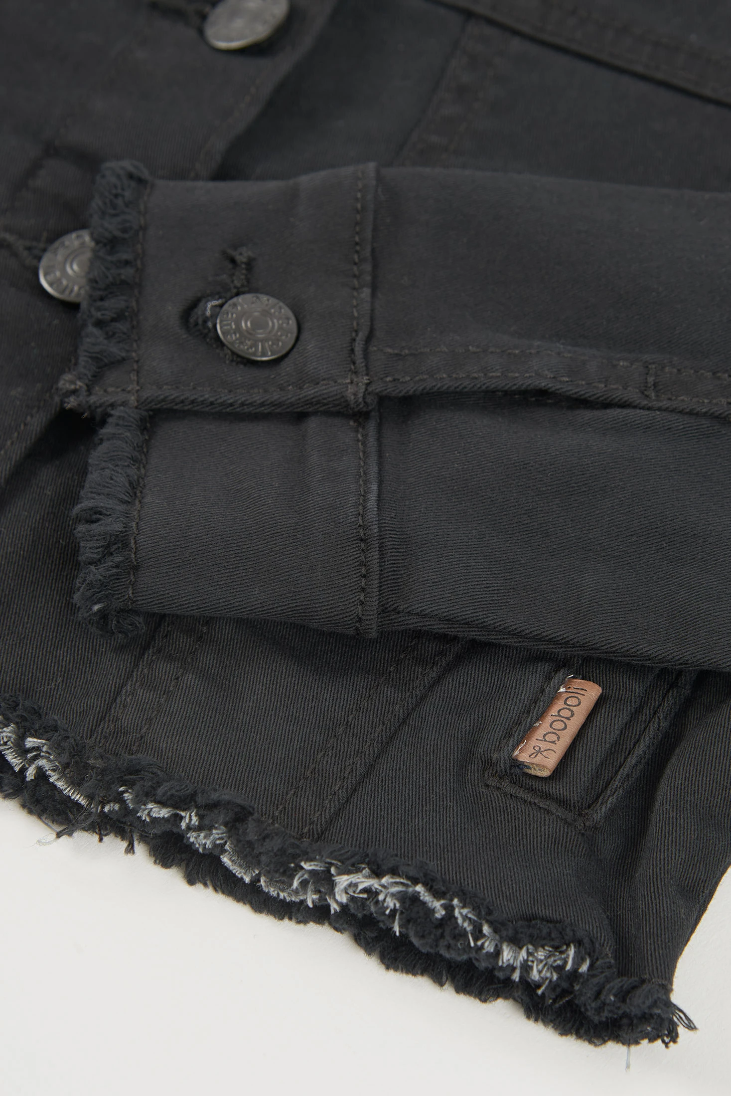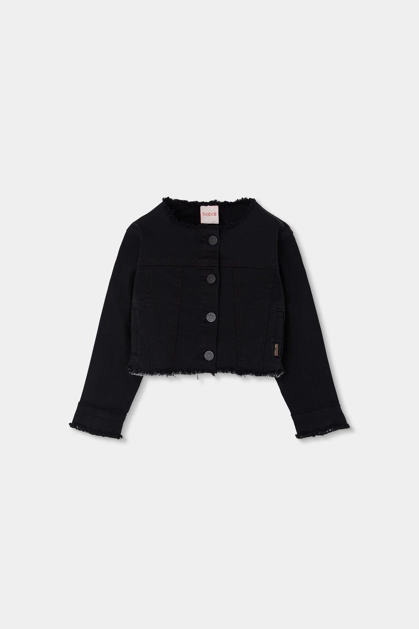 Schwarze Denim-Jacke für Mädchen, ideal für die Übergangszeit. Hergestellt aus einem strapazierfähigen und bequemen Material, bietet sie Stil und Schutz. Ihr Design umfasst vordere Knöpfe und lange Ärmel, mit ausgefransten Details an den Rändern, die einen modernen Touch verleihen. Sie ist in Größen von 12 Monaten bis 14 Jahren erhältlich und passt sich dem Wachstum des Mädchens an. Es ist ein vielseitiges Kleidungsstück, das sich hervorragend mit T-Shirts und lässigen Hosen für einen urbanen und aktuellen Look kombinieren lässt.