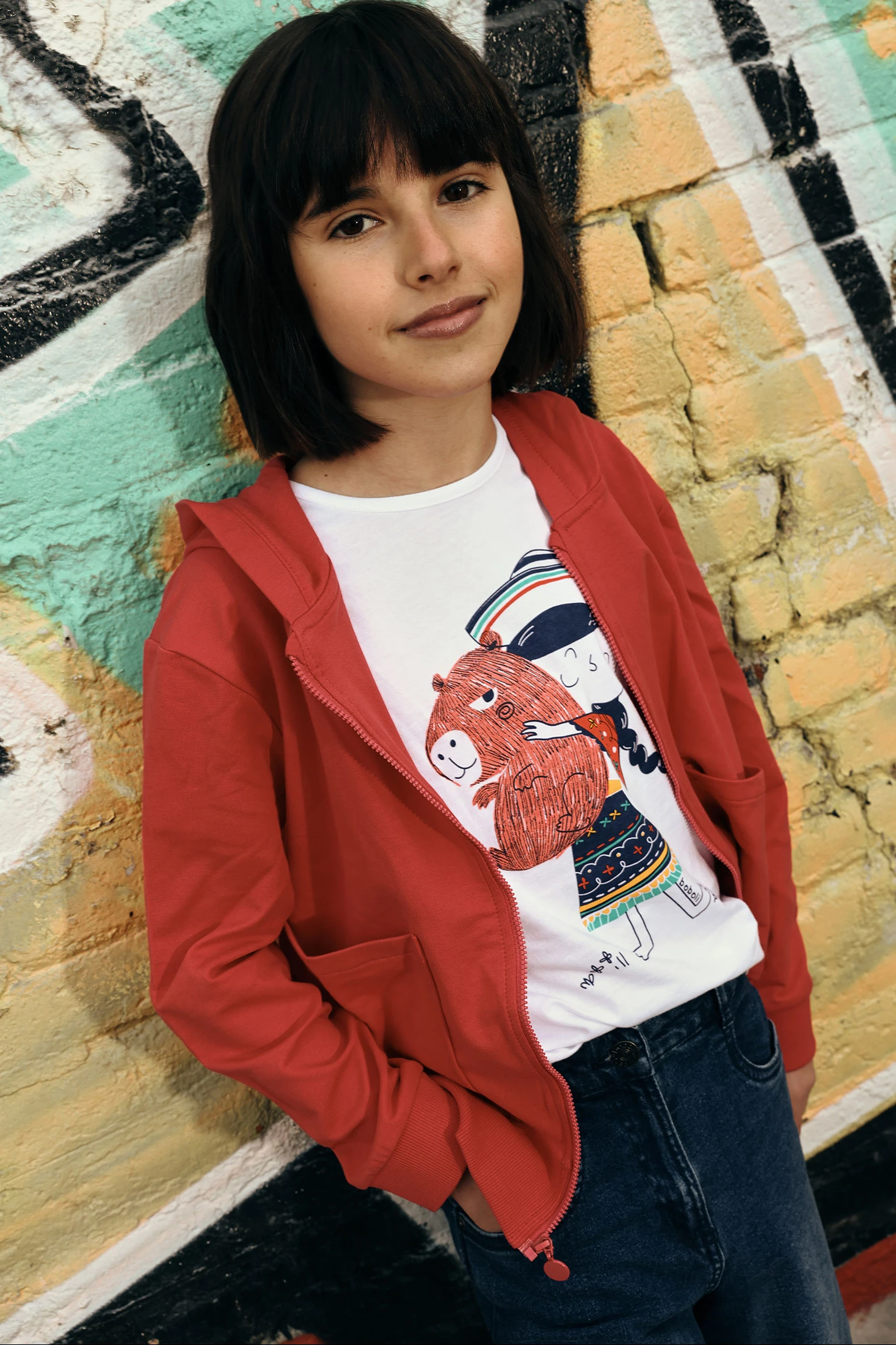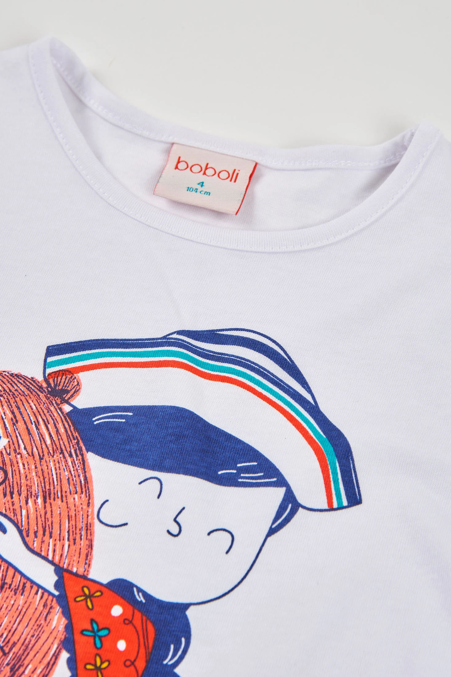 Baumwoll-Strick-T-Shirt für Mädchen mit einem bezaubernden Druck eines Mädchens mit bunten Details. Aus weicher Baumwolle gefertigt, ist es ideal für täglichen Komfort. Sein Design mit kurzen Ärmeln und Rundhalsausschnitt macht es perfekt zum Kombinieren mit Hosen oder Röcken. Verfügbar in Größen von 12 Monaten bis 14 Jahren, passt es zu verschiedenen Wachstumsphasen. Die weiße Farbe bietet Vielseitigkeit und macht es zu einem leicht kombinierbaren Kleidungsstück mit anderen Teilen der Kinder-Garderobe.