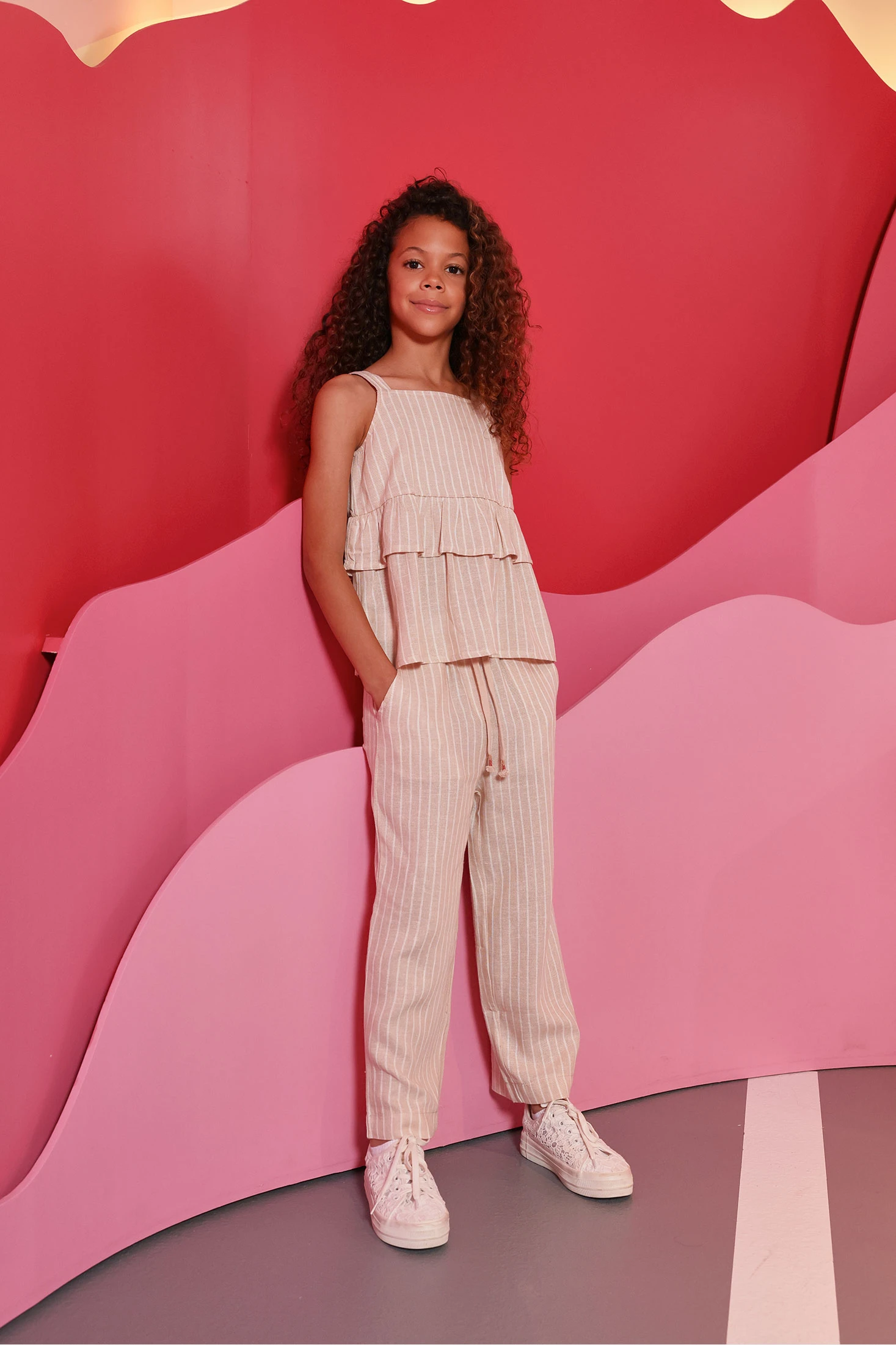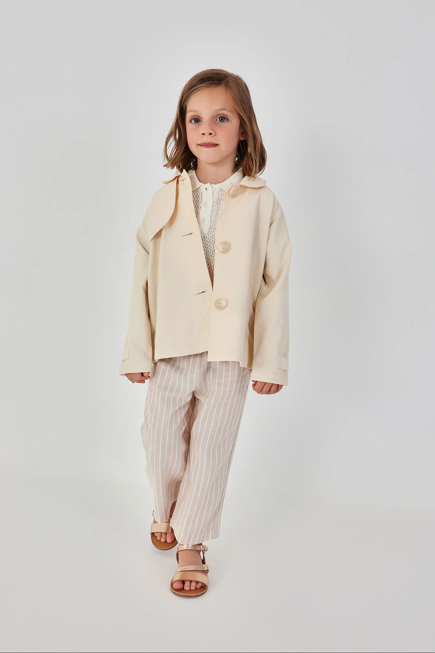 Gestreifte Leinenhose für Mädchen, ideal für warme Klimazonen dank ihres atmungsaktiven und leichten Materials. Sie zeigt ein Design in Beige mit feinen vertikalen Linien, das ihr einen eleganten und frischen Touch verleiht. Der elastische Bund mit verstellbarem Kordelzug sorgt für Komfort und eine gute Passform. Erhältlich in Größen von 12 Monaten bis 10 Jahren, ist es ein vielseitiges Kleidungsstück, das Bewegungsfreiheit bietet. Die Seitentaschen fügen Funktionalität hinzu, und der neutrale Stil macht es einfach, es mit Blusen und T-Shirts für einen lässigen und schicken Look zu kombinieren.