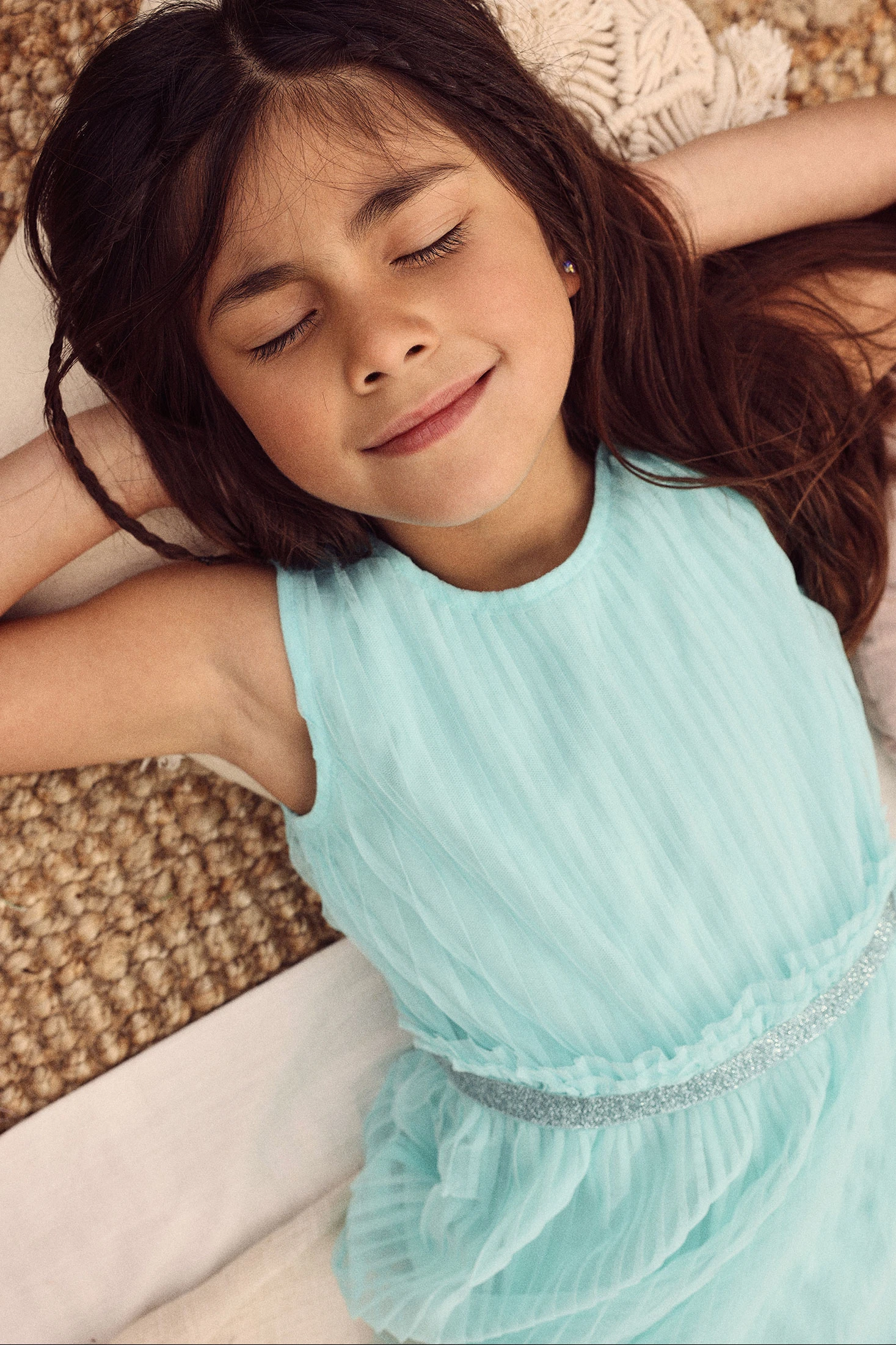 Plissiertes Tüllkleid in Türkisgrün, ideal für besondere Anlässe. Hergestellt aus einem leichten und bequemen Material, verfügt es über ein ärmelloses Design mit einem glänzenden silbernen Bund, der dem Kleidungsstück eine elegante Note verleiht. Erhältlich in Größen von 12 Monaten bis 10 Jahren. Der Stoff ermöglicht freie Bewegungen, perfekt, um es bequem zu halten, während sie spielt oder tanzt. Sein schicker Look lässt sich gut mit leichten Jacken oder zarten Accessoires kombinieren, was es zu einer vielseitigen und stilvollen Wahl für jede Veranstaltung macht.
