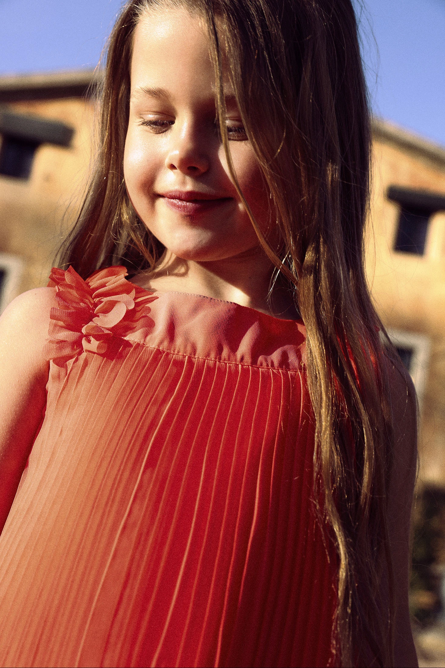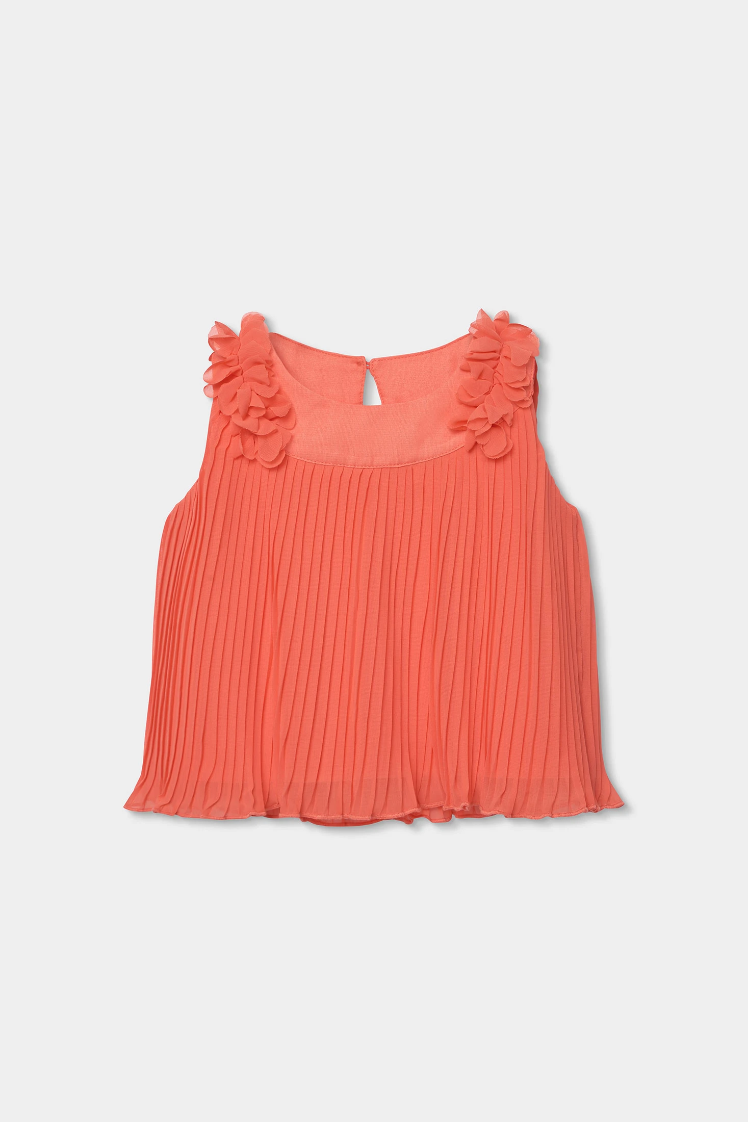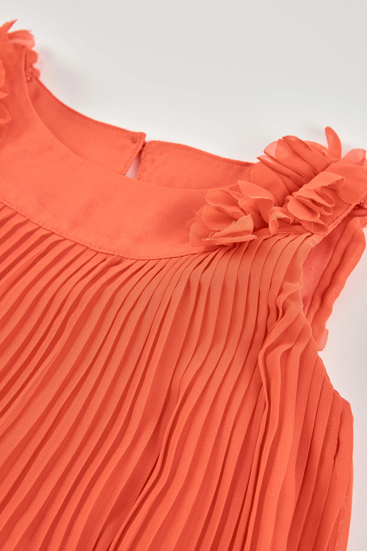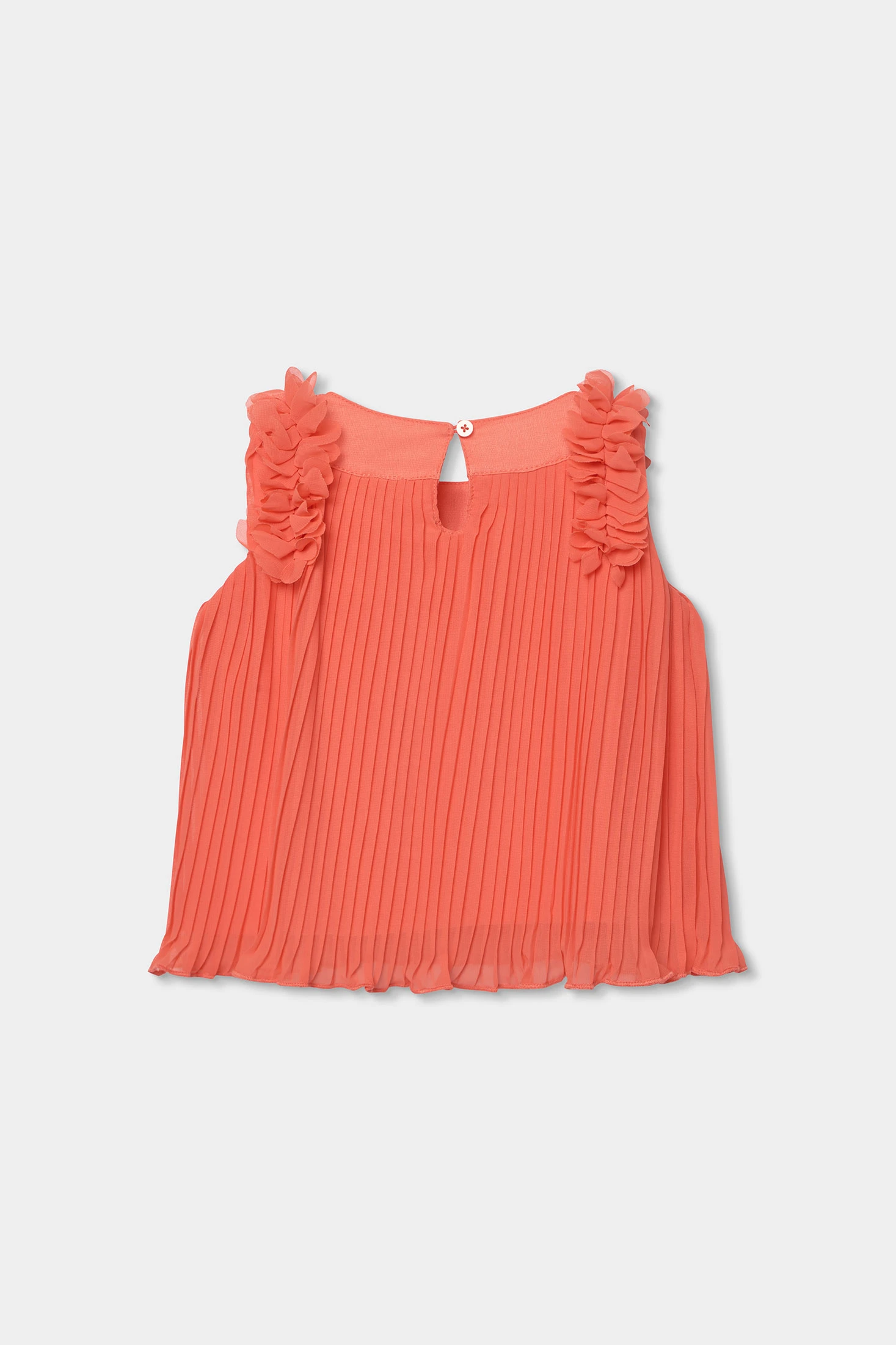 Plissierte Chiffonbluse in Korallenrot, unerlässlich für besondere Anlässe. Ihr leichtes und fließendes Design verleiht Eleganz und Komfort, ideal für Mädchen im Alter von 12 Monaten bis 10 Jahren. Die Rüschen-Details an den Schultern fügen einen schicken und raffinierten Touch hinzu. Perfekt zum Kombinieren mit Hosen oder Röcken, ist dieses Kleidungsstück vielseitig und geeignet für formelle Anlässe oder legere Ausflüge. Die plissierte Textur verleiht ihr eine einzigartige Bewegung und lässt jedes Outfit stilvoll hervortreten.