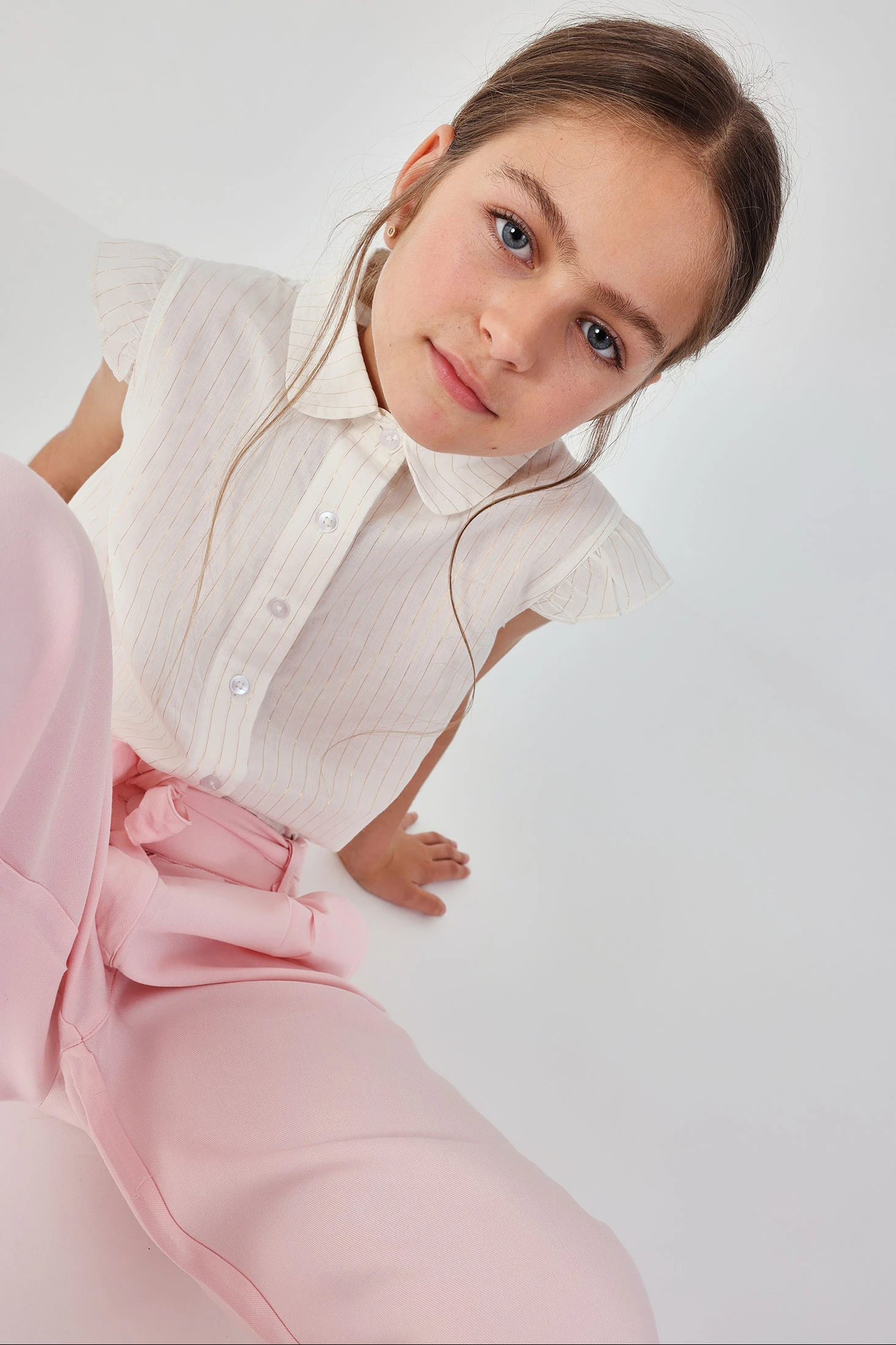 Mädchenhemd in Weiß mit feinem Streifenstoff in Goldton, der Textur und ein subtiles glänzendes Detail verleiht. Kurze Ärmel mit Volantabschluss an den Schultern, der einen femininen Touch und Bewegungsfreiheit bietet. Klassischer Hemdkragen und Knopfleiste vorne. Elastischer Saum für eine bequeme und körpernahe Passform, die verhindert, dass das Kleidungsstück bei Bewegung verrutscht. Ideal zu kombinieren mit Röcken, Shorts oder Hosen, sowohl für den Alltag als auch für besondere Anlässe.